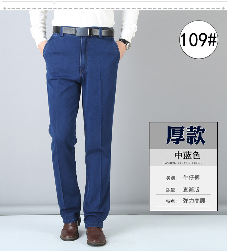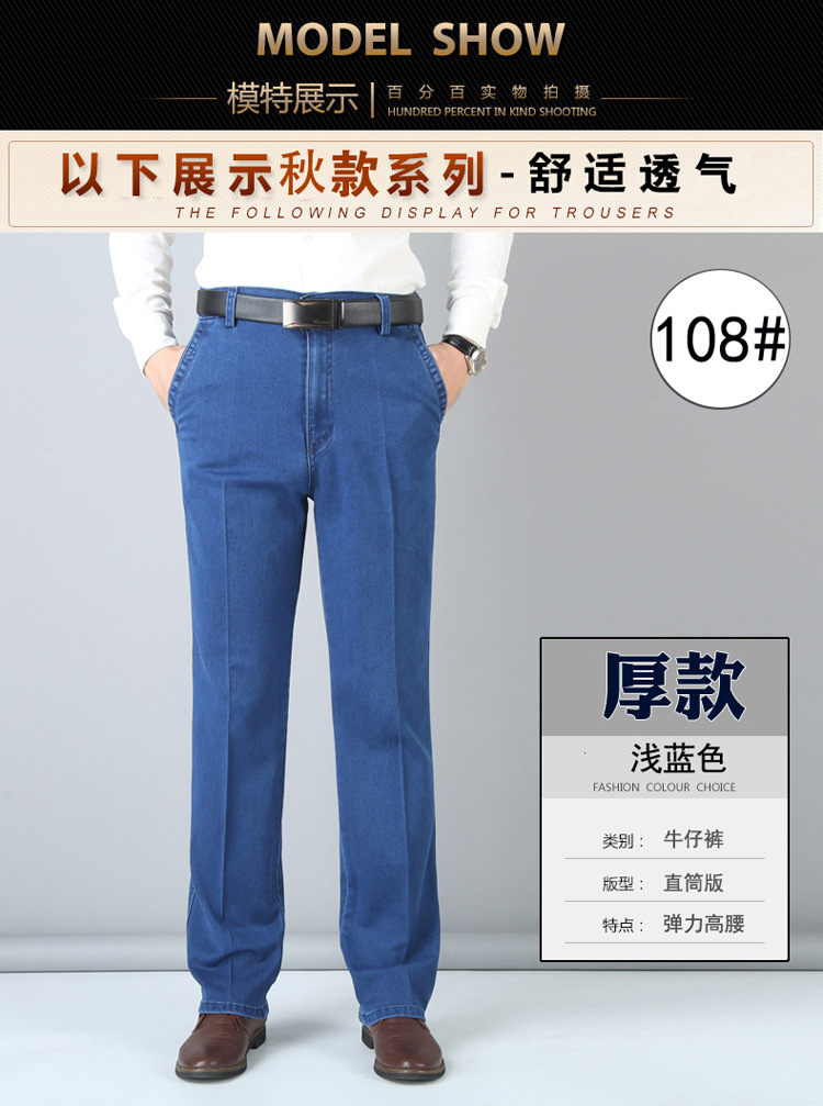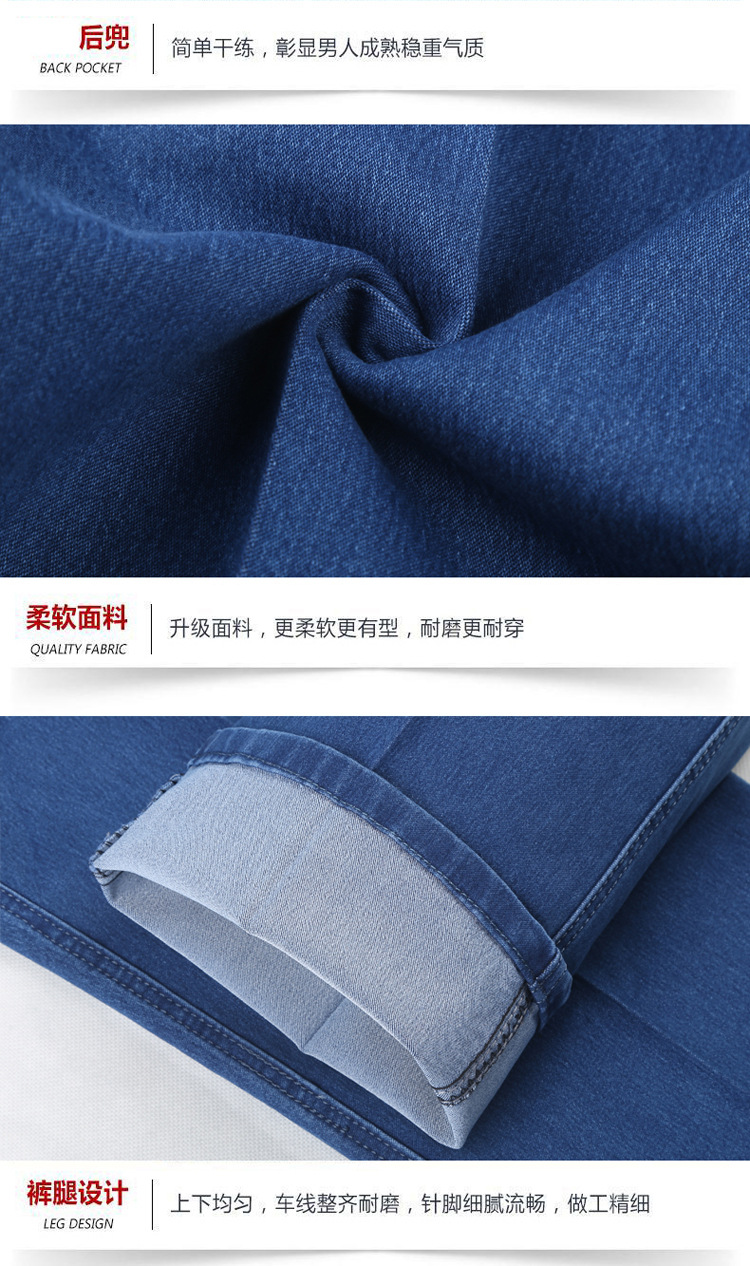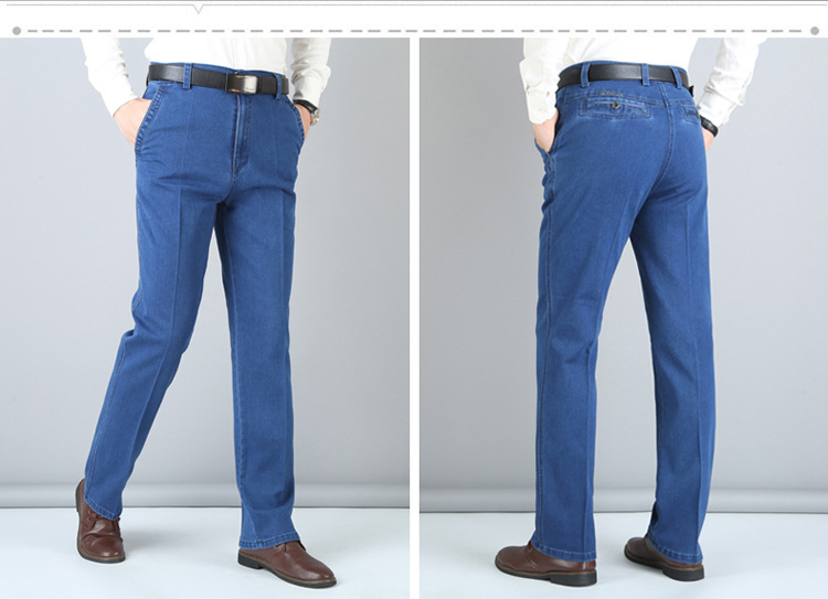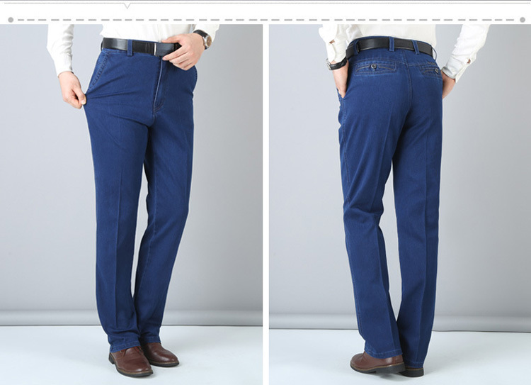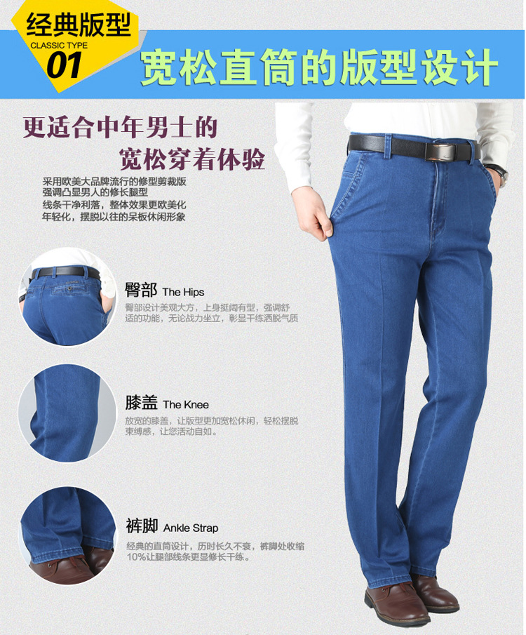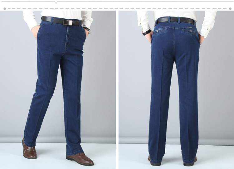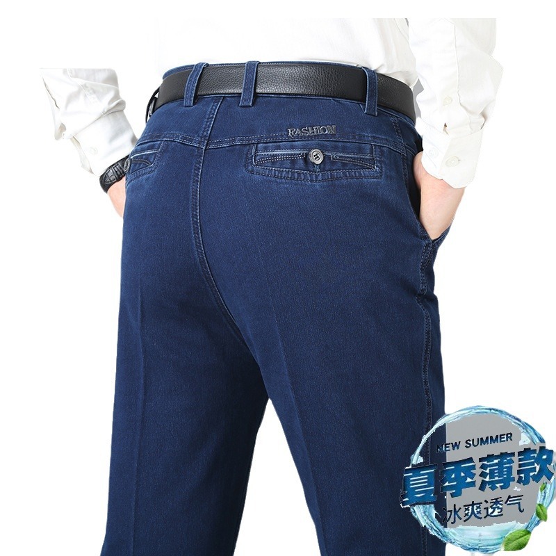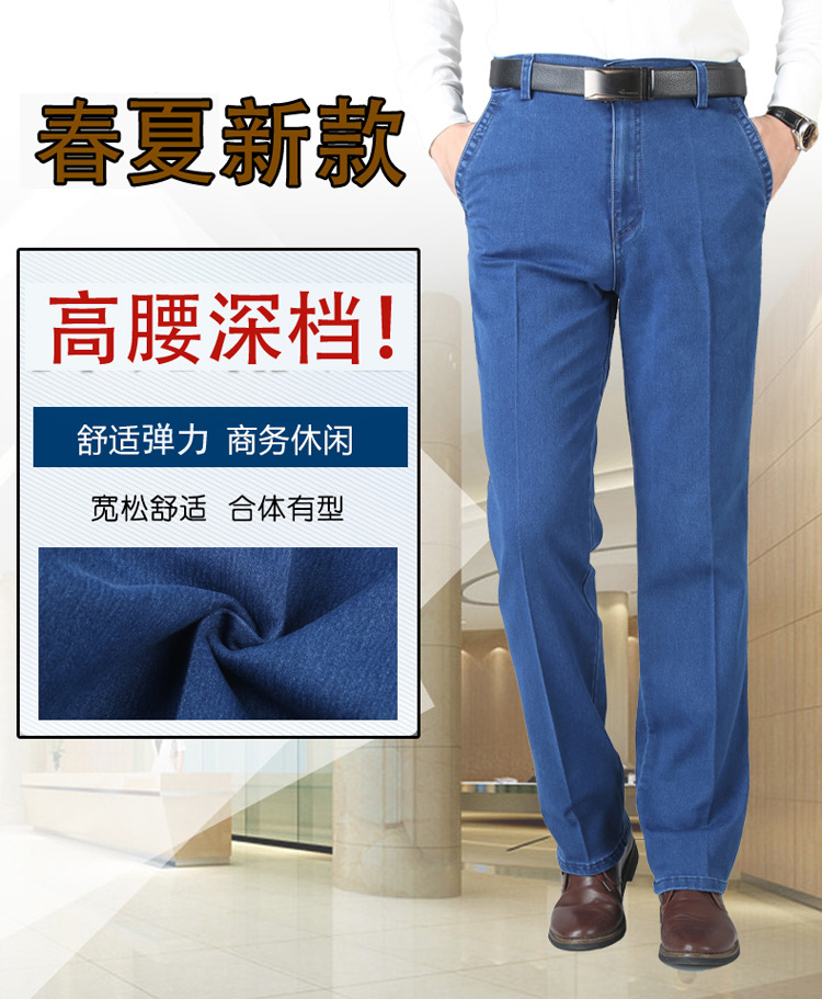여름용 얇은 중년 남성용 데님 팬츠, 하이웨이스트, 깊은 허리밴드, 루즈핏, 스트레이트, 고탄성, 남성 캐주얼 롱 팬츠