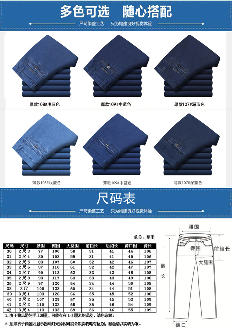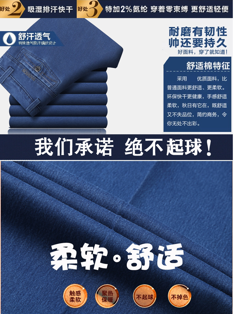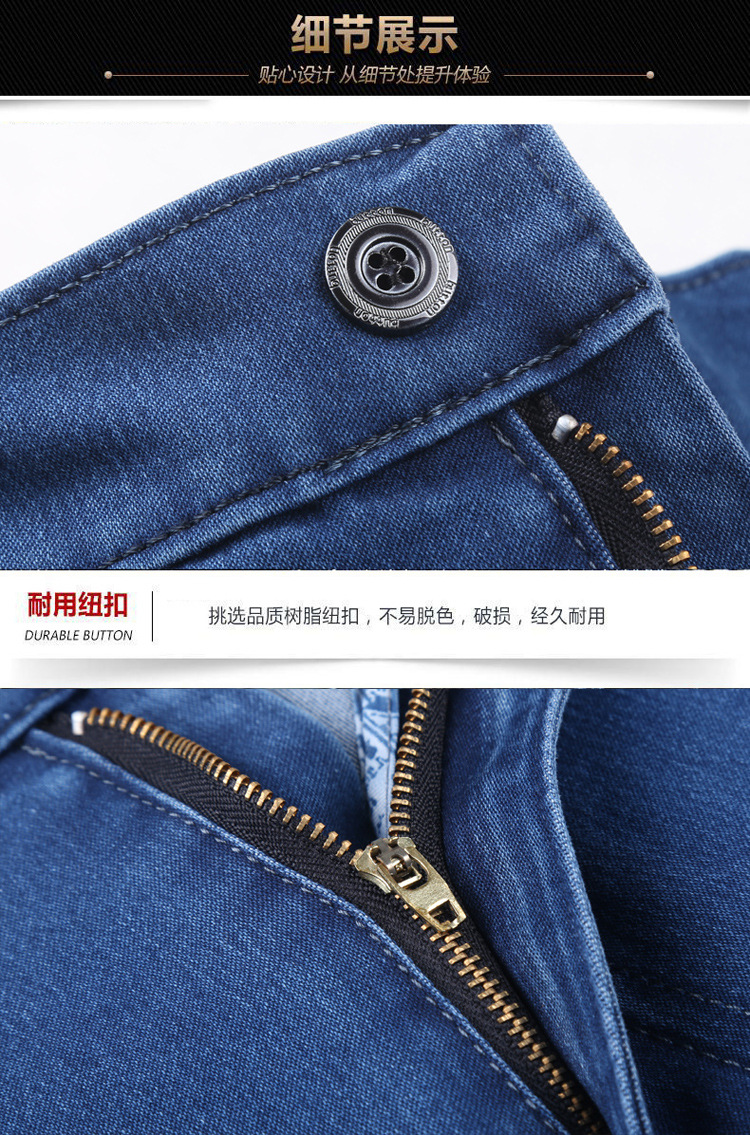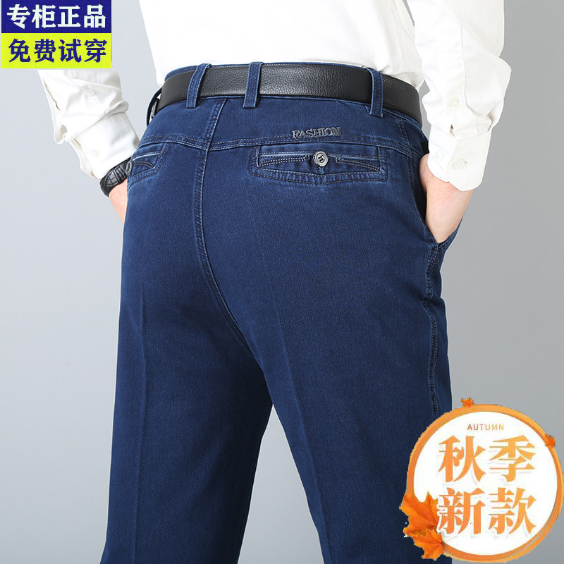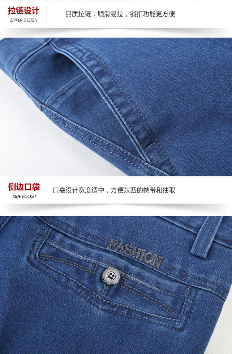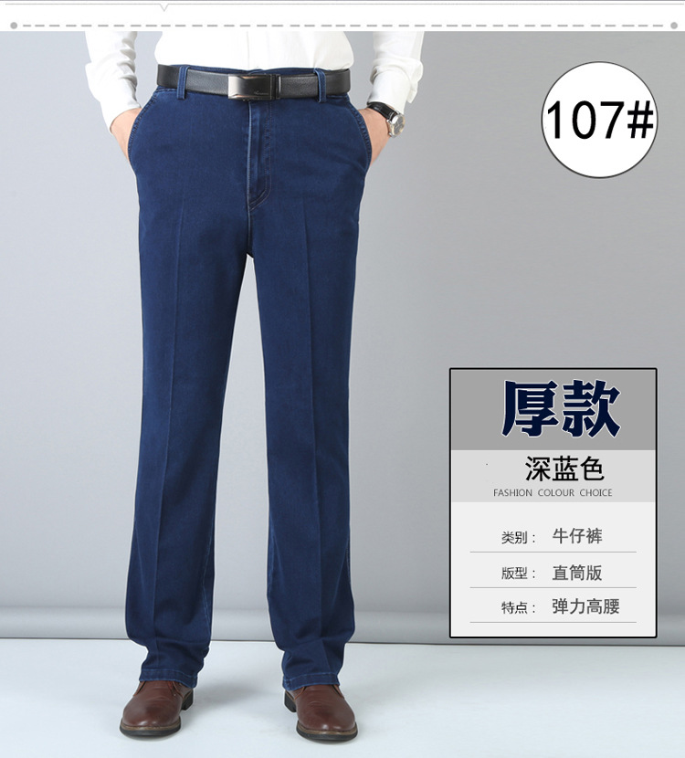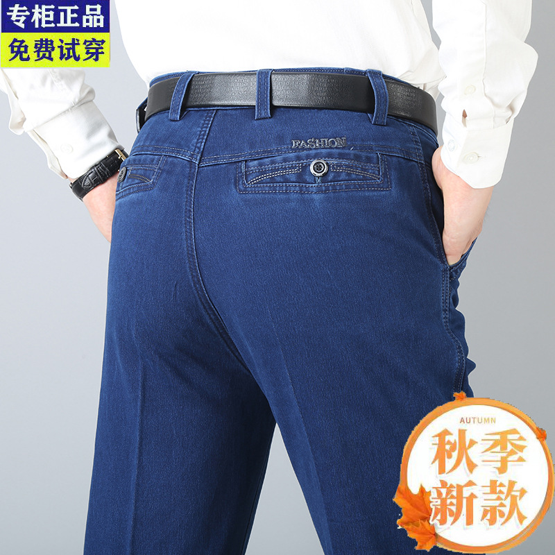 여름용 얇은 중년 남성용 데님 팬츠, 하이웨이스트, 깊은 허리밴드, 루즈핏, 스트레이트, 고탄성, 남성 캐주얼 롱 팬츠