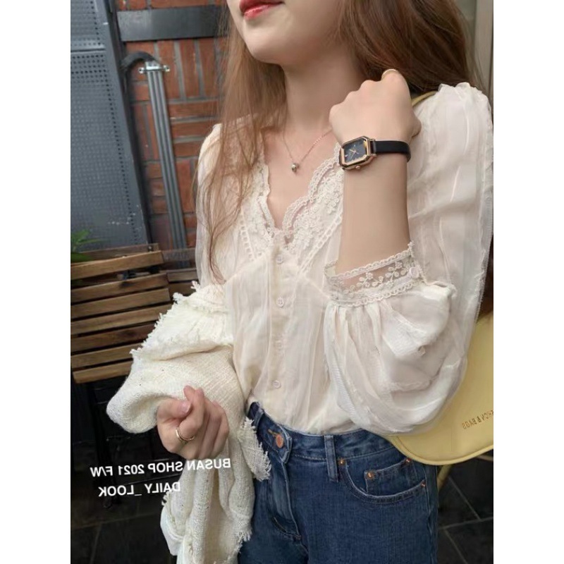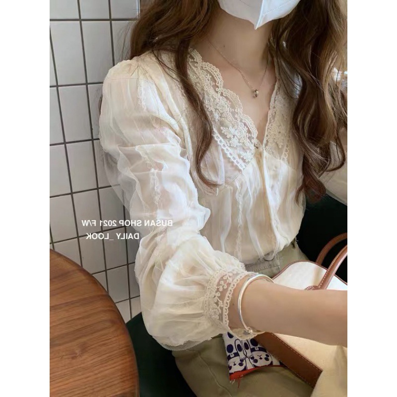한국 동대문 V넥 레이스 쉬폰 셔츠 여성 상의 2026 봄 가을 신상 디자인 프렌치 스타일 셔츠