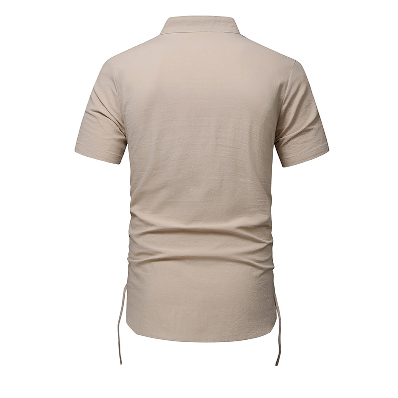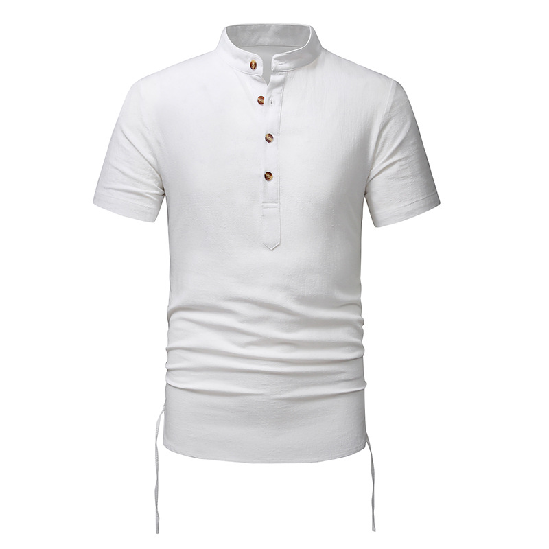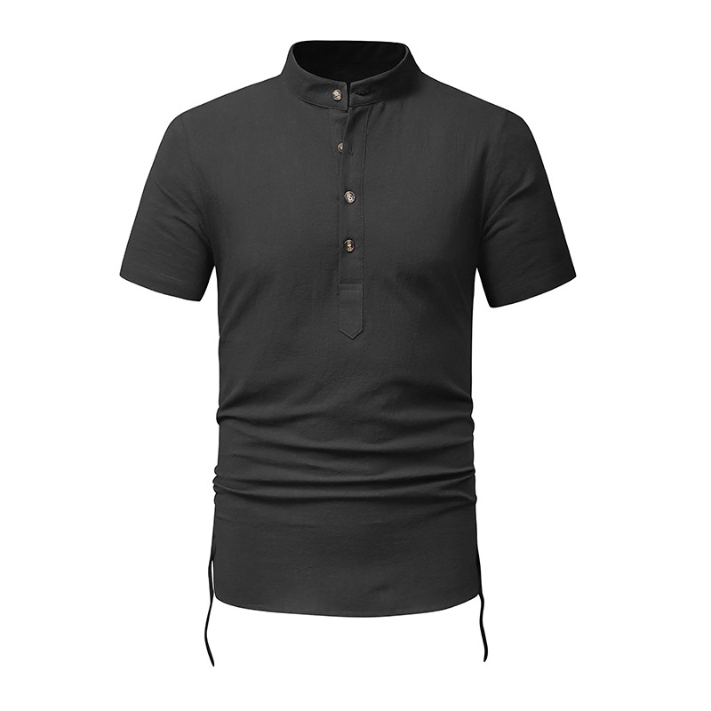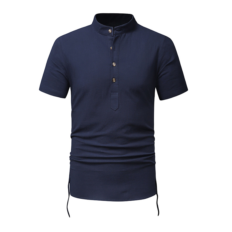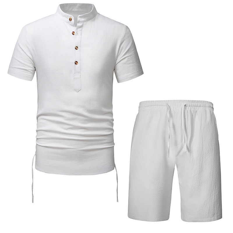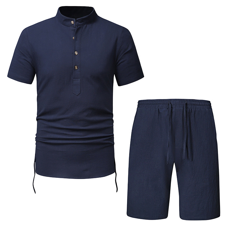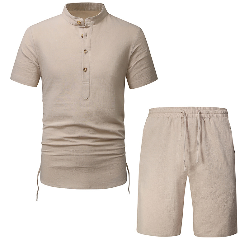 2023 여름 대외 무역 새로운 남성 면직물 및 린넨 헨리 칼라 비치 세트 유럽 사이즈 남성 캐주얼 단색 반팔 세트