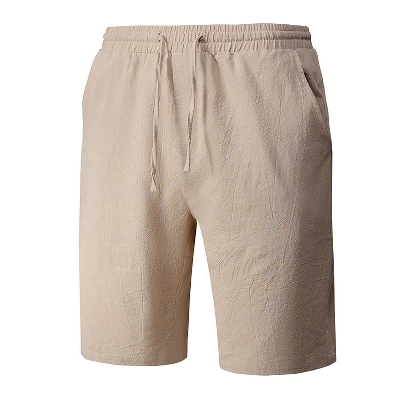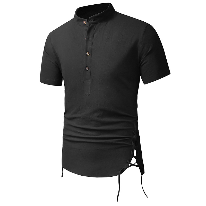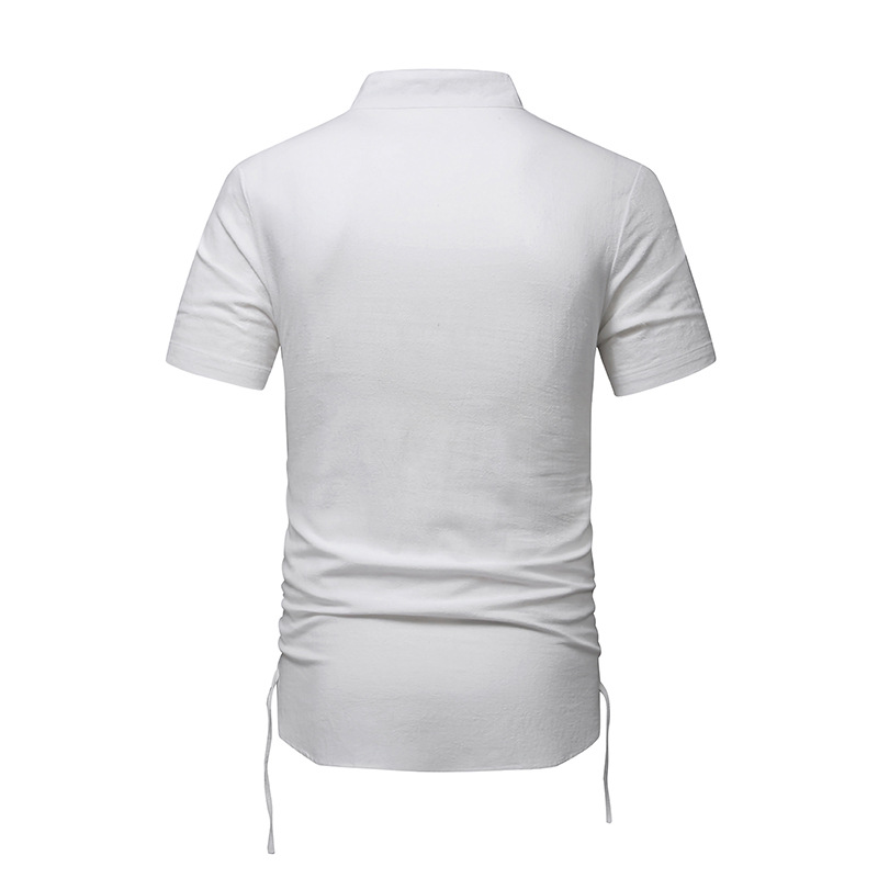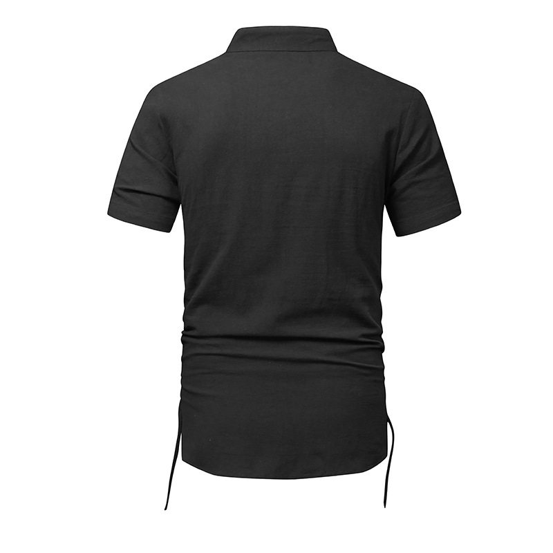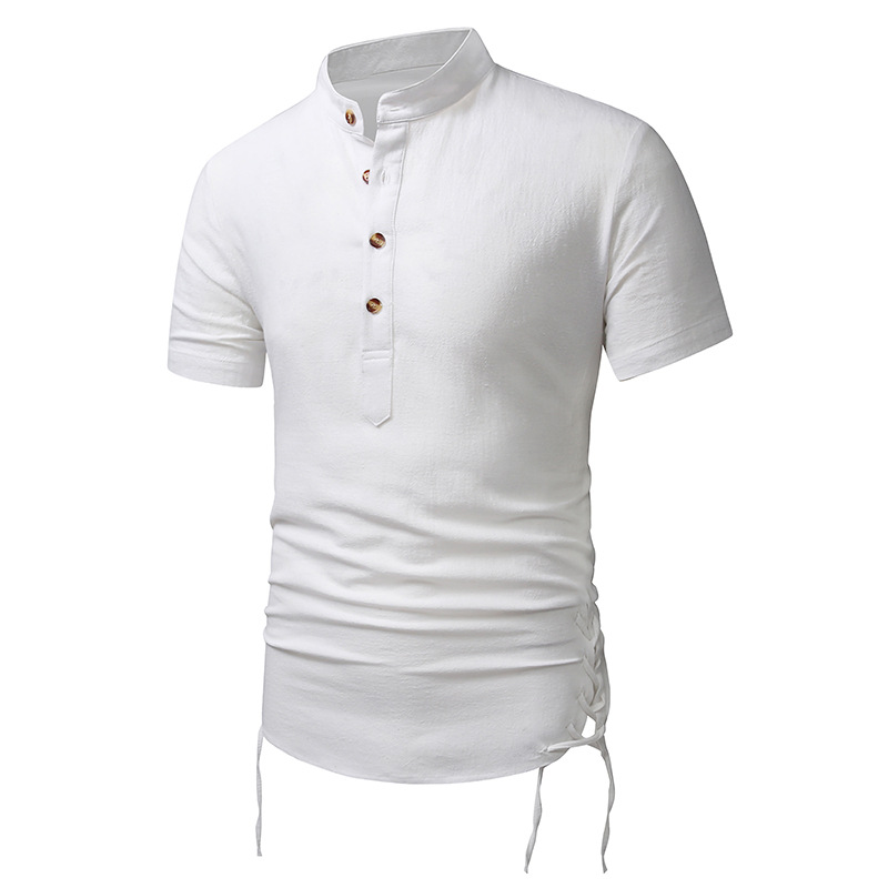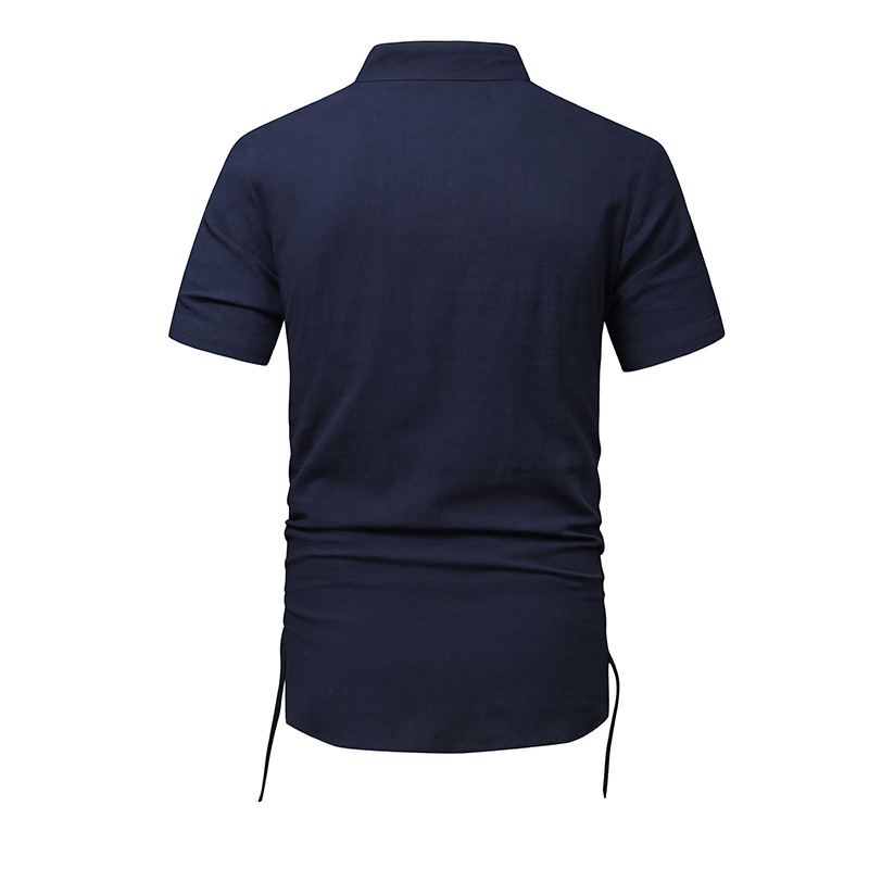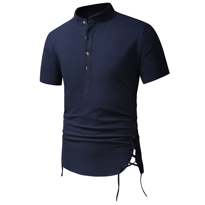 2023 여름 대외 무역 새로운 남성 면직물 및 린넨 헨리 칼라 비치 세트 유럽 사이즈 남성 캐주얼 단색 반팔 세트