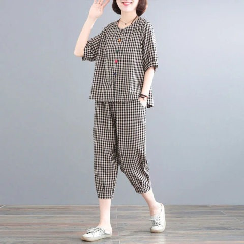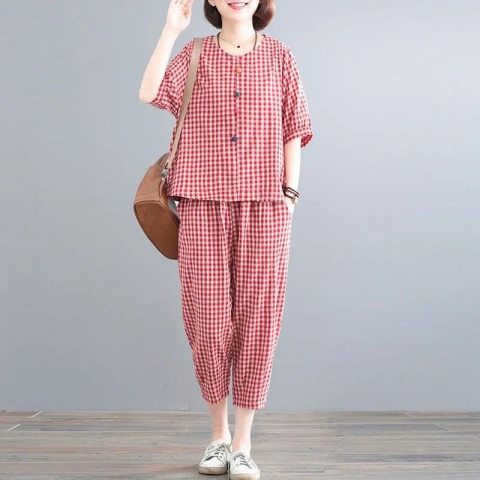 2023 패션 새로운 느슨한 플러스 사이즈 여성의 복고풍 투피스 우아한 여성의 캐주얼 격자 무늬 세트 여성의 여름