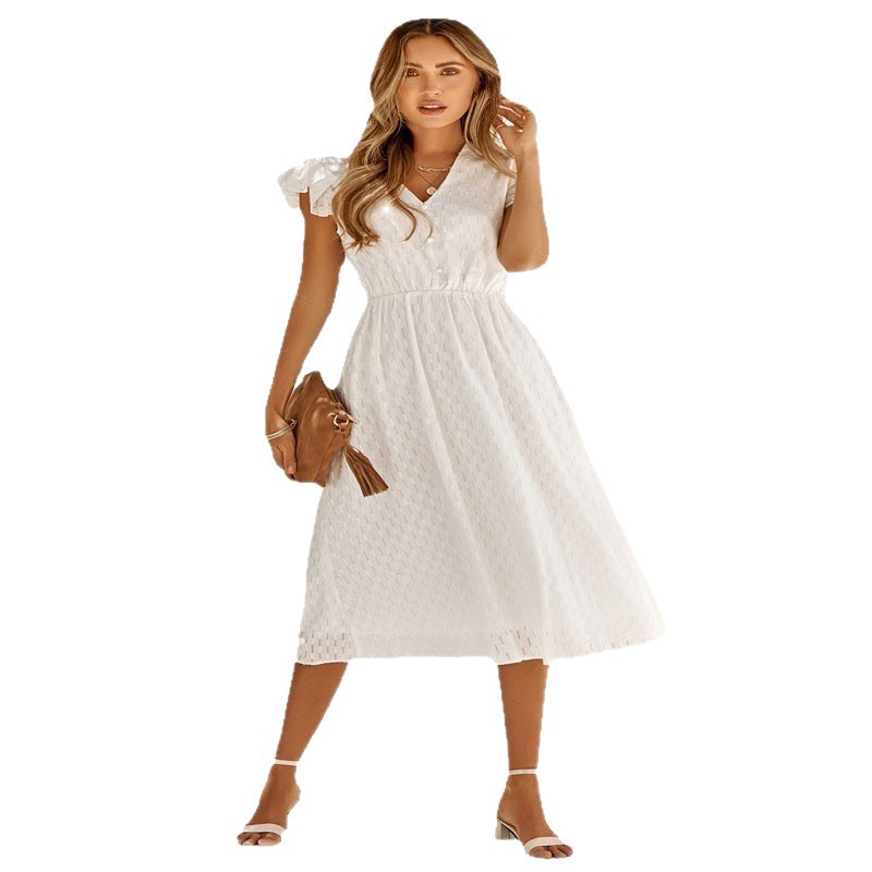새로운 유럽 및 미국 아마존 여름 독립 사이트 캐주얼 여성 의류 유럽 및 미국 스타일 단색 V넥 허리라인을 강조한 산뜻한 스타일의 원피스