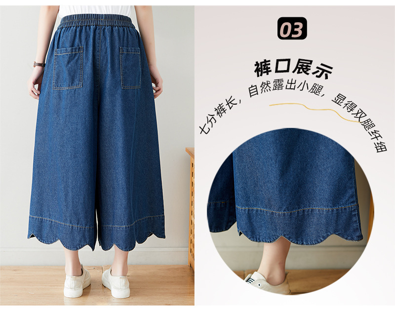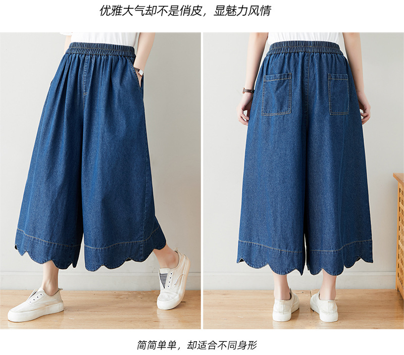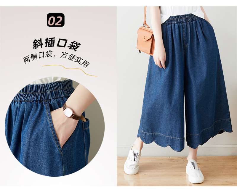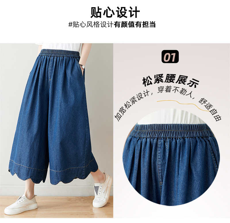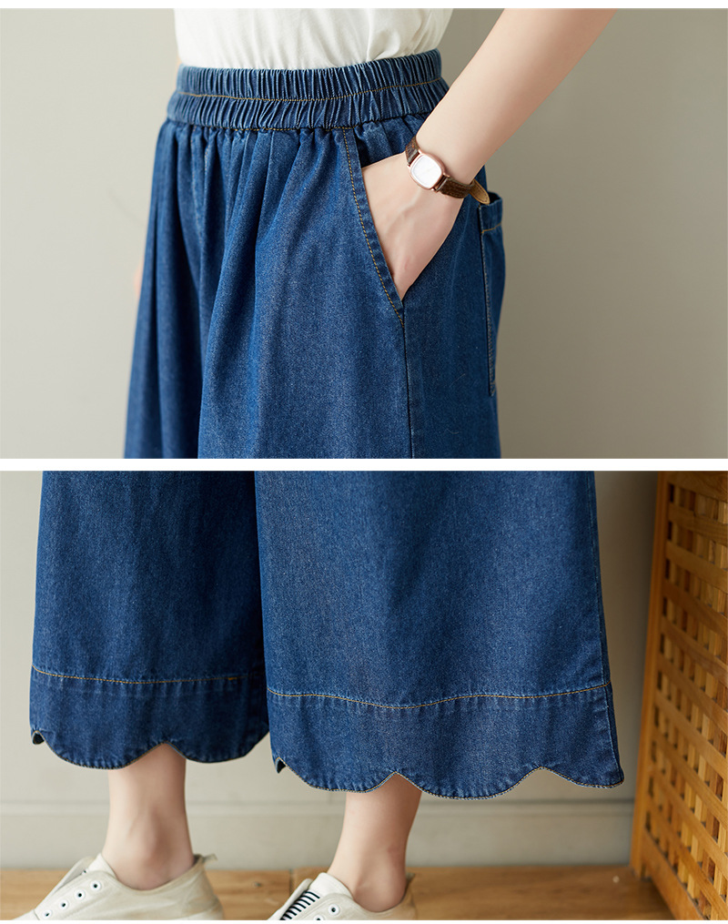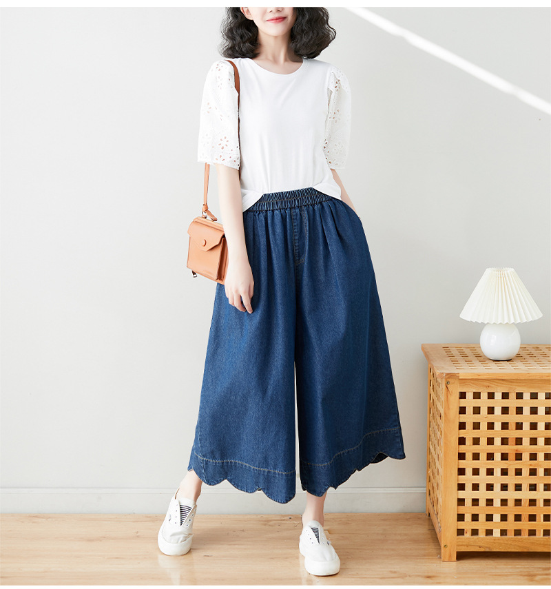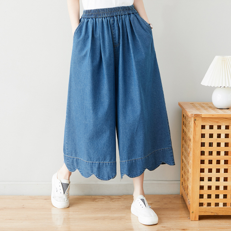 2023 여름 신상품 스트레치 허리 바지 단색 슬리밍 웨스턴 스타일 웨이브 레이스 카프리 바지 여성용 와이드 레그 진