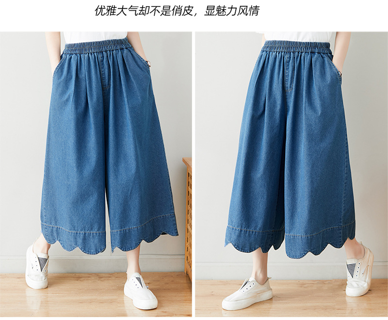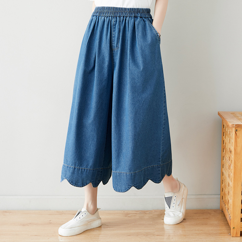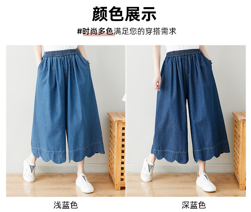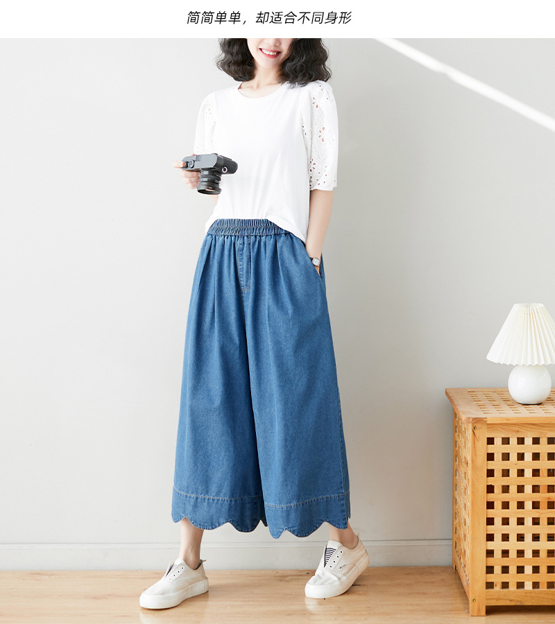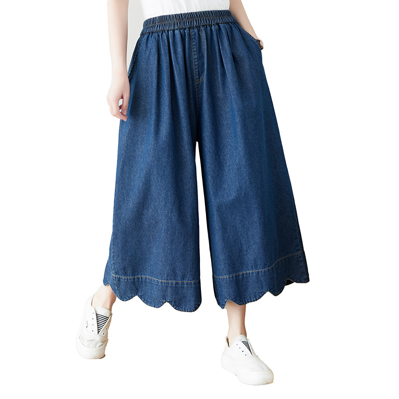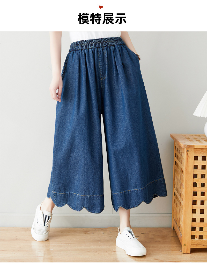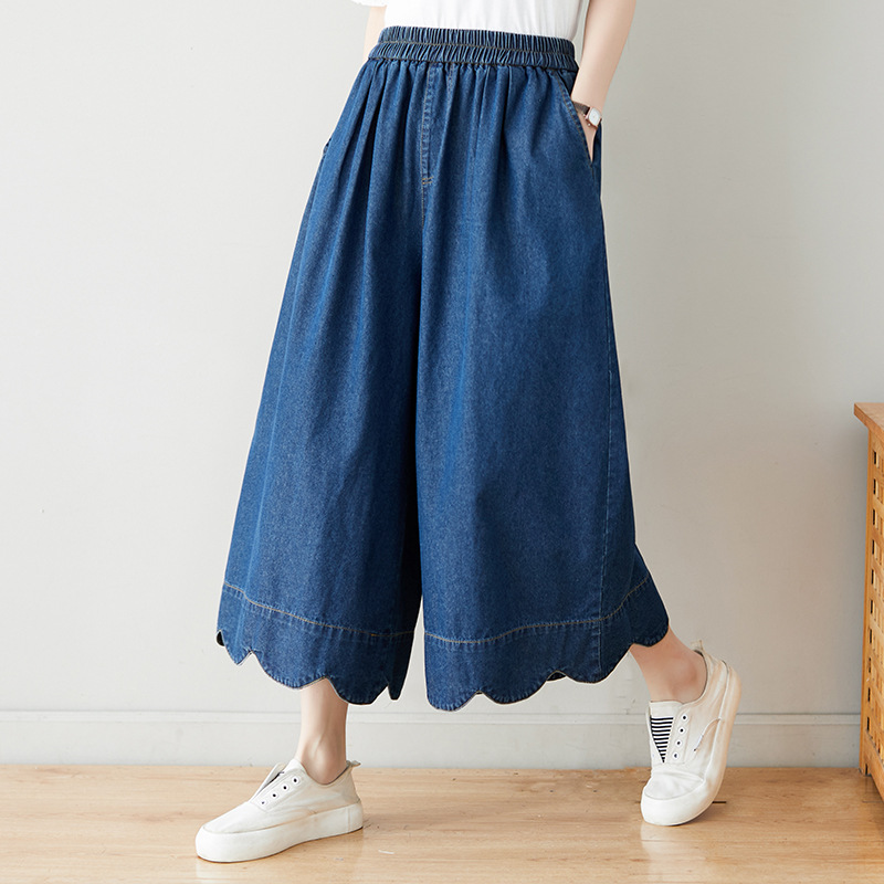 2023 여름 신상품 스트레치 허리 바지 단색 슬리밍 웨스턴 스타일 웨이브 레이스 카프리 바지 여성용 와이드 레그 진