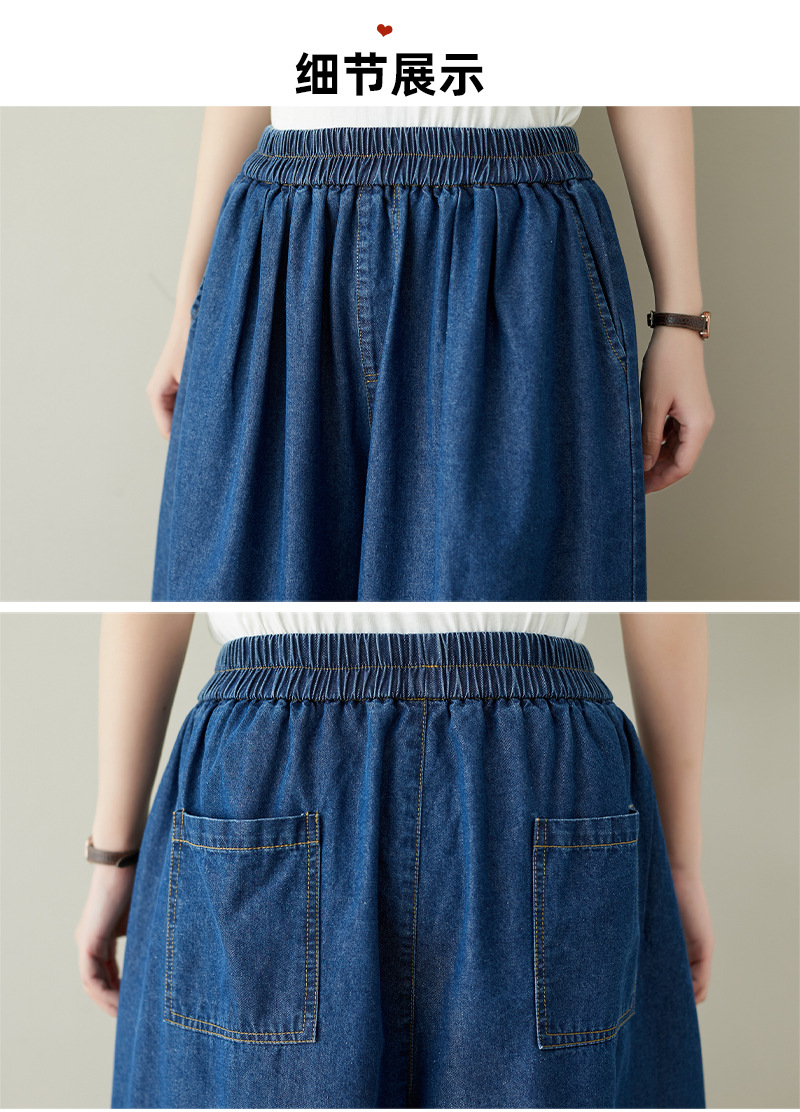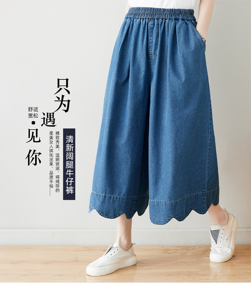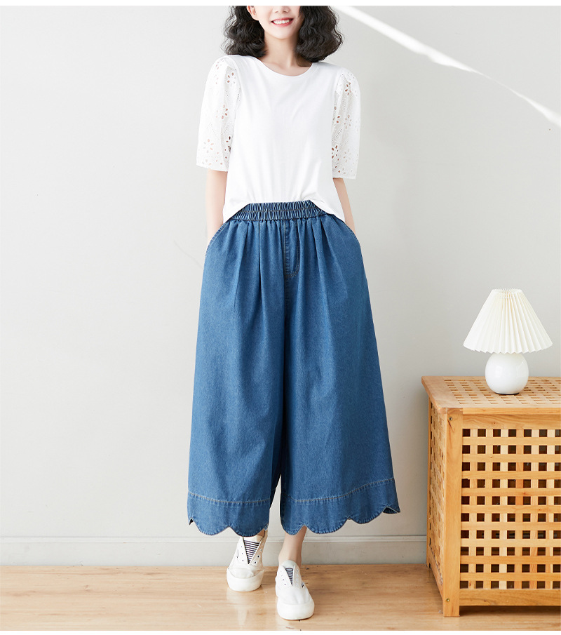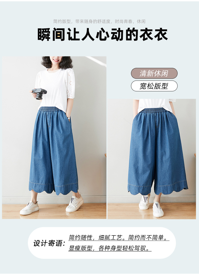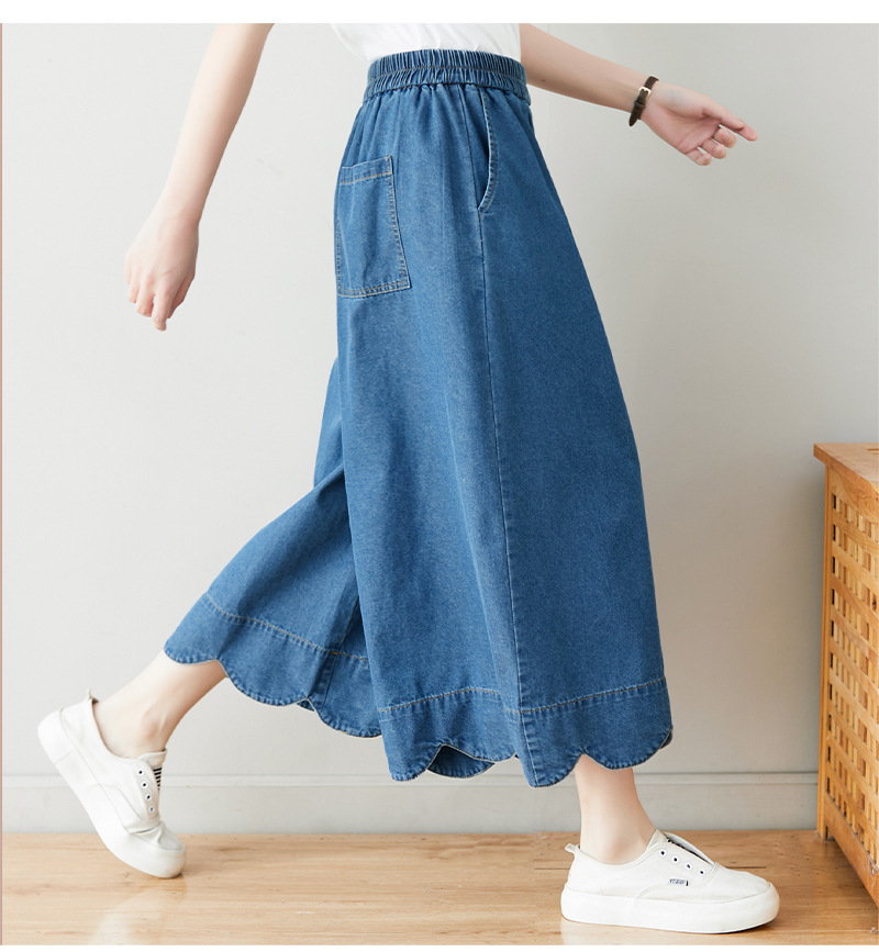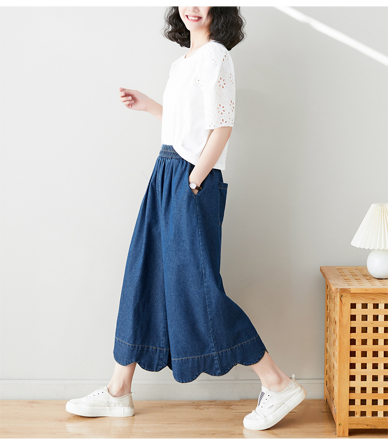 2023 여름 신상품 스트레치 허리 바지 단색 슬리밍 웨스턴 스타일 웨이브 레이스 카프리 바지 여성용 와이드 레그 진