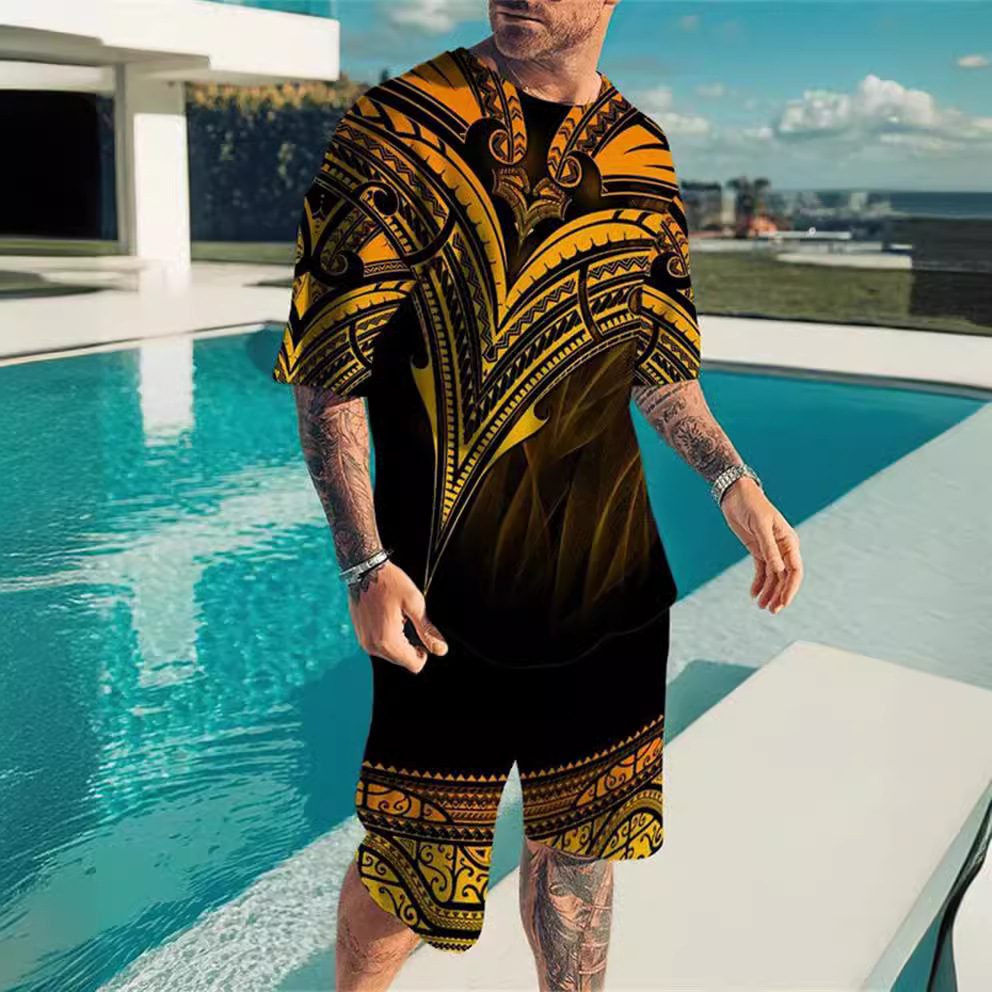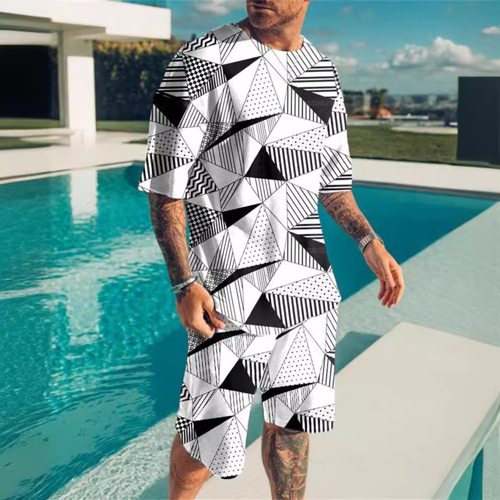 2023 AliExpress 여름 유럽과 미국 3D 남성 세트 디지털 인쇄 반팔 반바지 패션 스포츠 투피스 세트