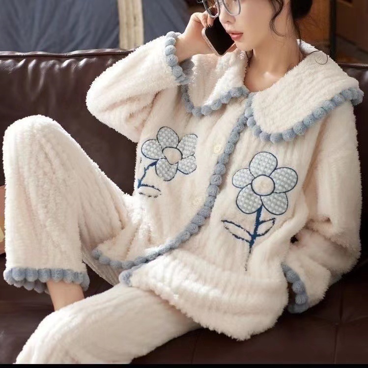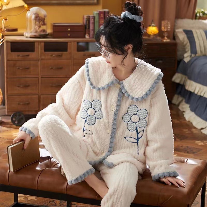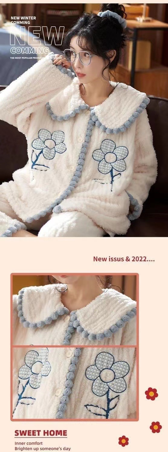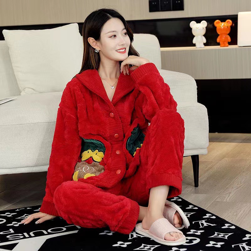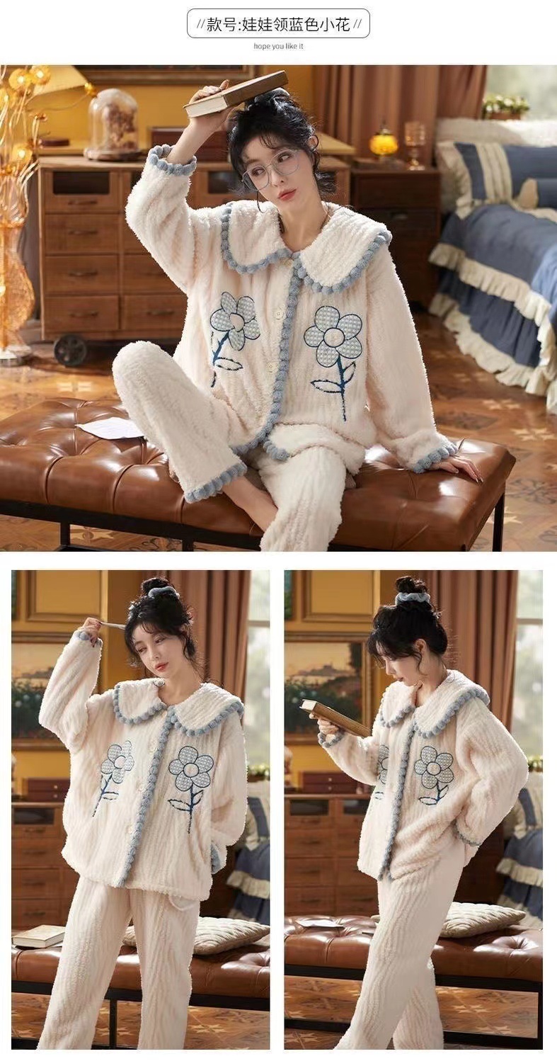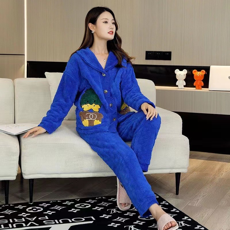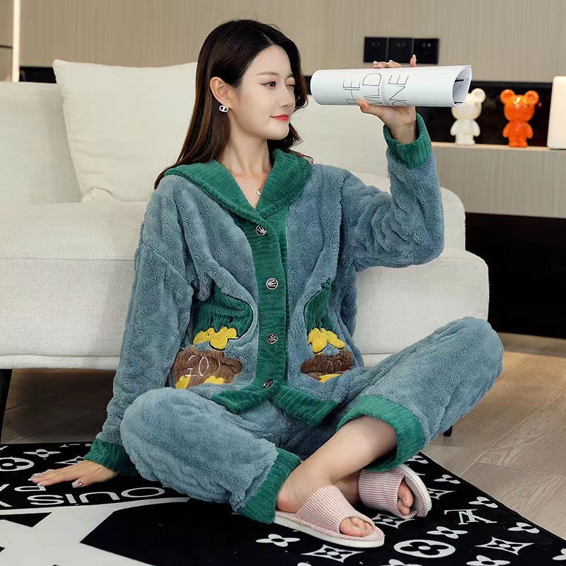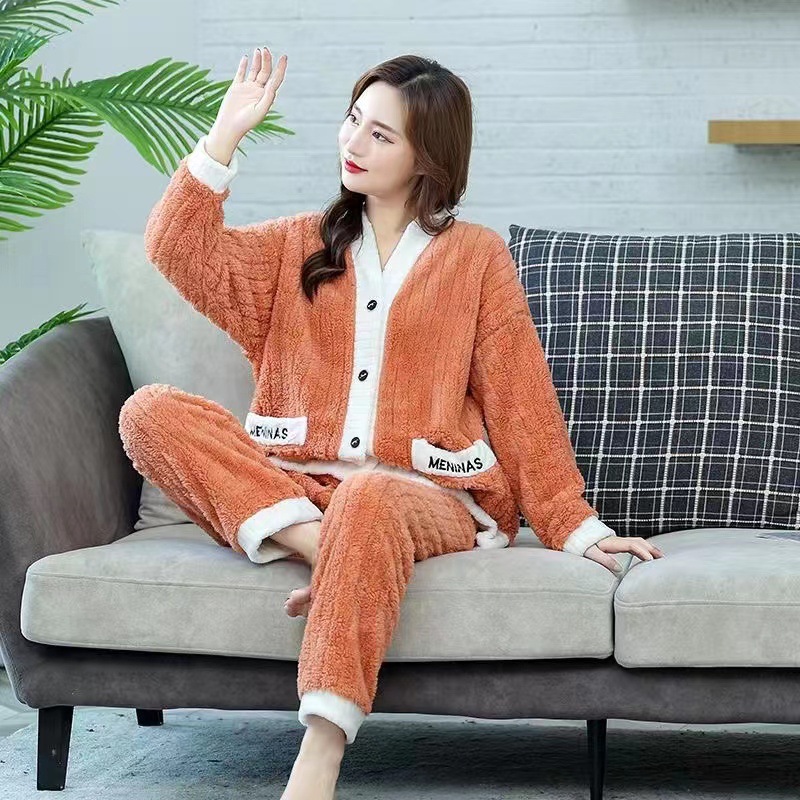 2023 새로운 산호 양털 잠옷 V-넥 가정 옷 세트 입고 봉제 따뜻한 잠옷 세트