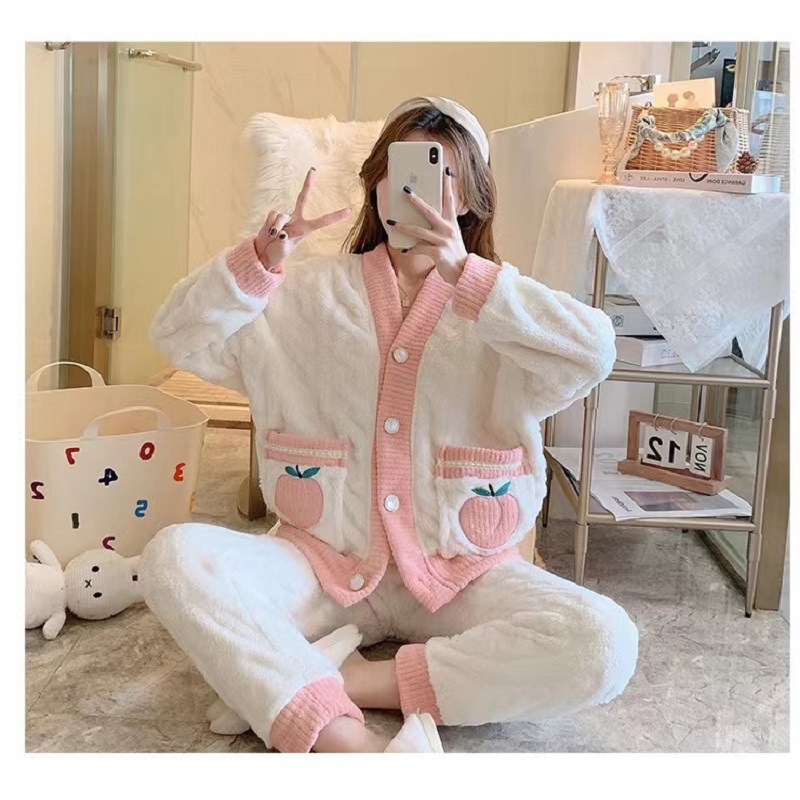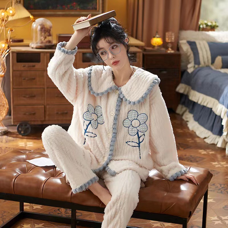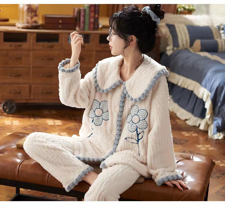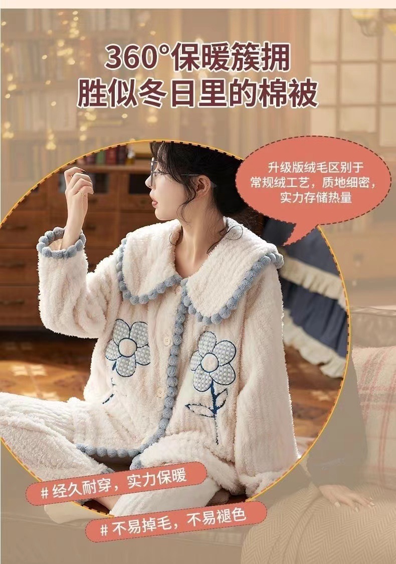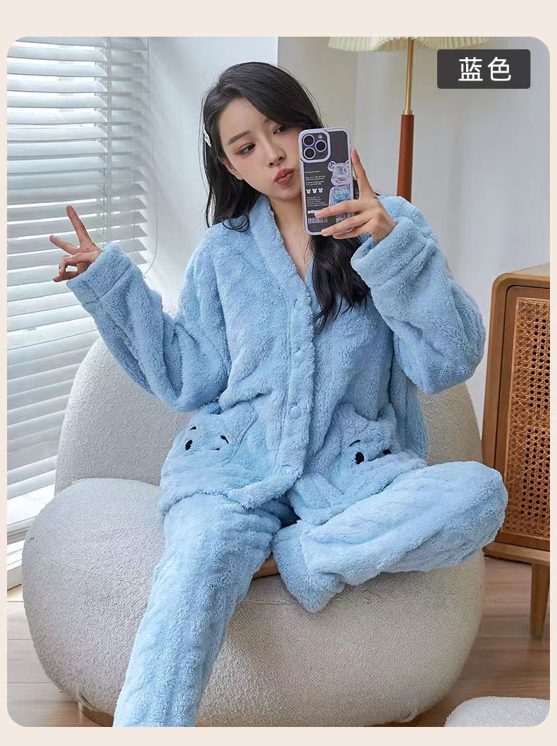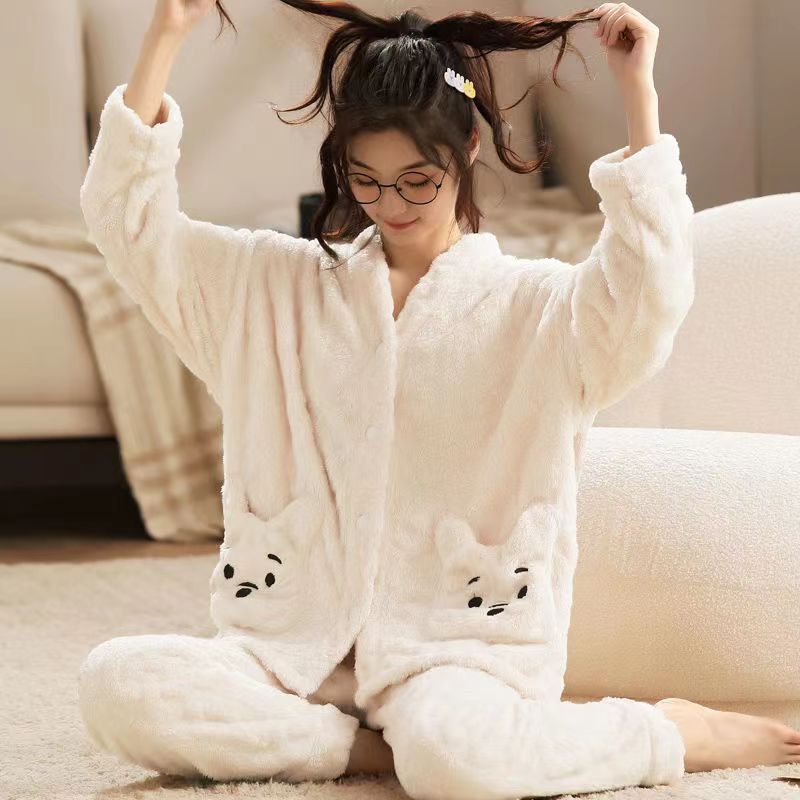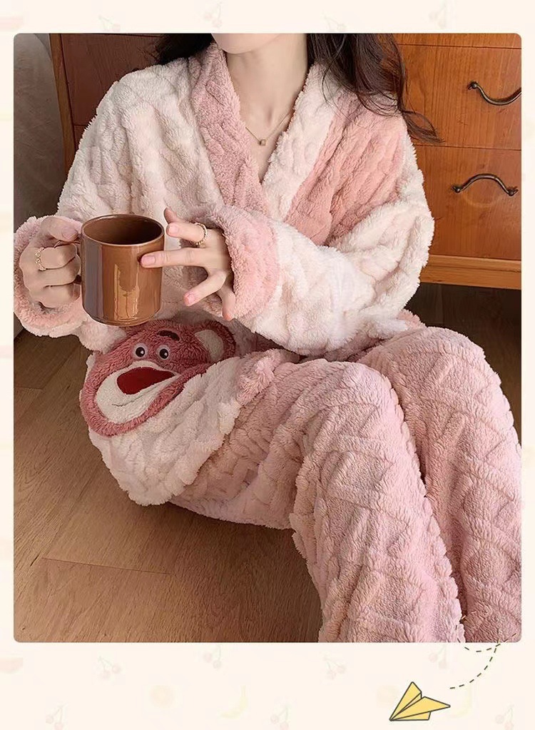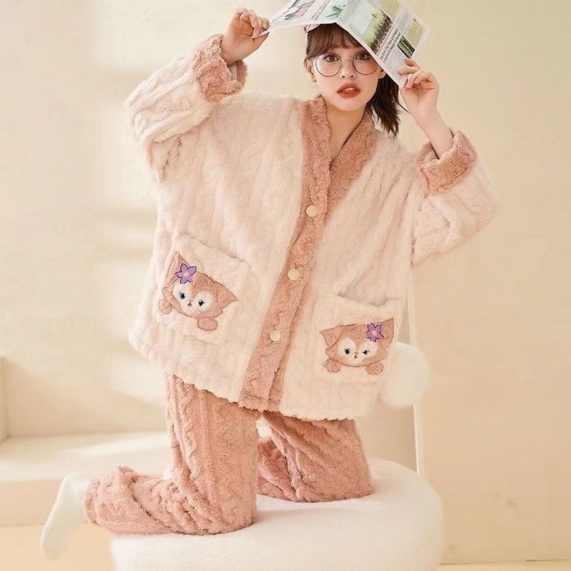 2023 새로운 산호 양털 잠옷 V-넥 가정 옷 세트 입고 봉제 따뜻한 잠옷 세트
