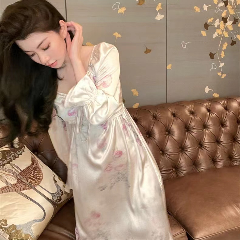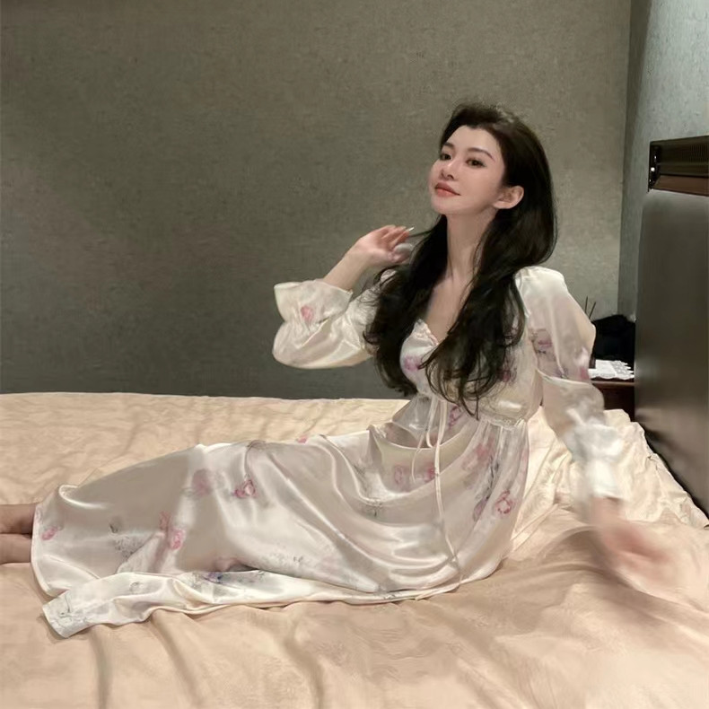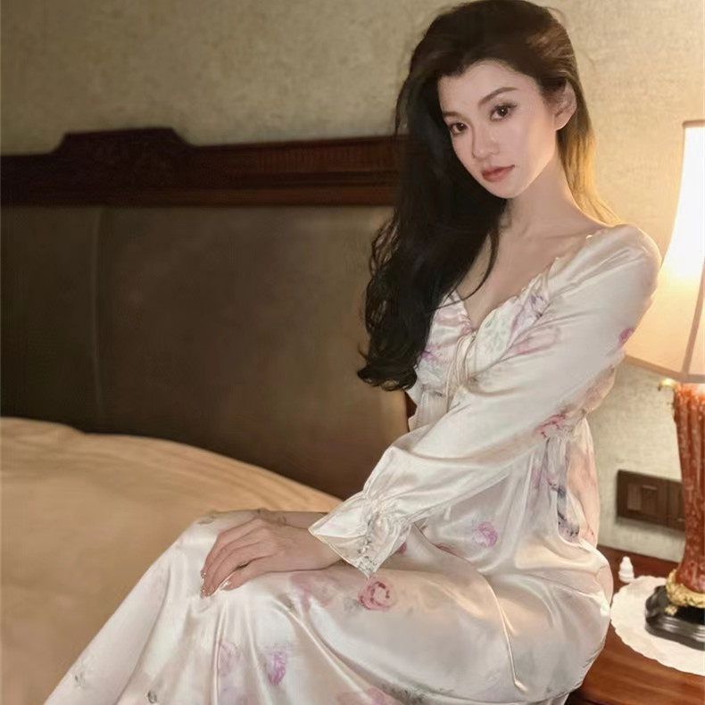 [장난 야뉴 스커트] 2023 새틴 아이스 실크 잉크 페인팅 브이넥 실크 국민풍 신중국 긴소매 잠옷 여성