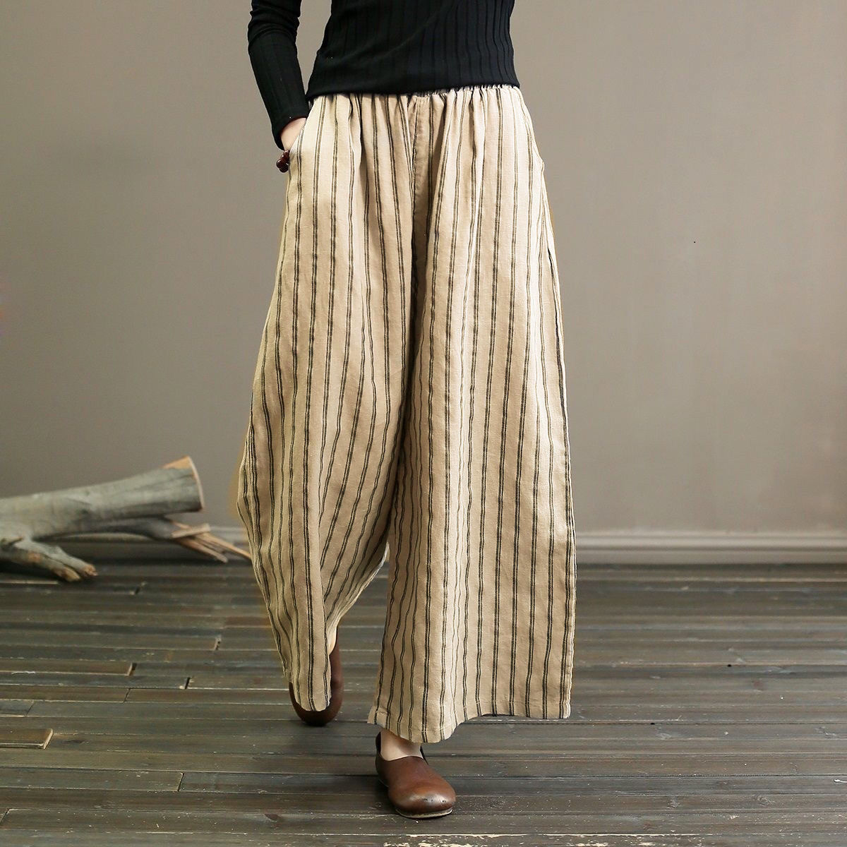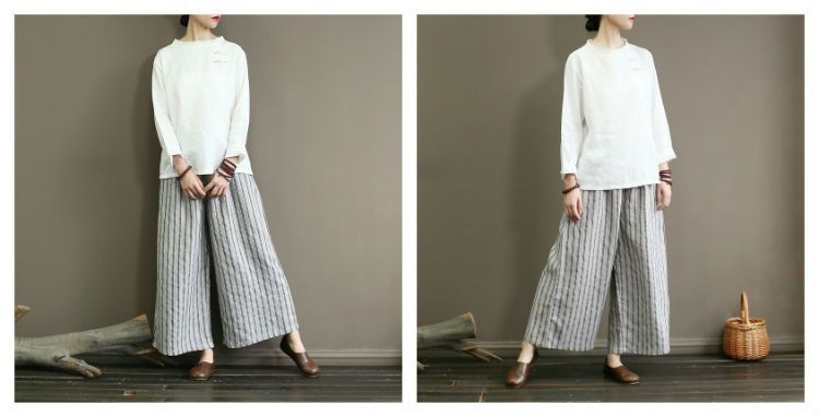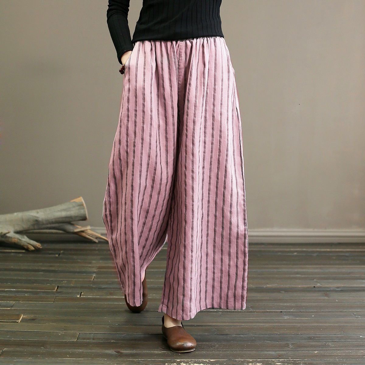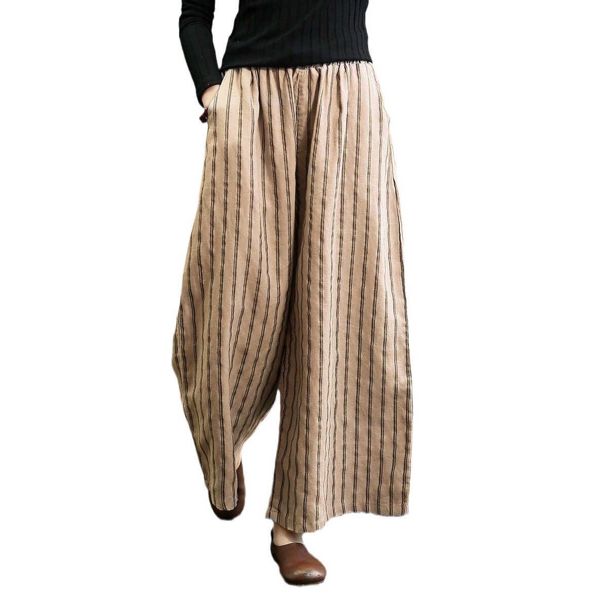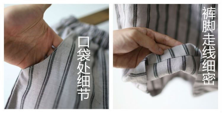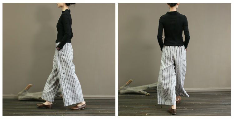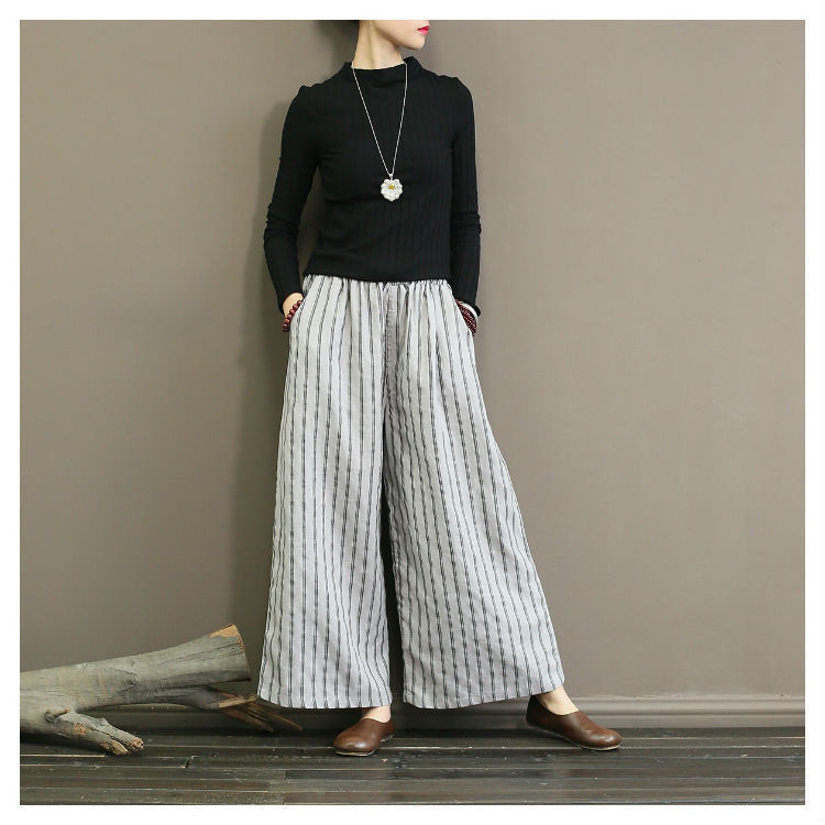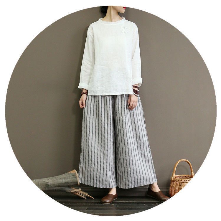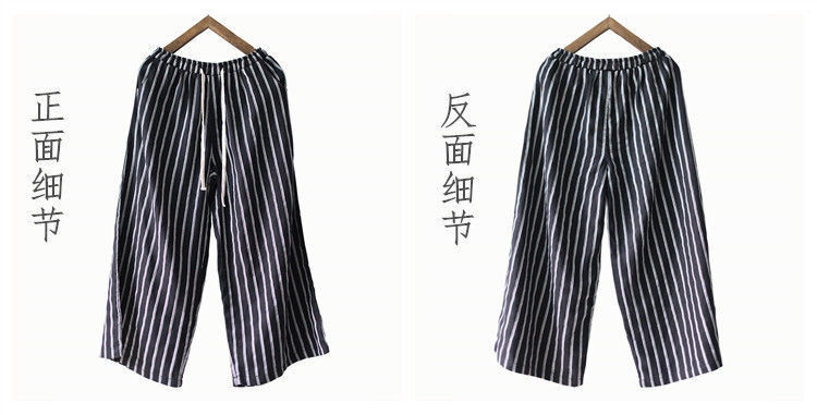 컷 라벨 남은 싱글 수출 일본 레트로 코튼 린넨 스트라이프 와이드 레그 팬츠 여성 슬림 SAG 캐주얼 스트레이트 팬츠 여름