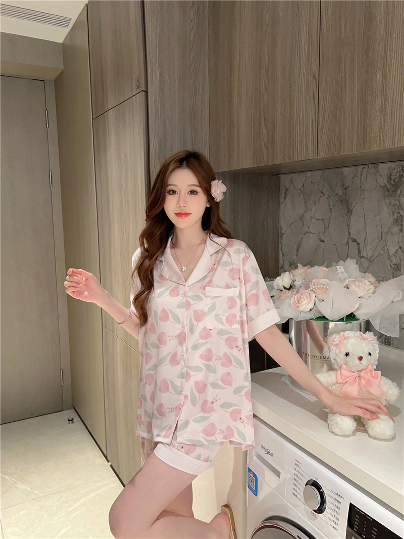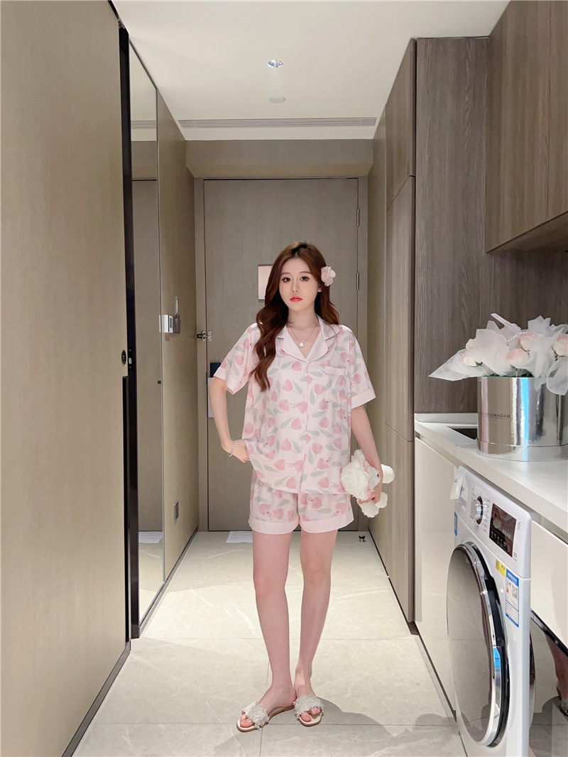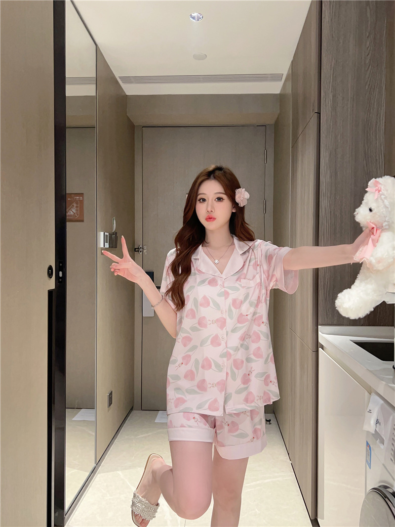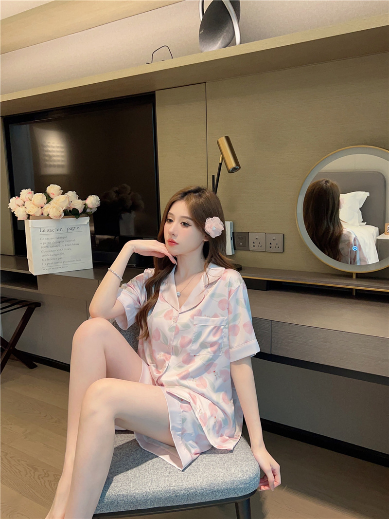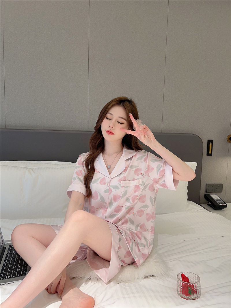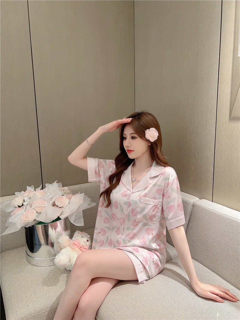 재고 여름 얼음 실크 프랑스 실크 잠옷 여자의 편안한 시원한 카디건 장미 토끼 반팔 반바지 가정 옷