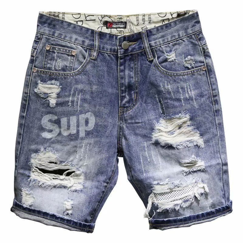 거지 찢어진 남성용 데님 반바지 트렌디 브랜드 맞춤형 프린트 패치 슬림핏 5 점 사이버 인기 Tiktok 트렌디 중간 길이 바지