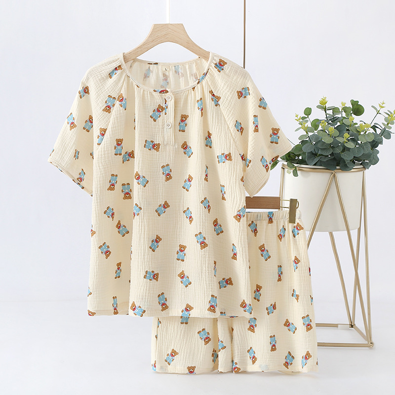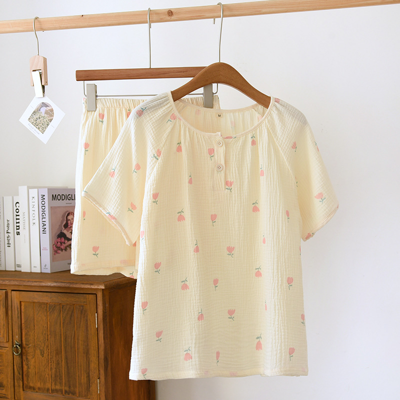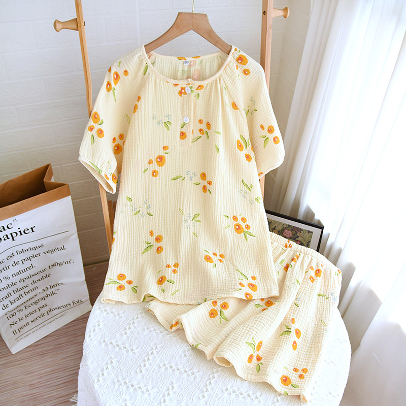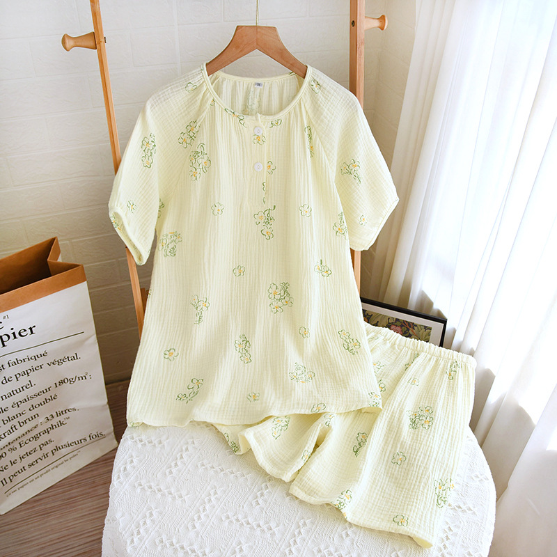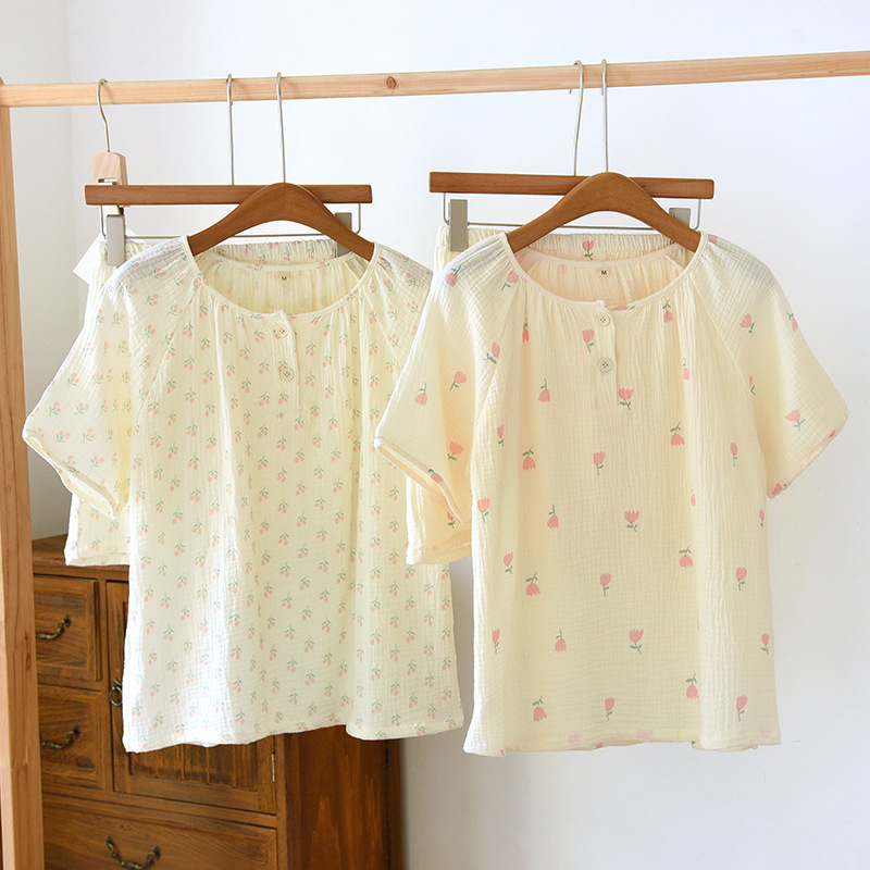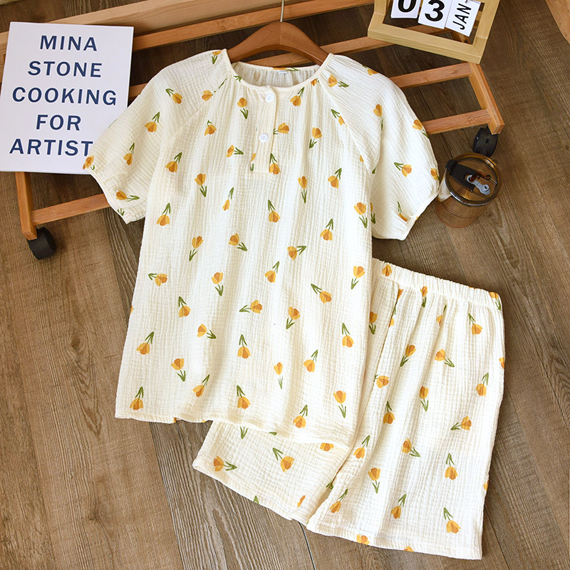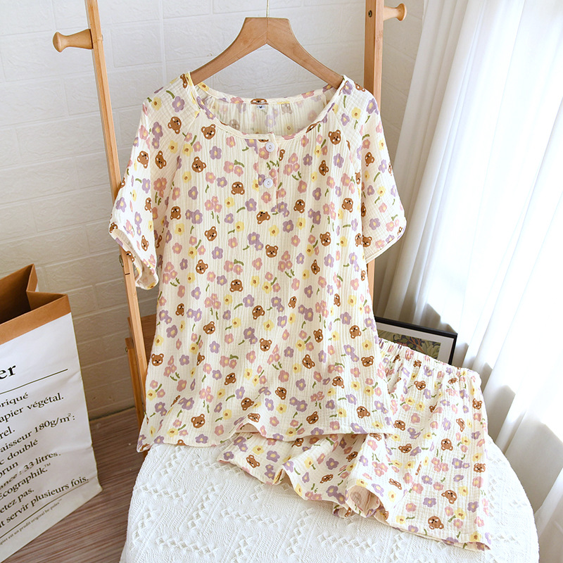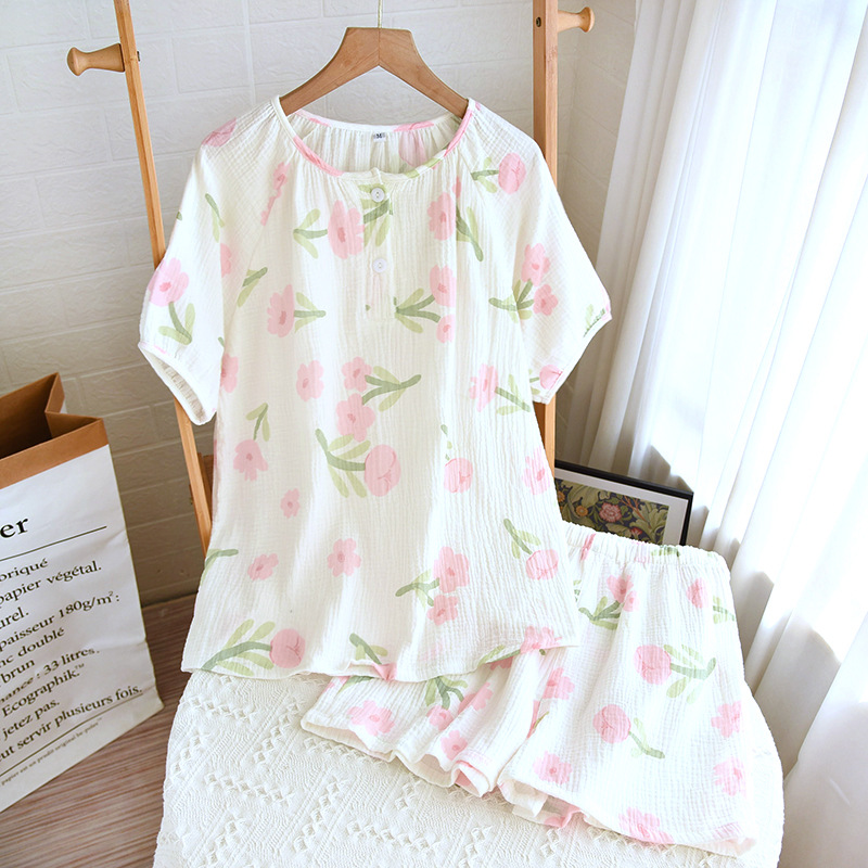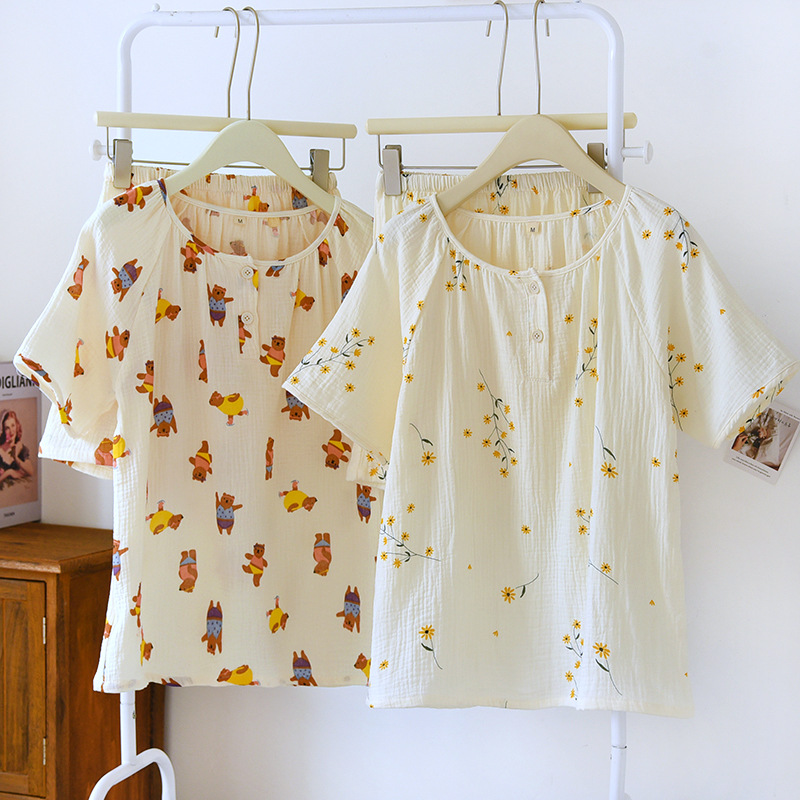 풀오버 잠옷 여자의 봄과 여름 면 크레이프 반팔 반바지 세트 한국 스타일 여자의 여름 더블 레이어 거즈 가정 옷