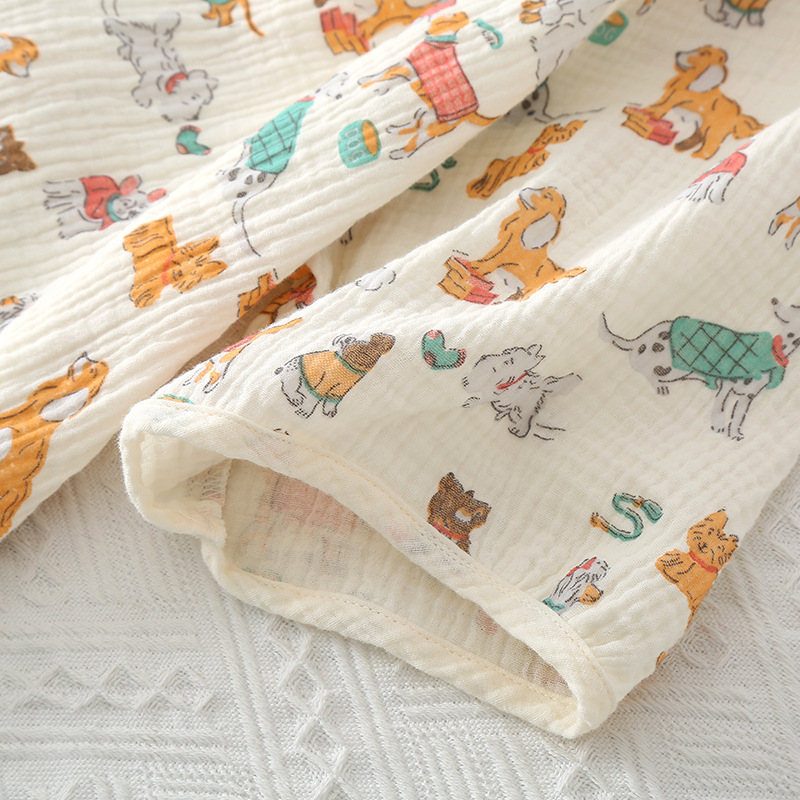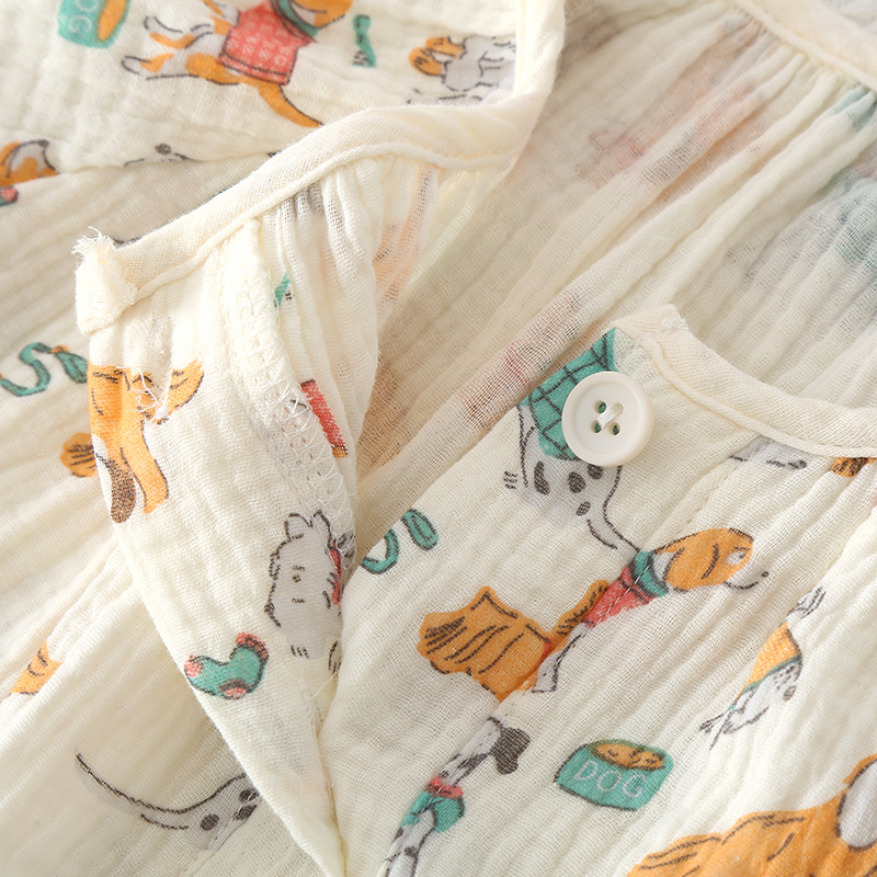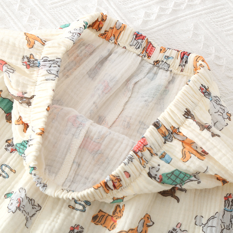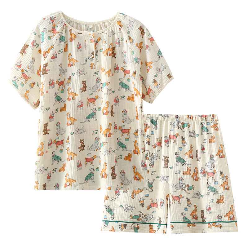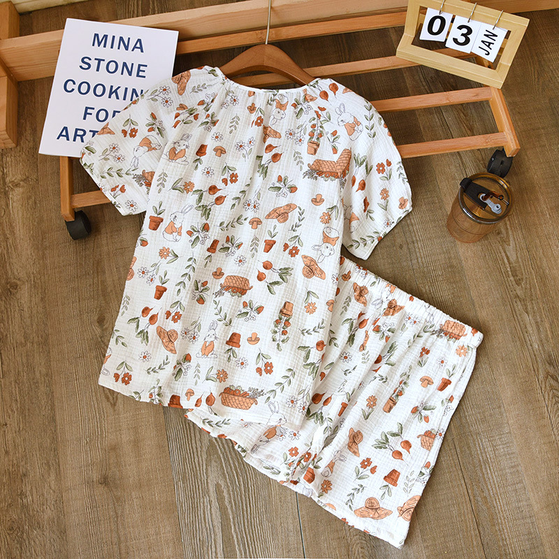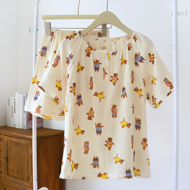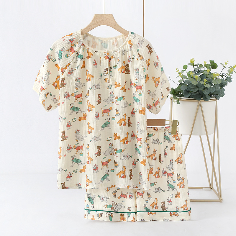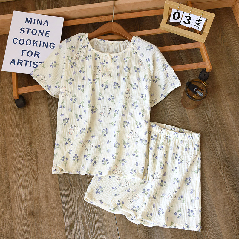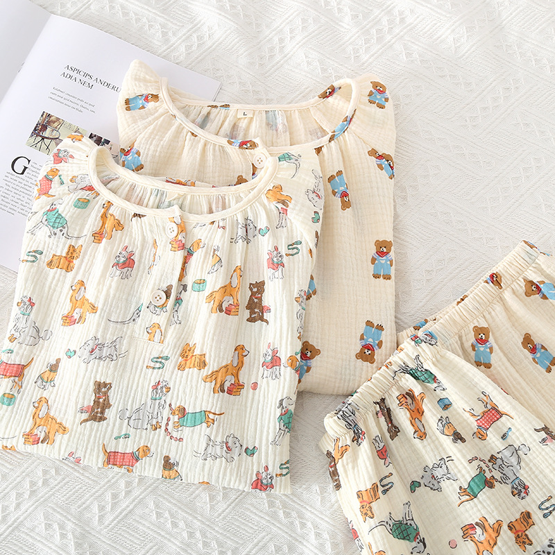 풀오버 잠옷 여자의 봄과 여름 면 크레이프 반팔 반바지 세트 한국 스타일 여자의 여름 더블 레이어 거즈 가정 옷