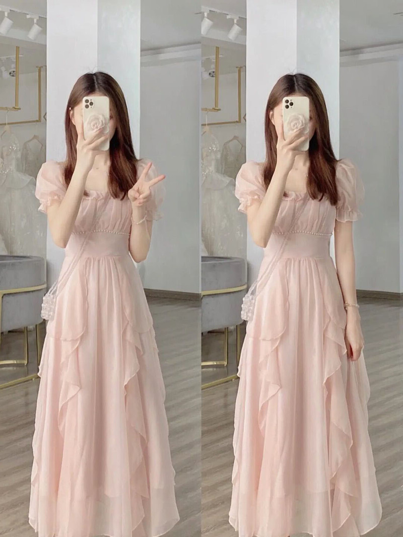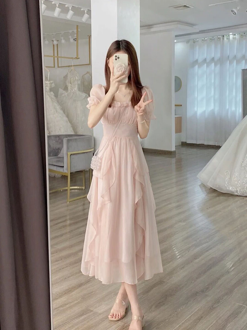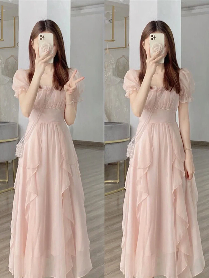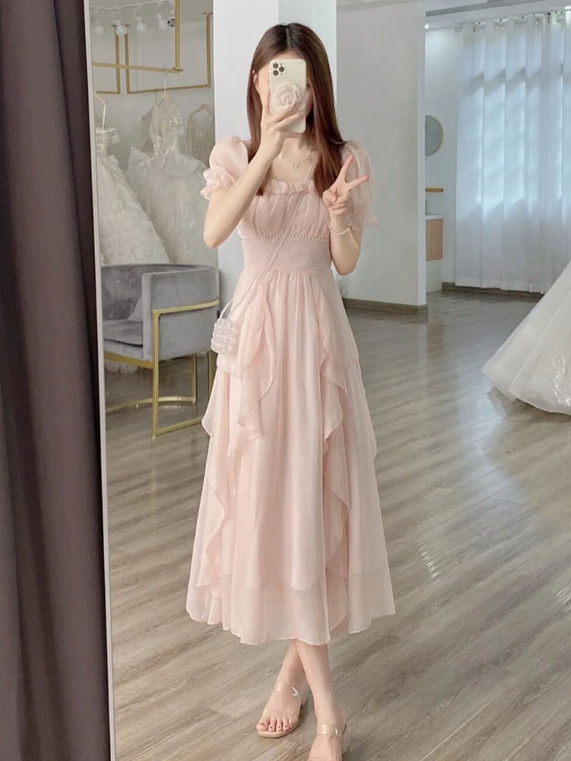 2023 프랑스 스타일 우아한 사교계의 새로운 중간 길이 원피스 슬리밍 작은 요정 첫사랑 핑크 원피스 여름