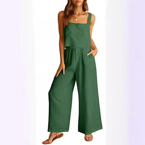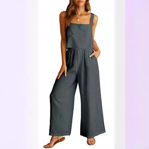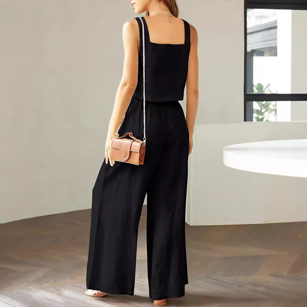 2023 여성 2 피스 스퀘어 칼라 린넨 조끼 배꼽 탑 와이드 레그 팬츠 캐주얼 세트 스포츠웨어