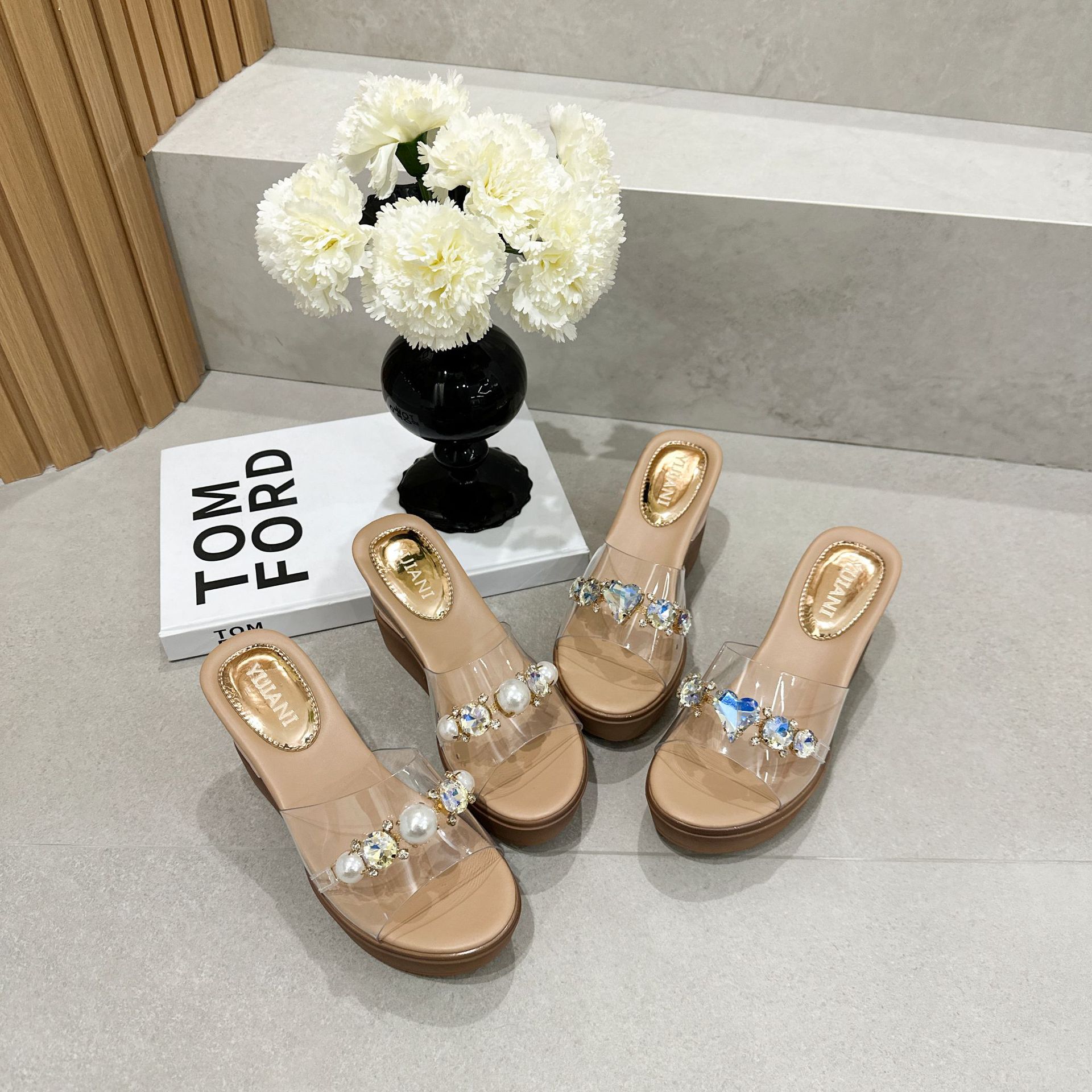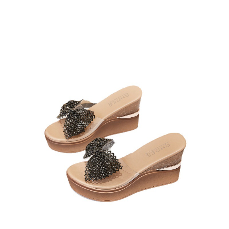 웨지 슬리퍼 여성의 여름 의상 인터넷-유명한 라인스톤 투명 하이힐 활 플랫폼 두꺼운 밑창 유행 여성 신발