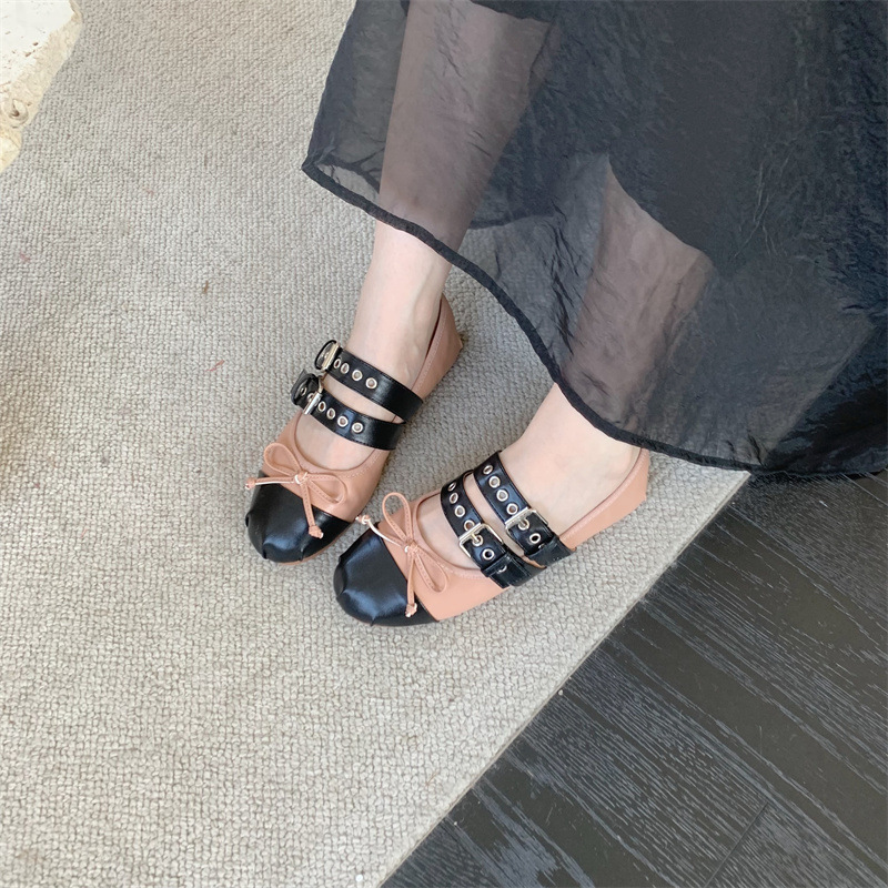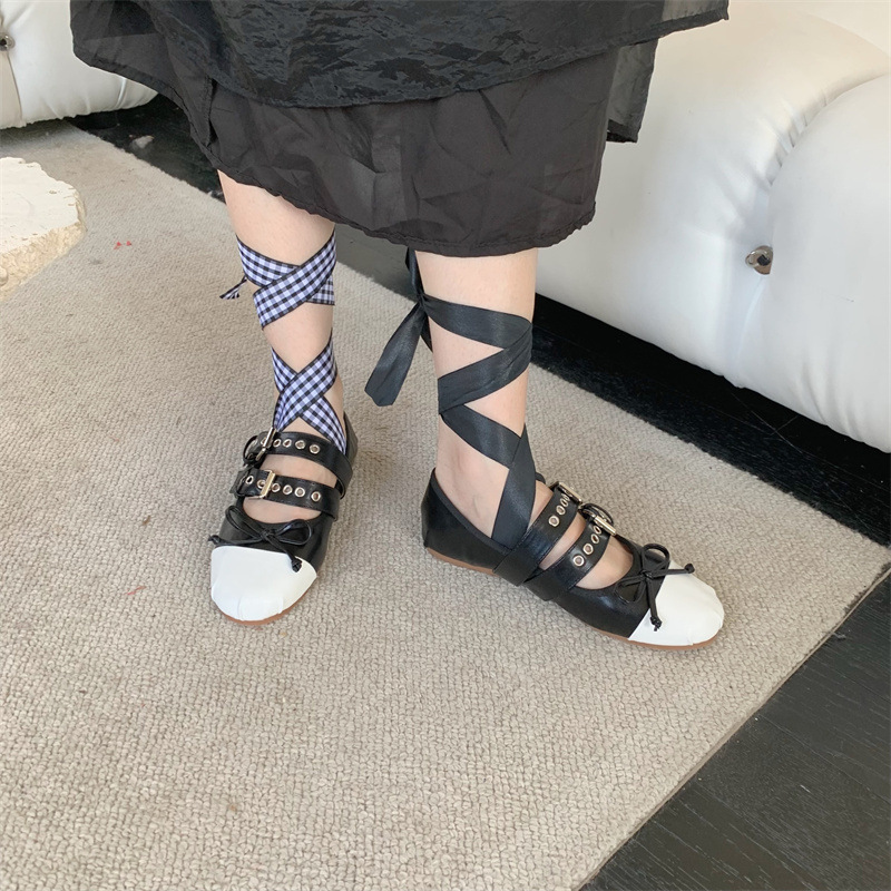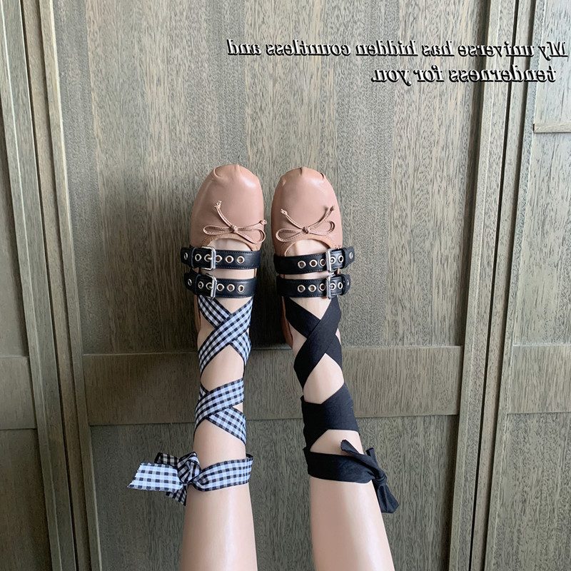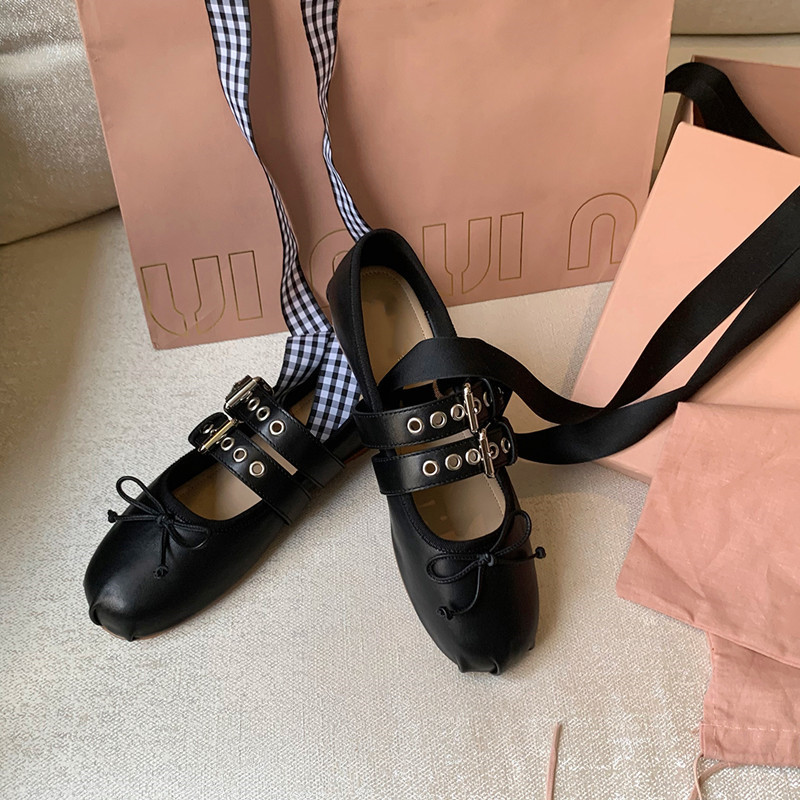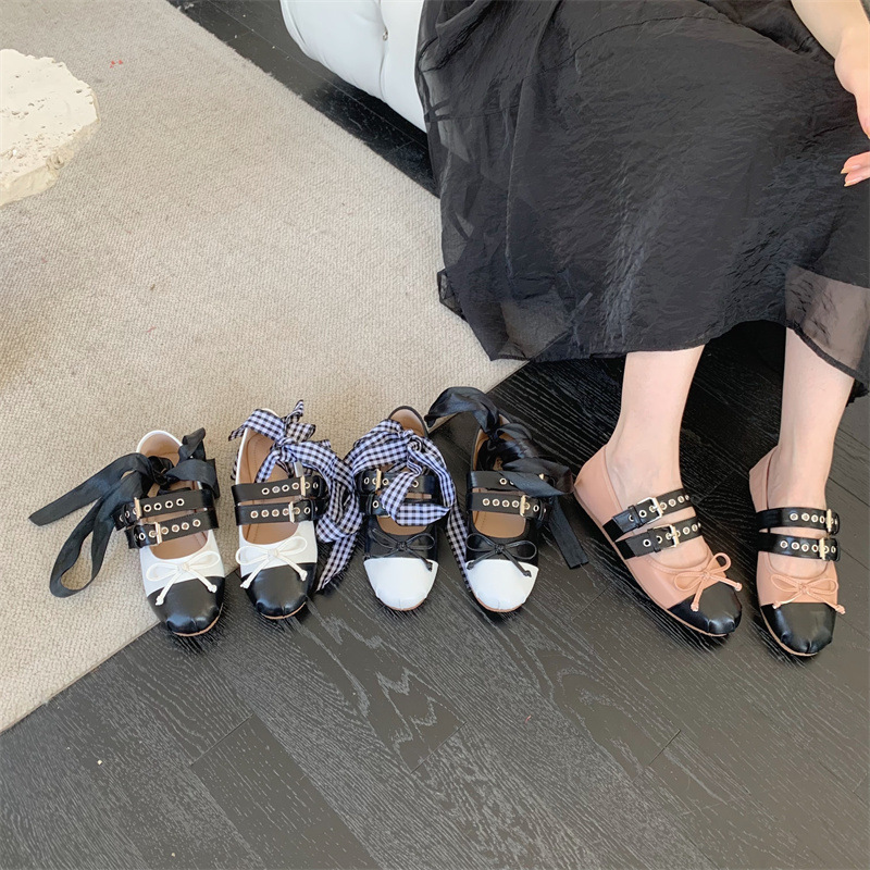 Miu 홈 활 얕은 입 레트로 여성 신발 발레 신발 플랫 슈즈 크로스 스트랩 라운드 발가락 신발 학생 신발