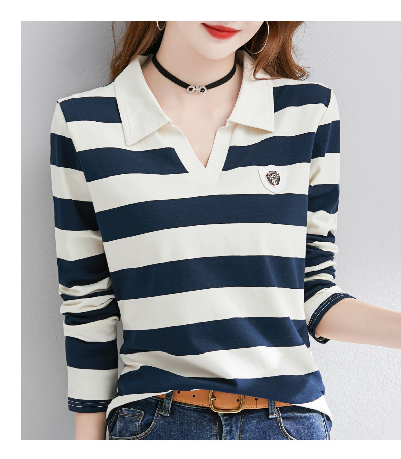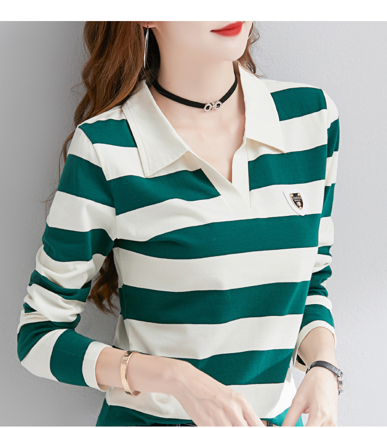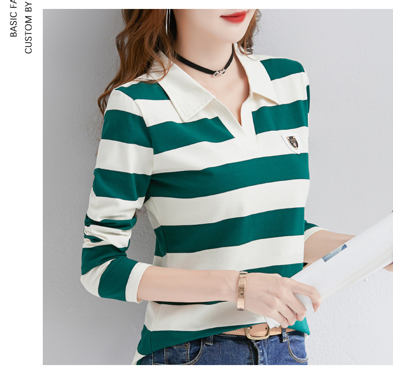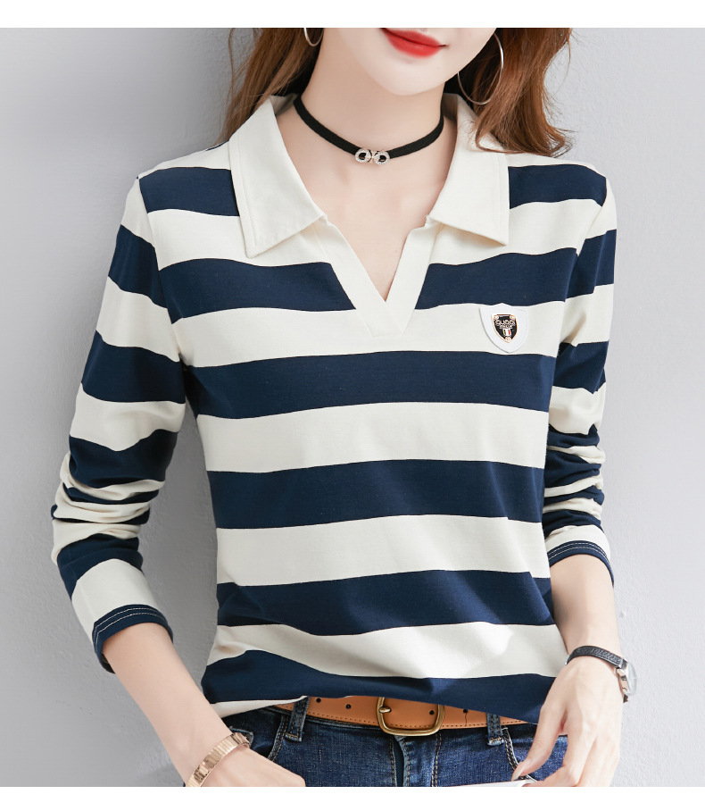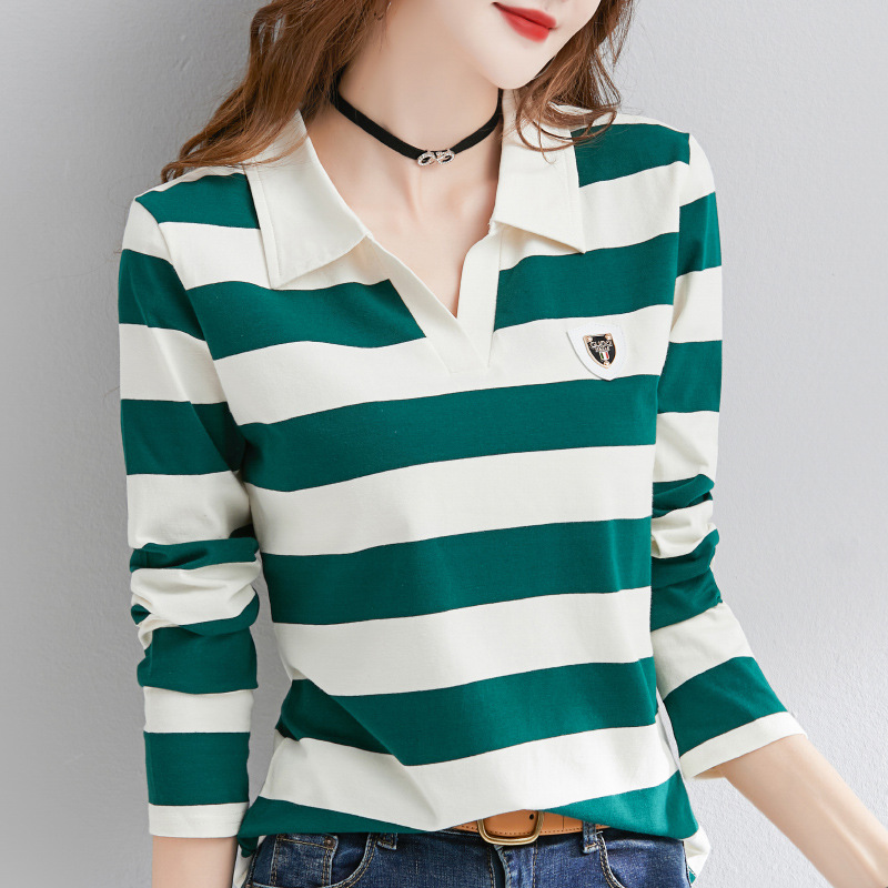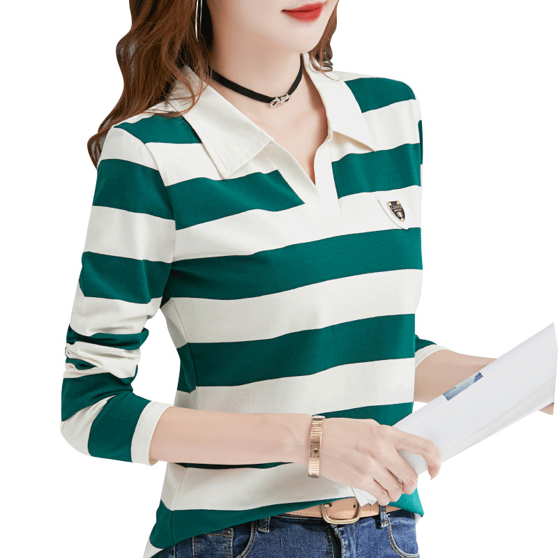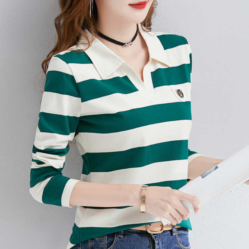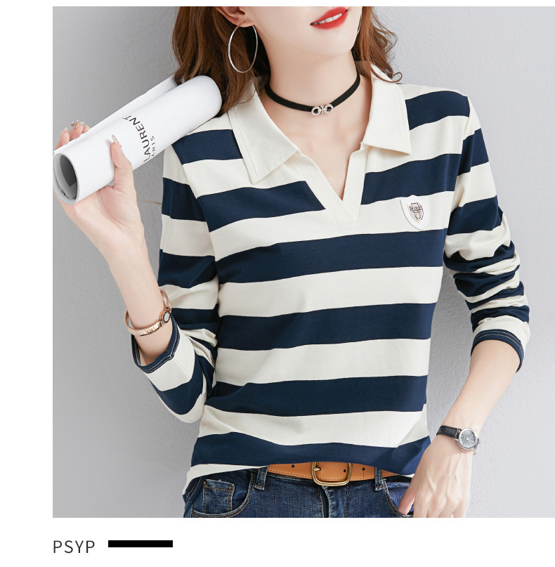 2025년 봄, 가을, 겨울 여성용 순면 긴팔 티셔츠, 니치 스트라이프 폴로 칼라, 여성용 기질이 있는 이너 레이어드 셔츠