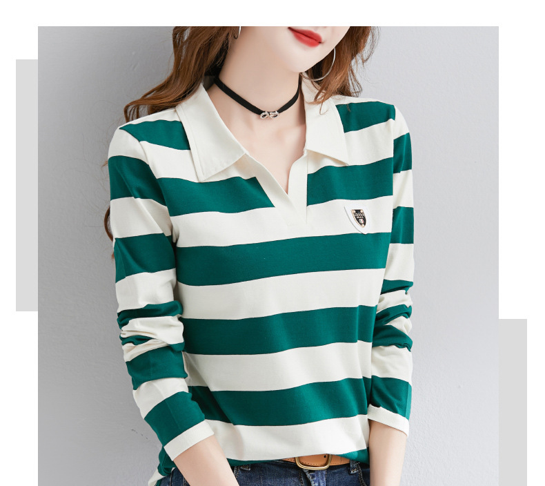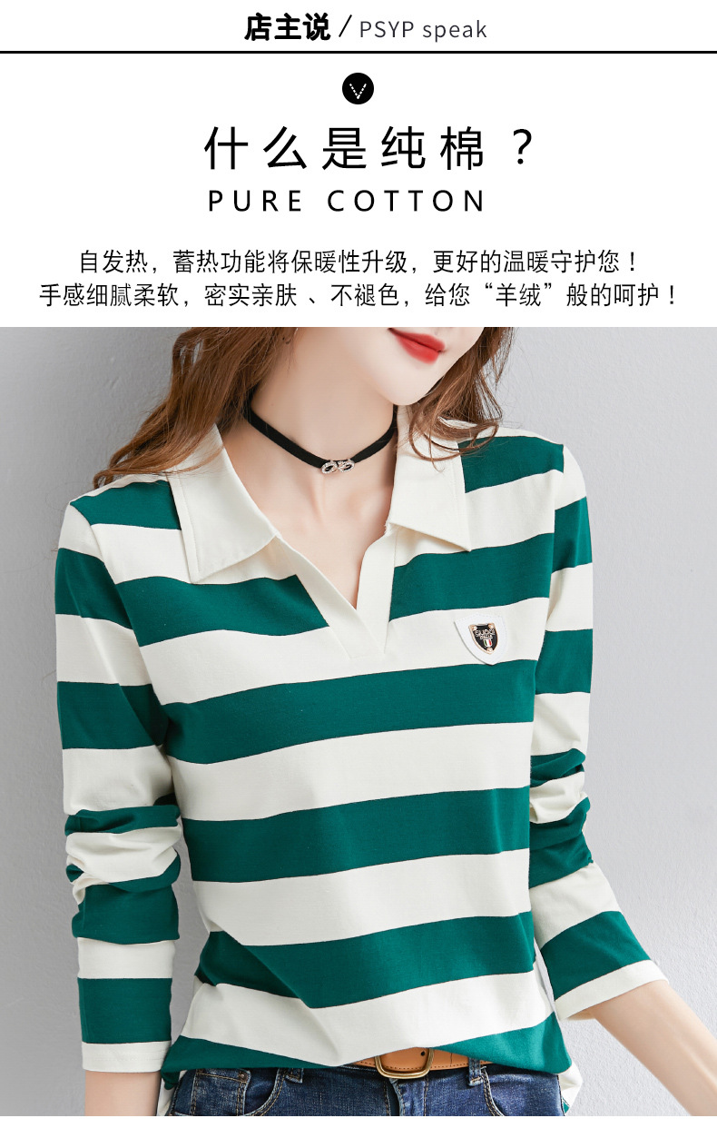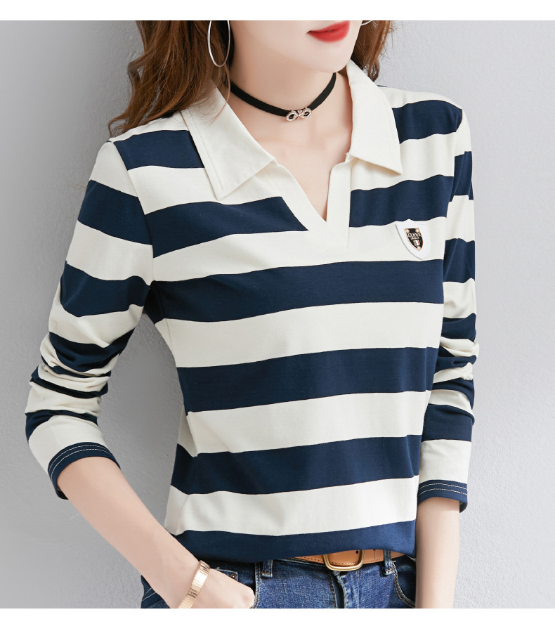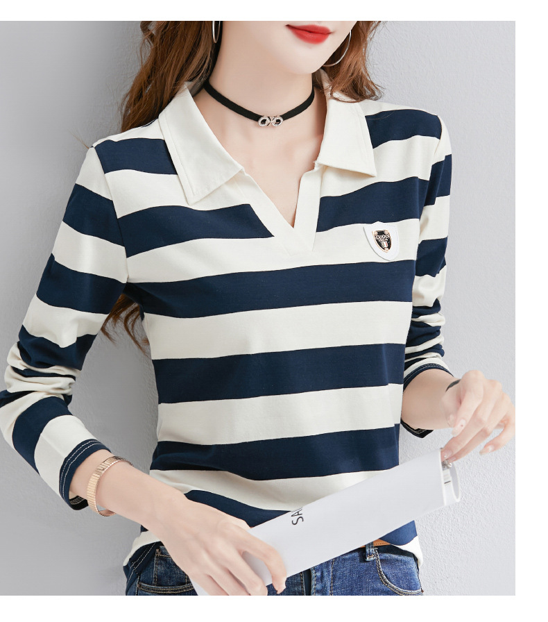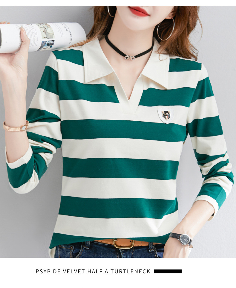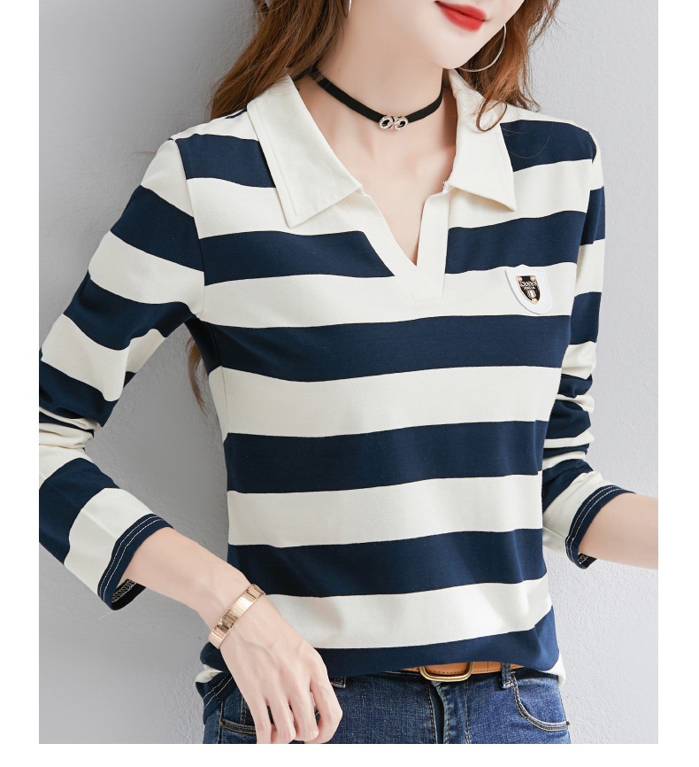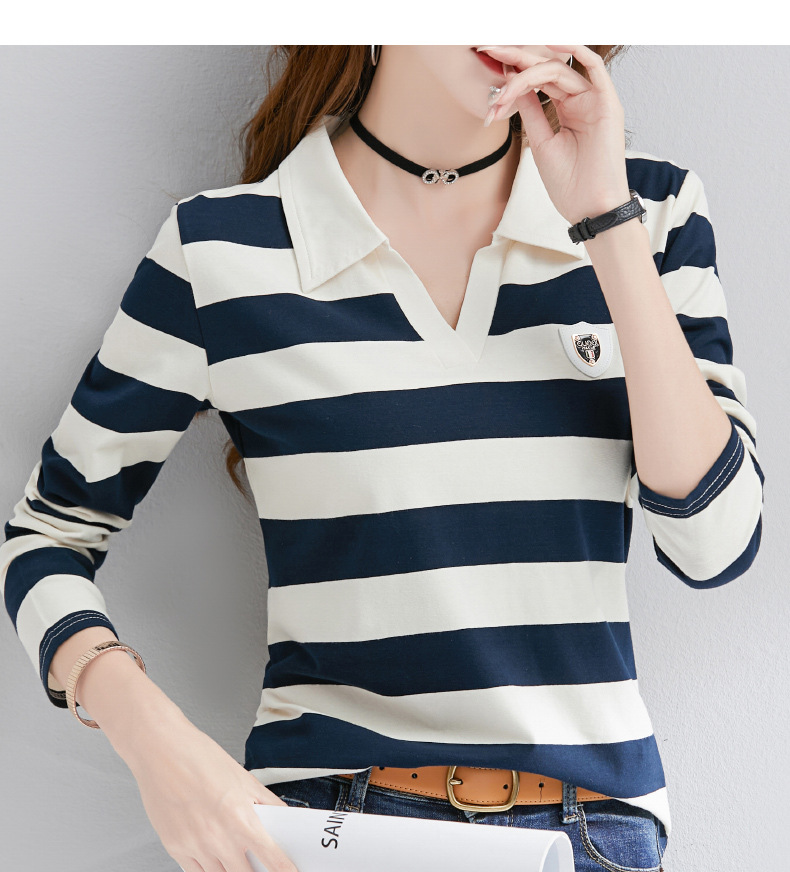 2025년 봄, 가을, 겨울 여성용 순면 긴팔 티셔츠, 니치 스트라이프 폴로 칼라, 여성용 기질이 있는 이너 레이어드 셔츠