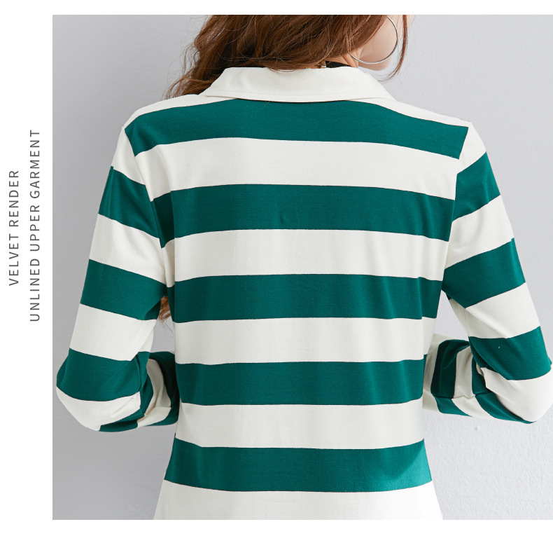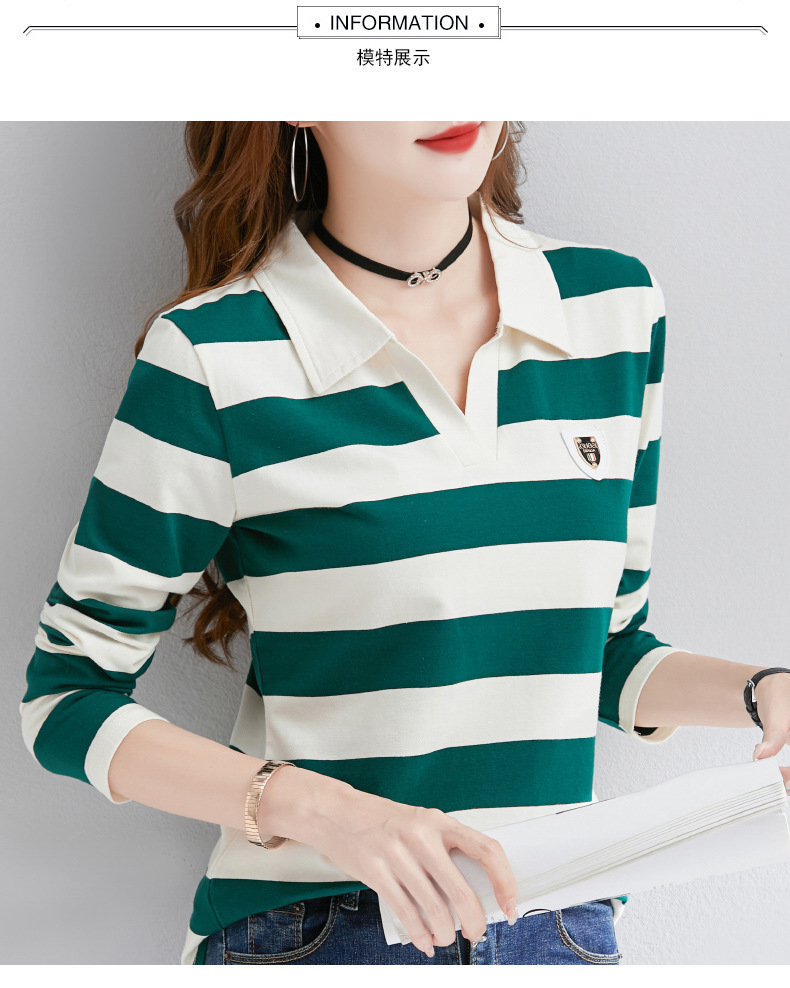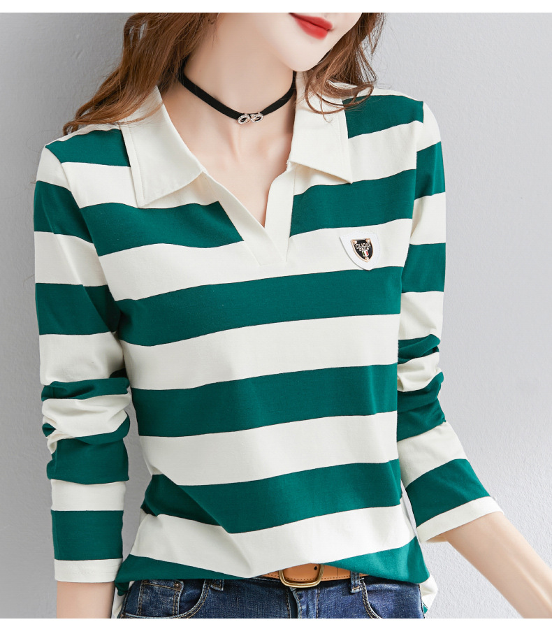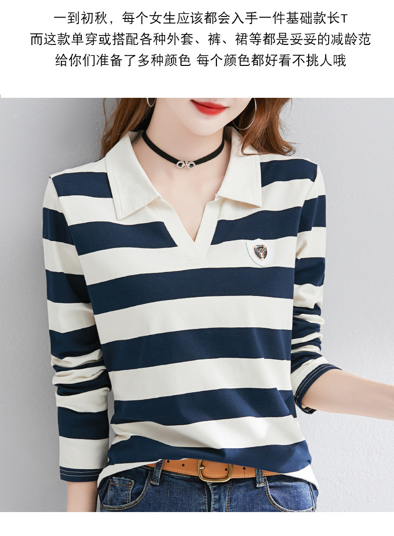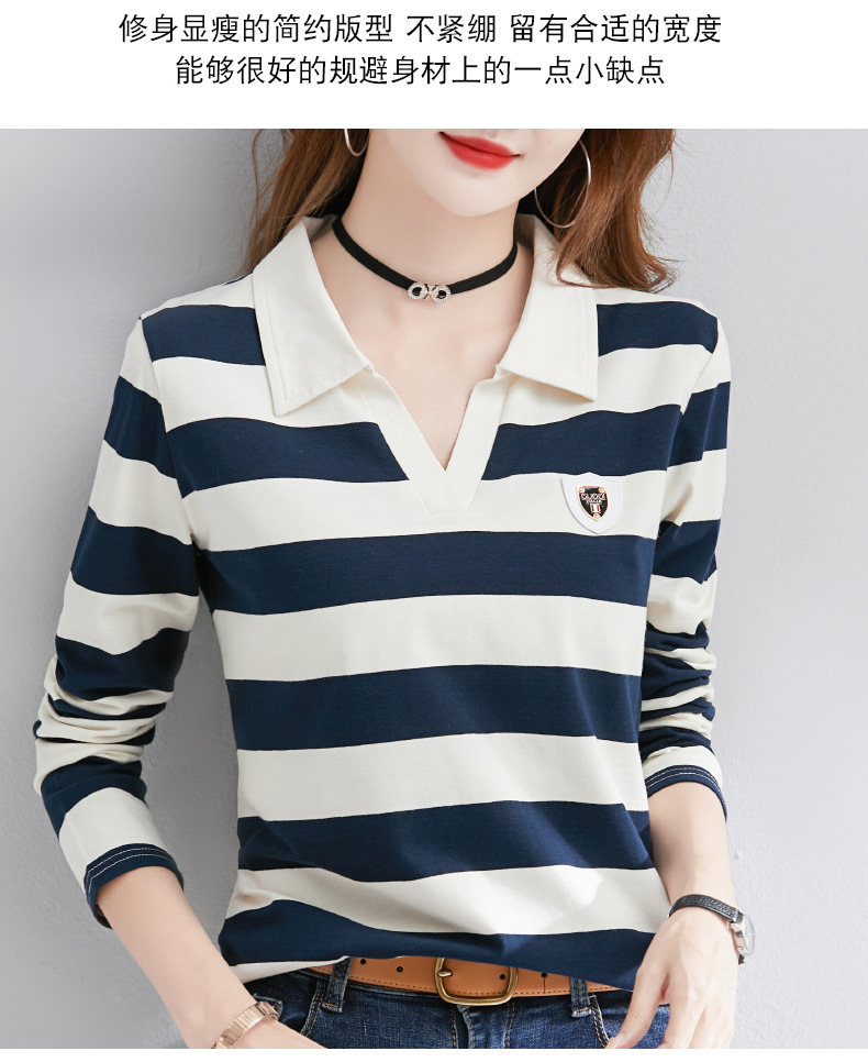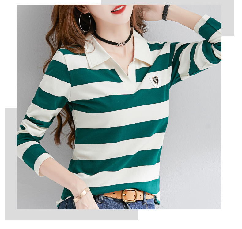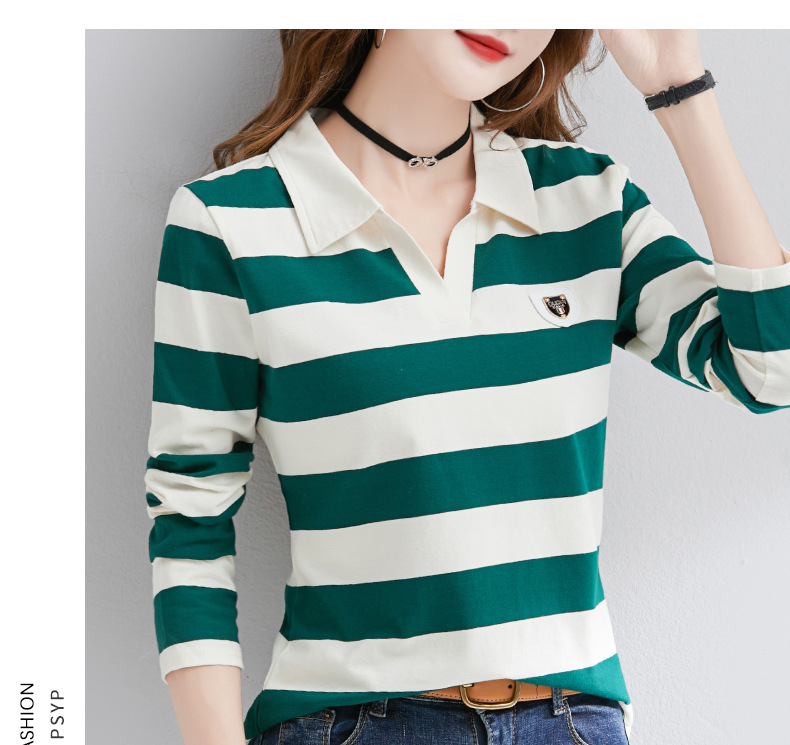 2025년 봄, 가을, 겨울 여성용 순면 긴팔 티셔츠, 니치 스트라이프 폴로 칼라, 여성용 기질이 있는 이너 레이어드 셔츠