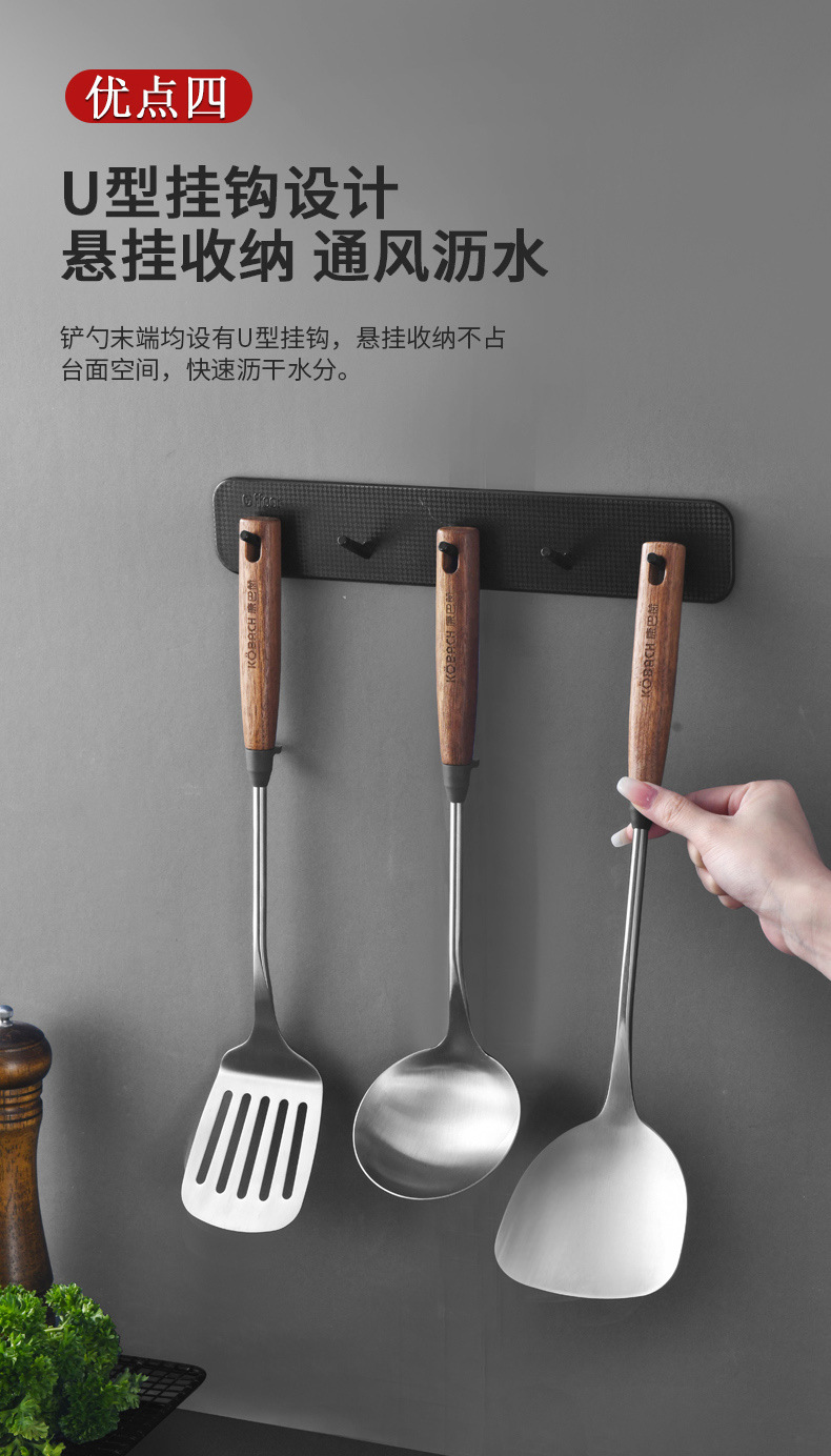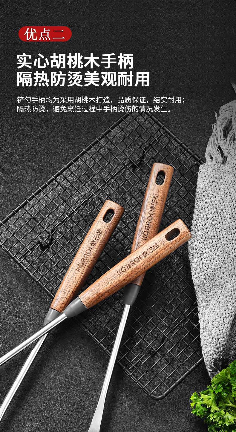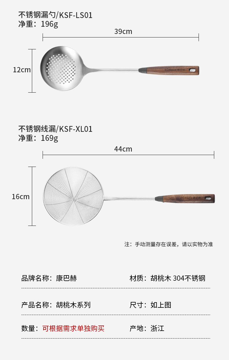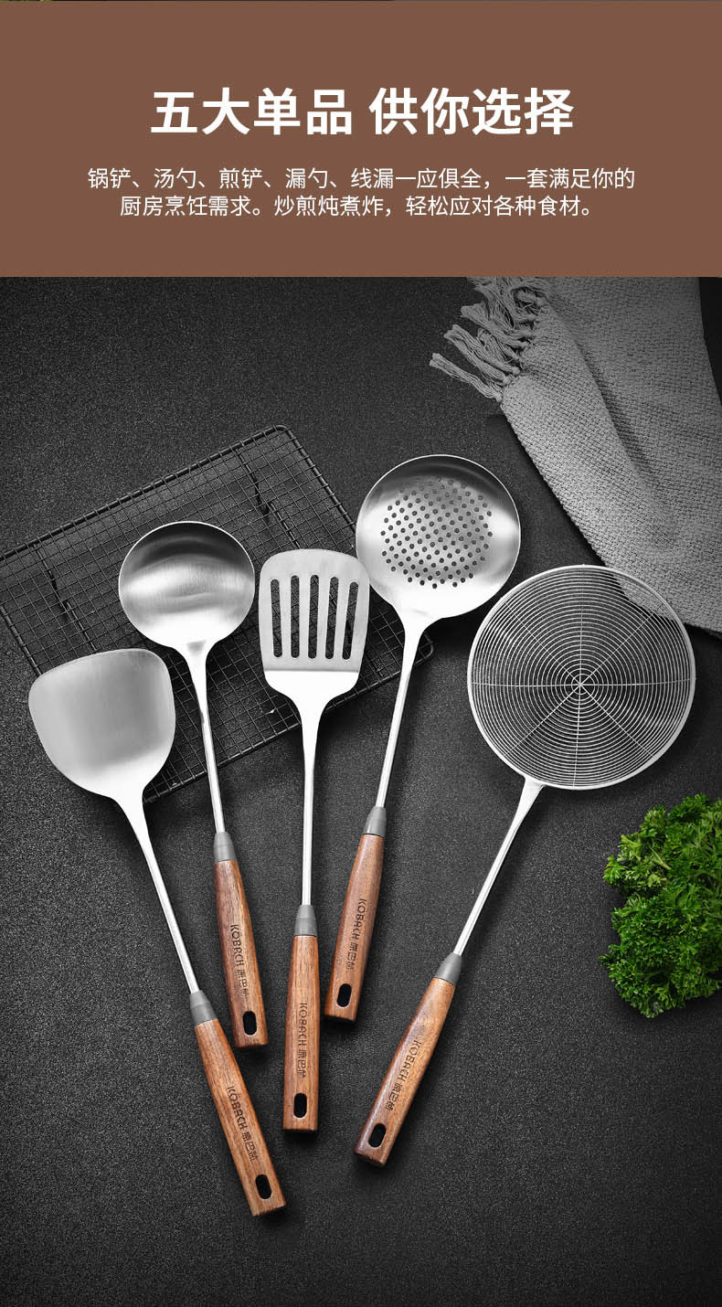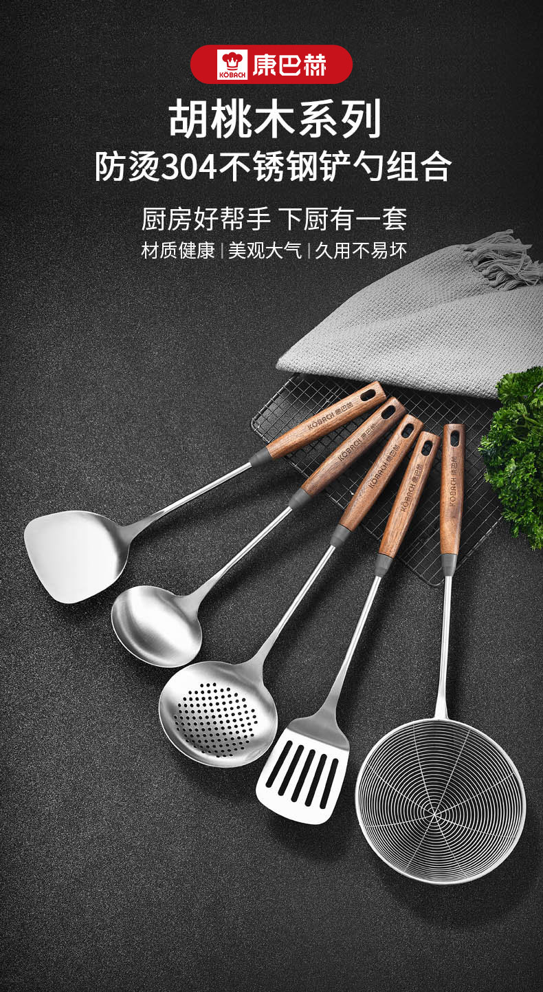 Kangbach 주걱 304 스테인레스 스틸 가정용 호두 손잡이 주걱 숟가락 강철 주걱 수프 숟가락 튀김 삽 소쿠리 실 누출