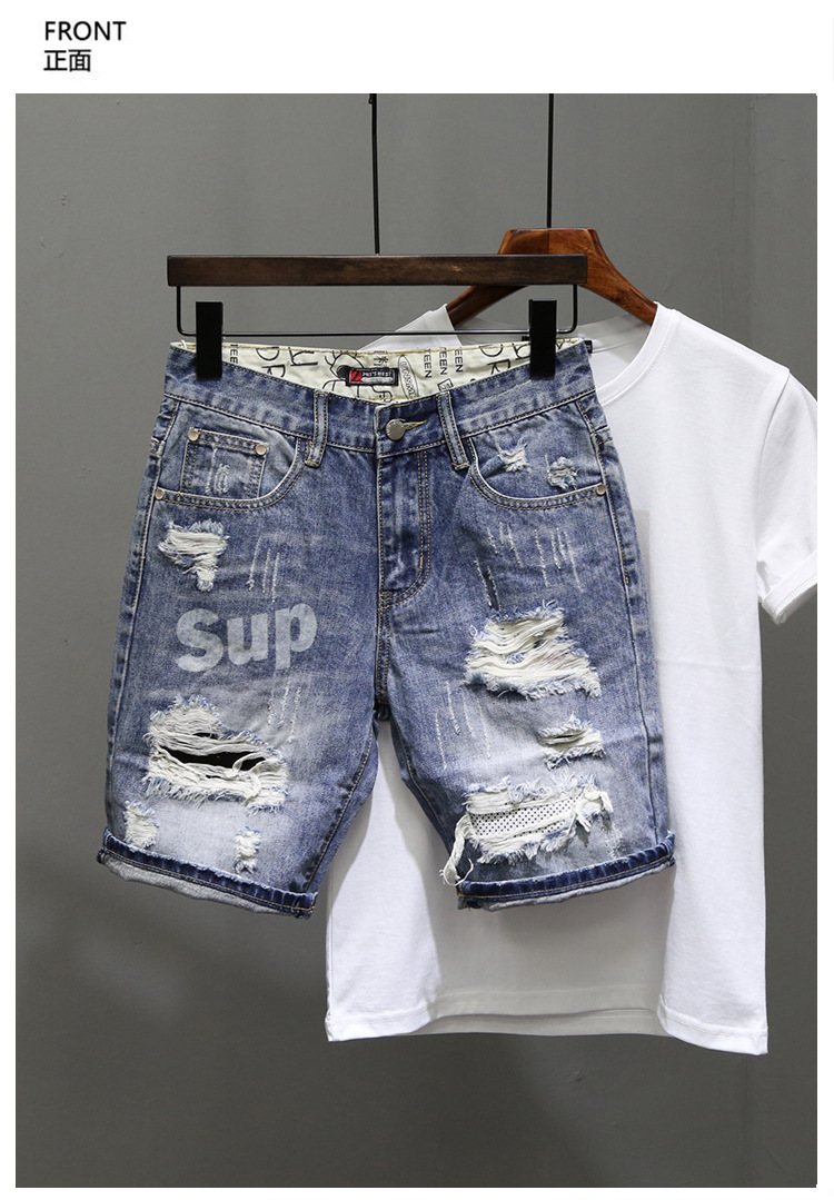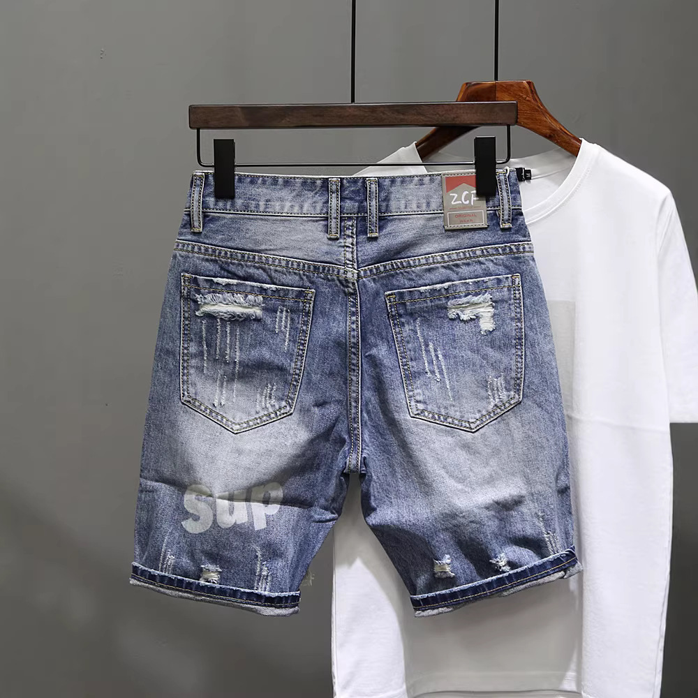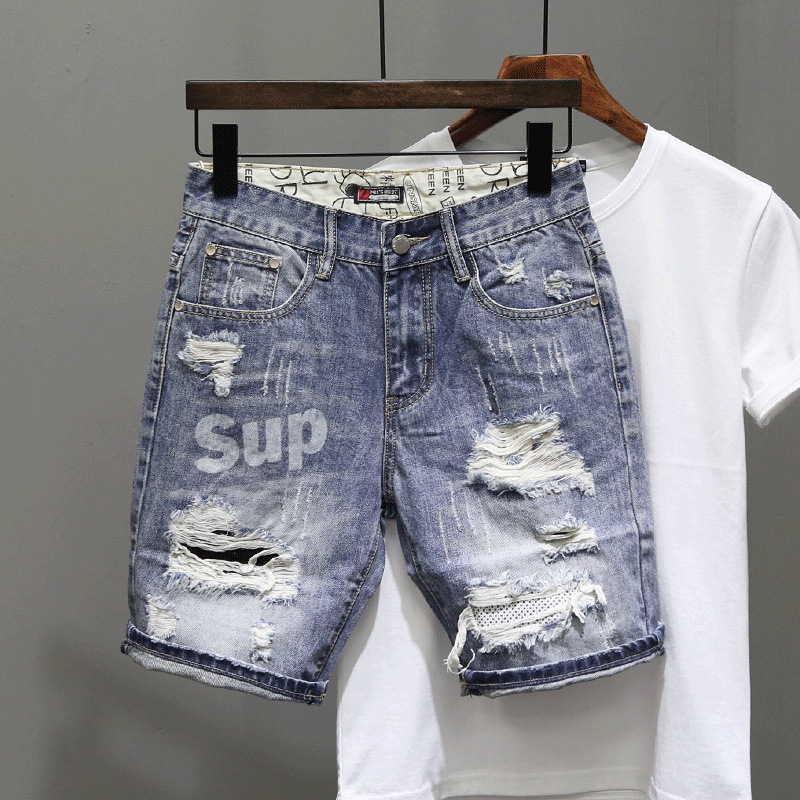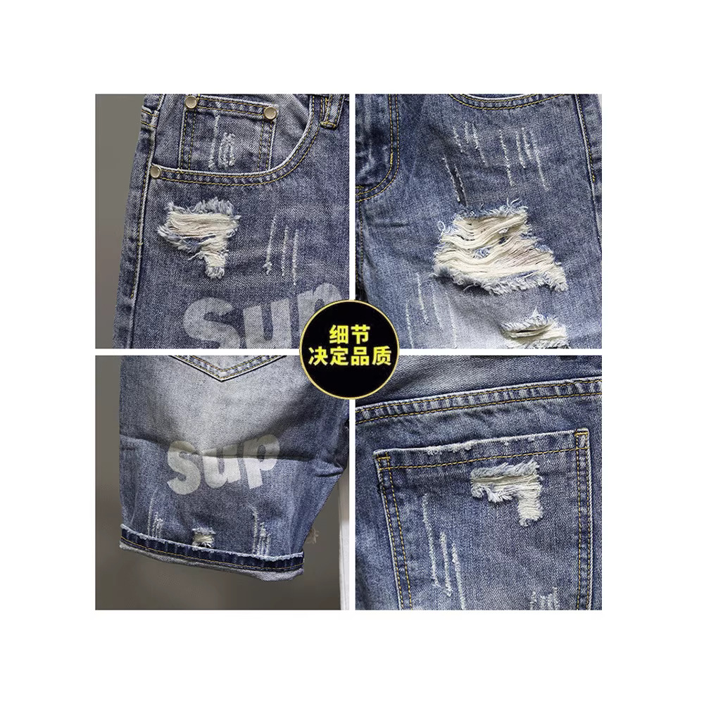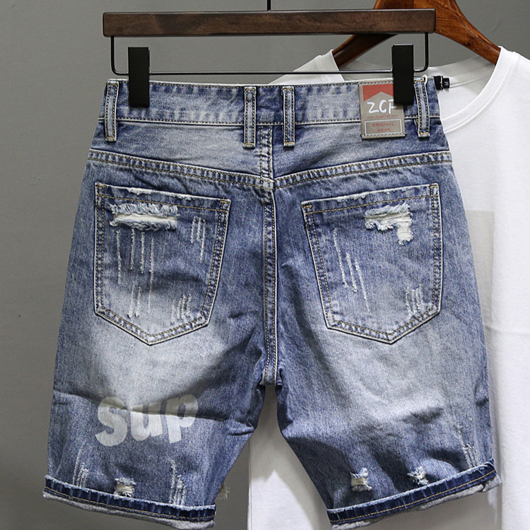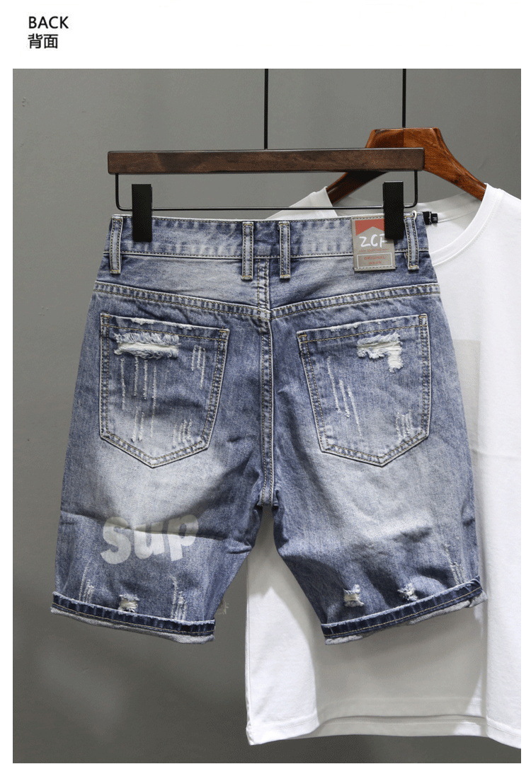 여름 아메리칸 스타일 데님 반바지 남자의 얇은 스트레치 중간 길이 바지 남자의 찢어진 긁기 5 길이 바지 슬림핏 한국 스타일