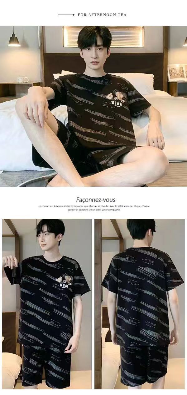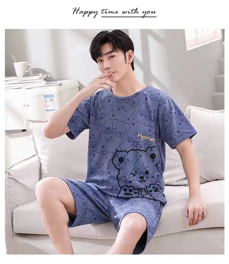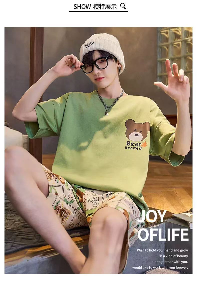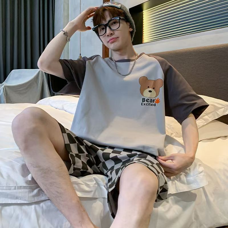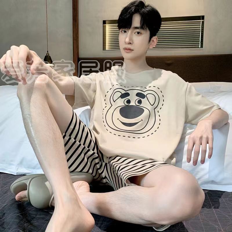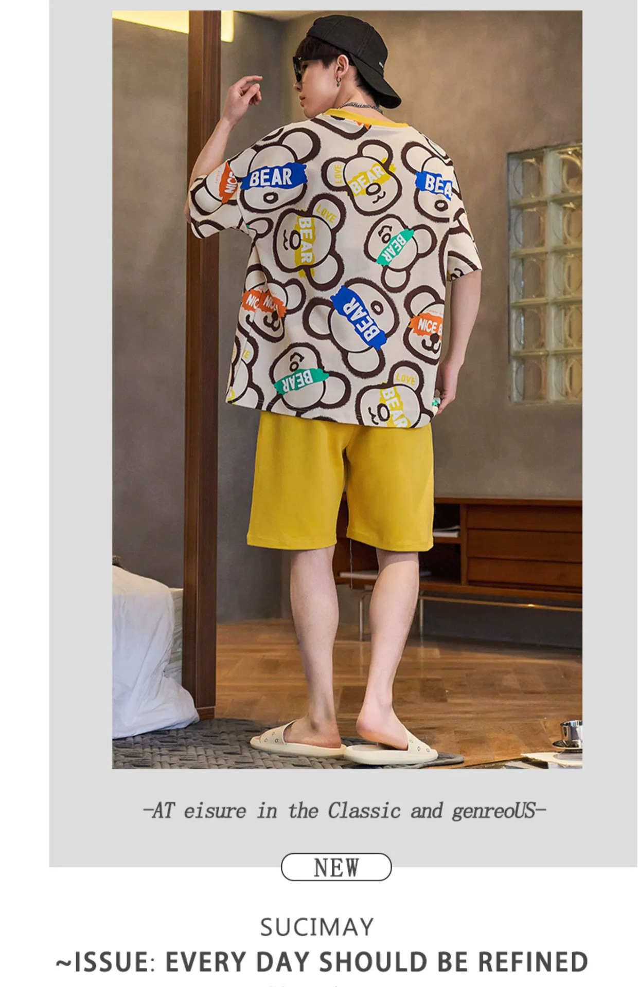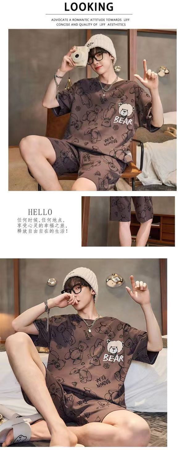 새로운 잠옷 남자의 여름 반팔 반바지 세트 한국식 느슨한 플러스 사이즈 만화 캐주얼 아웃웨어 가정 옷
