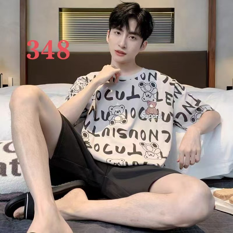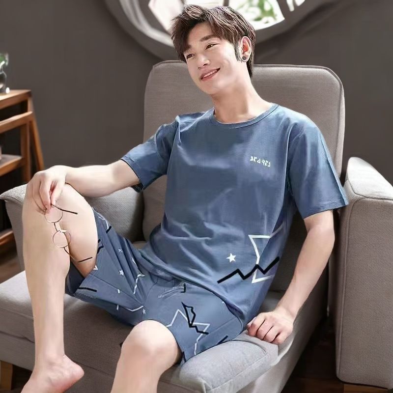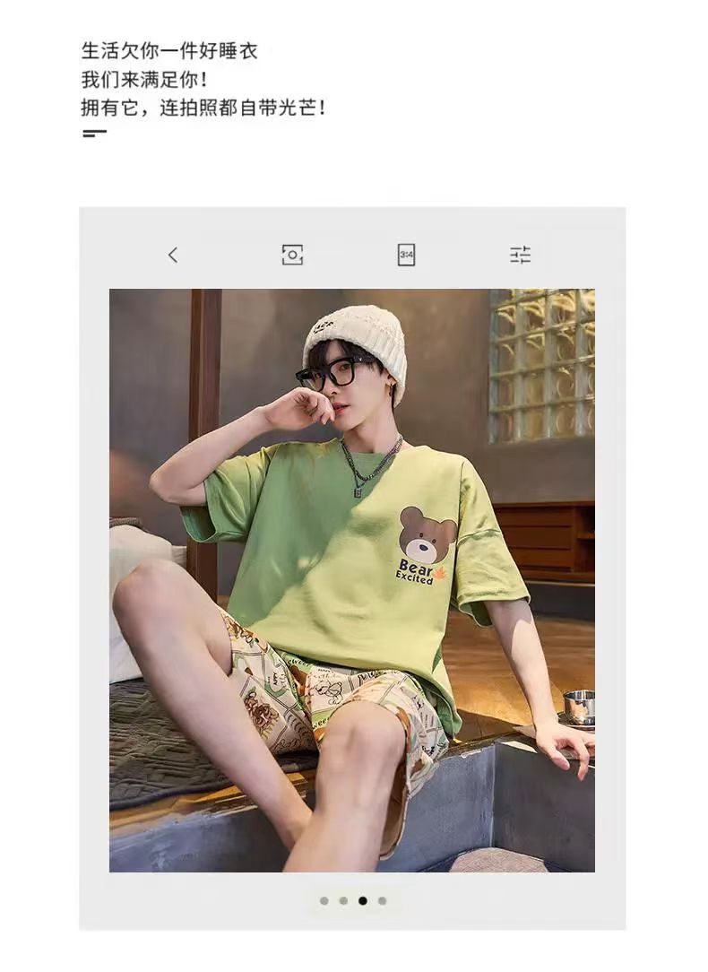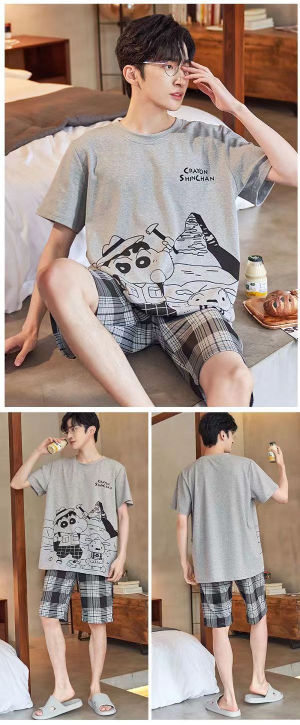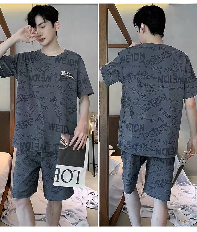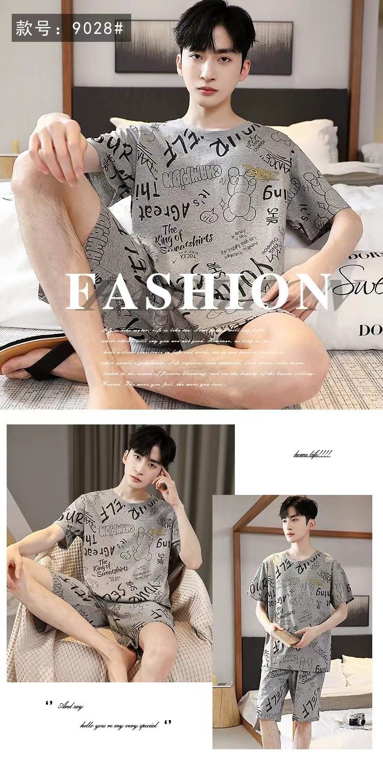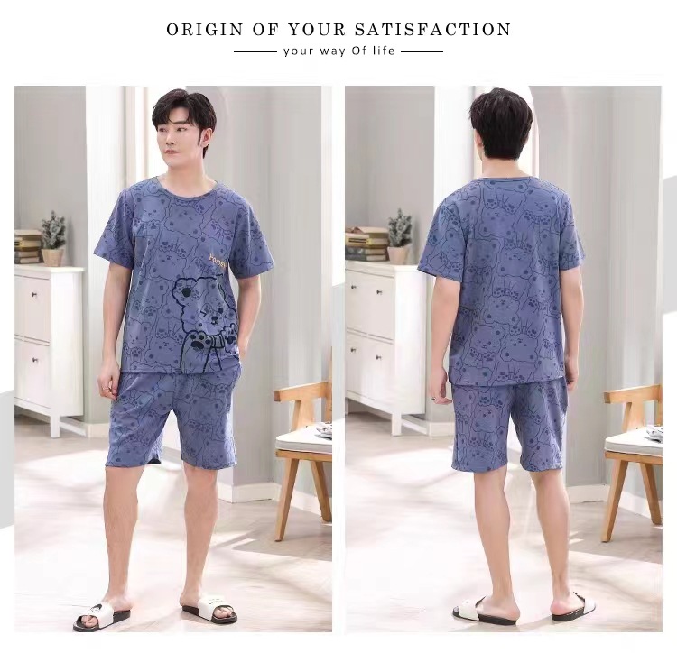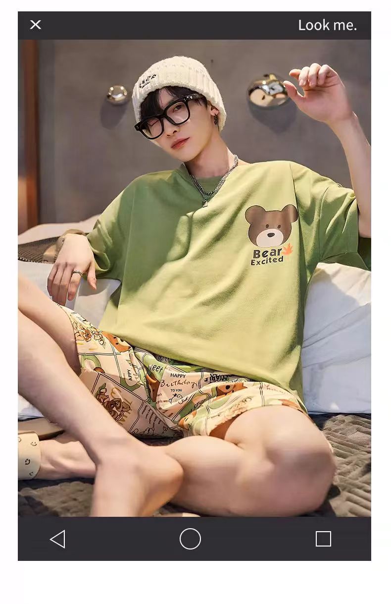 새로운 잠옷 남자의 여름 반팔 반바지 세트 한국식 느슨한 플러스 사이즈 만화 캐주얼 아웃웨어 가정 옷