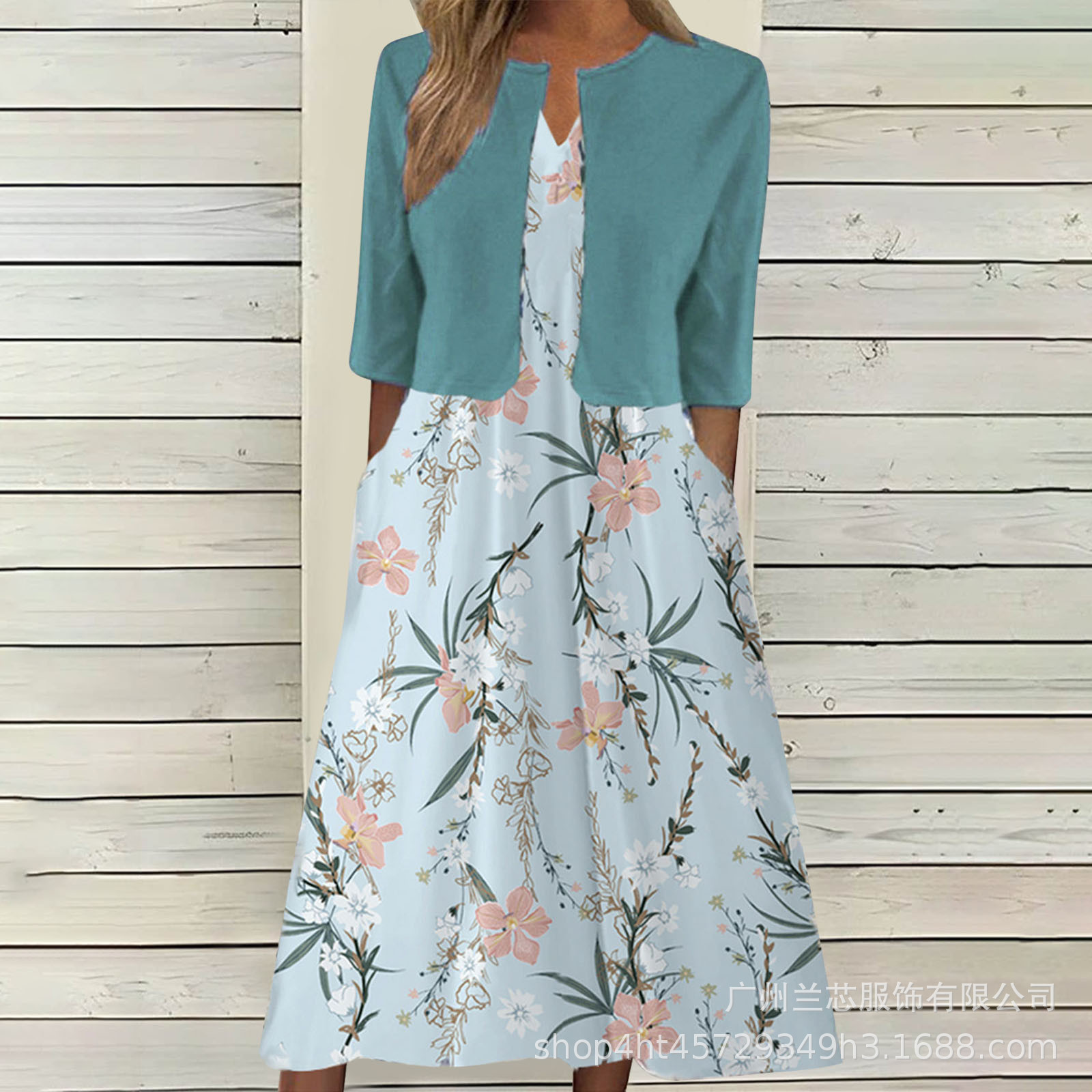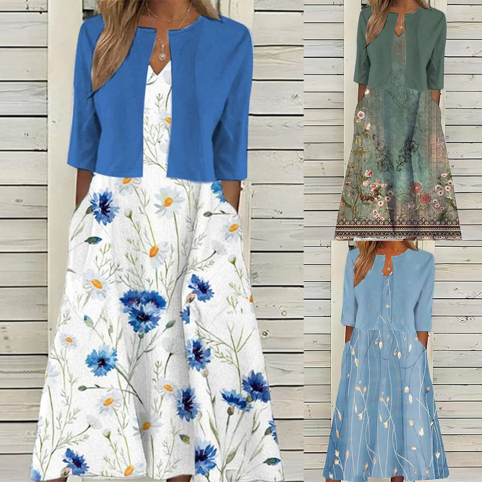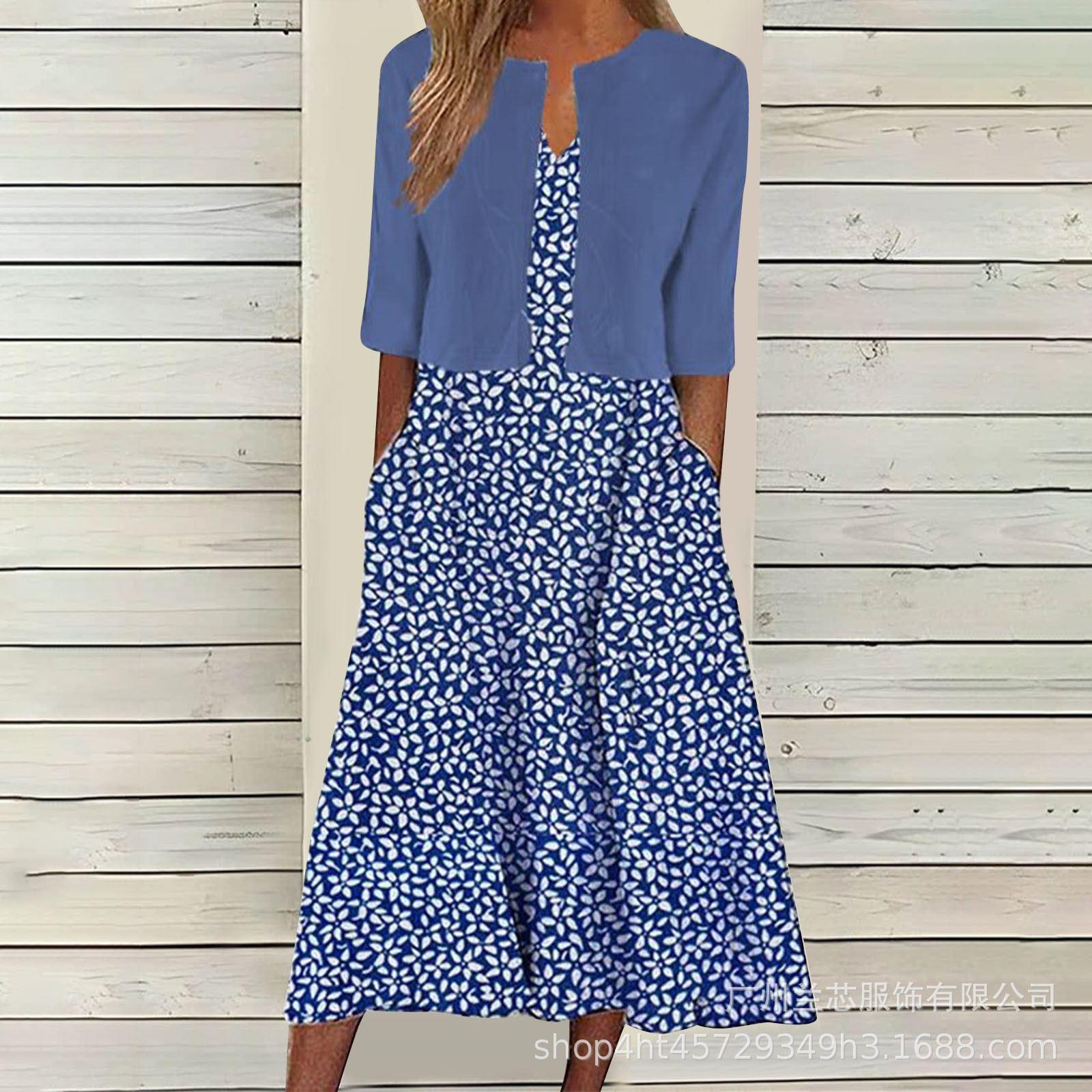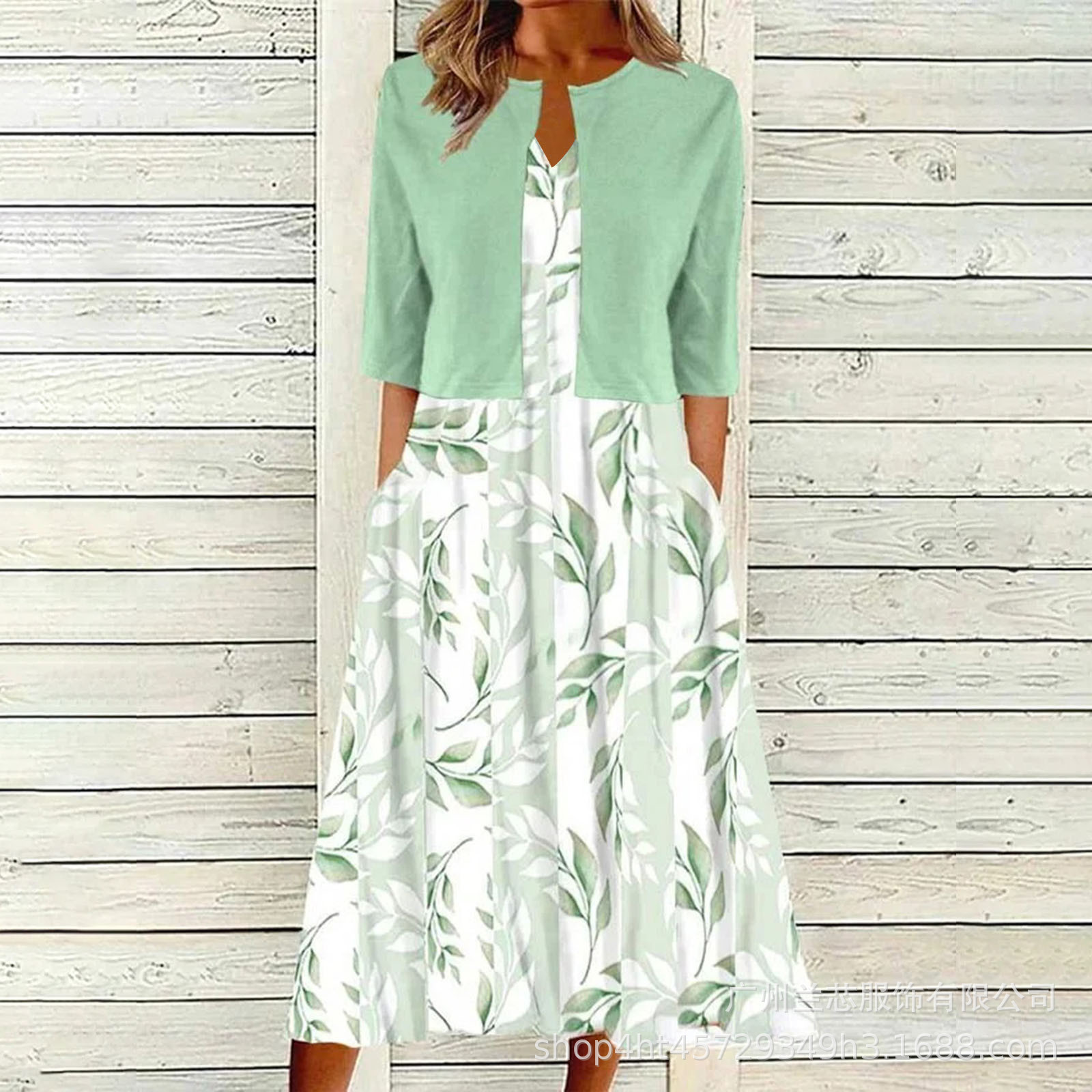 유럽과 미국의 새로운 민족 스타일 우아한 꽃 프린트 조끼 원피스 매칭 중간 소매 카디건 재킷 투피스 세트