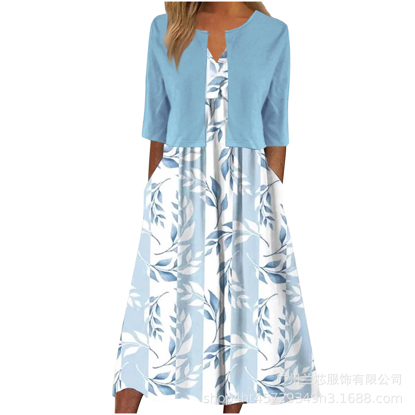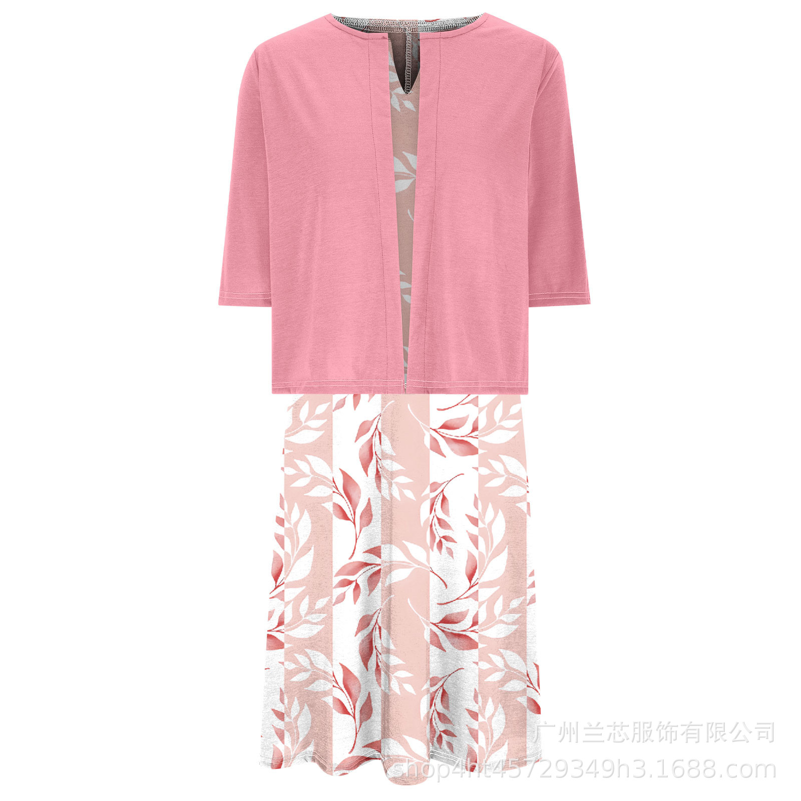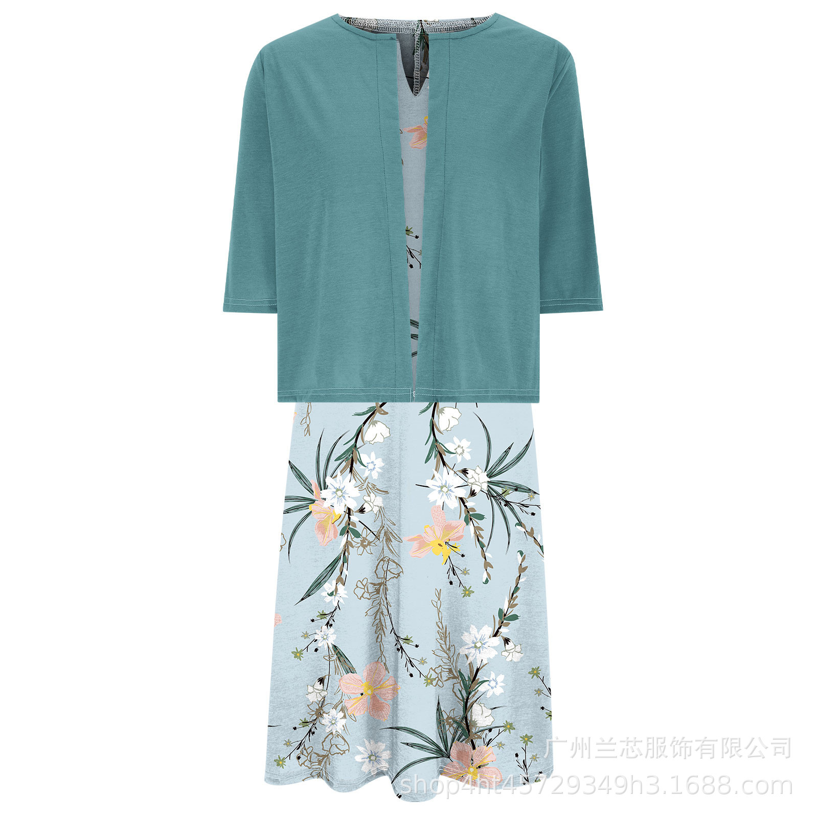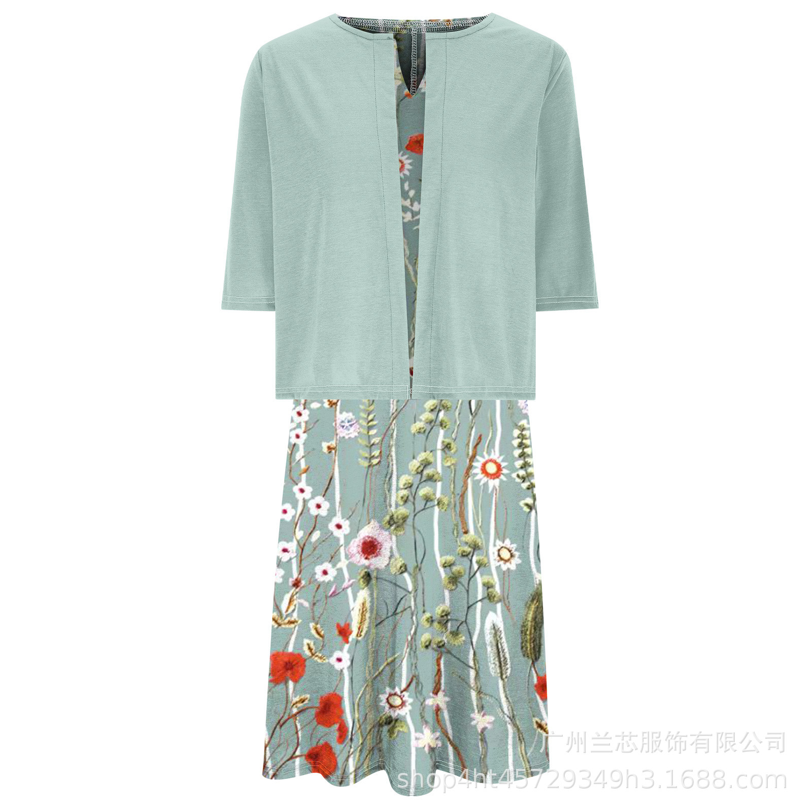 유럽과 미국의 새로운 민족 스타일 우아한 꽃 프린트 조끼 원피스 매칭 중간 소매 카디건 재킷 투피스 세트