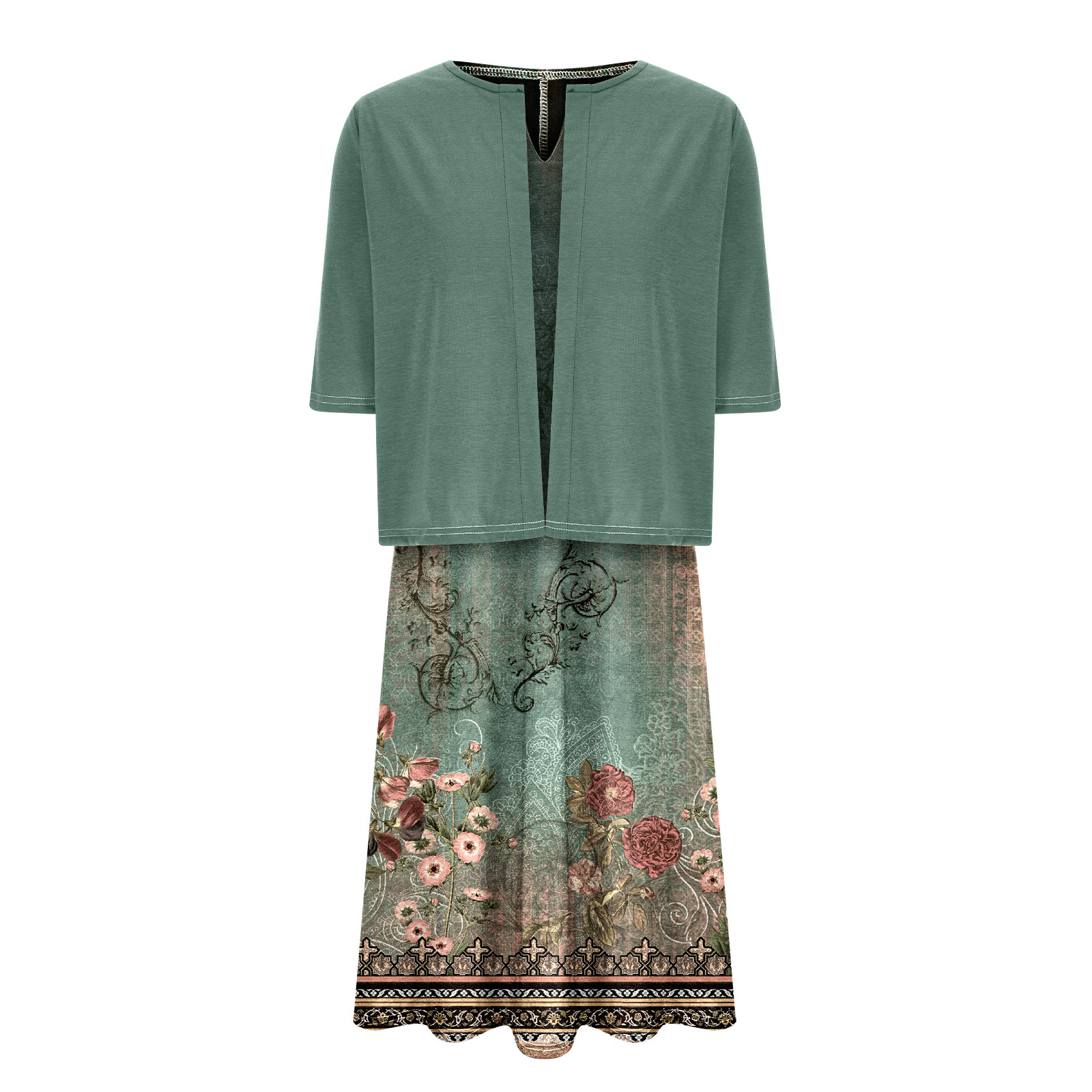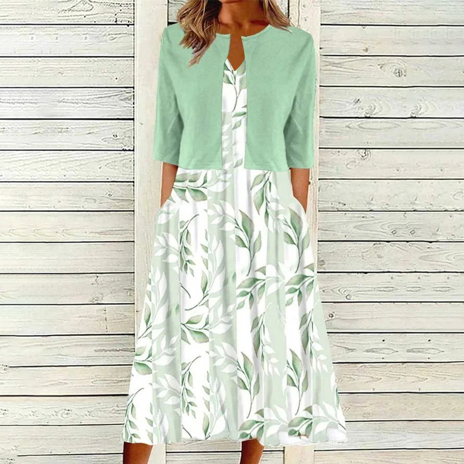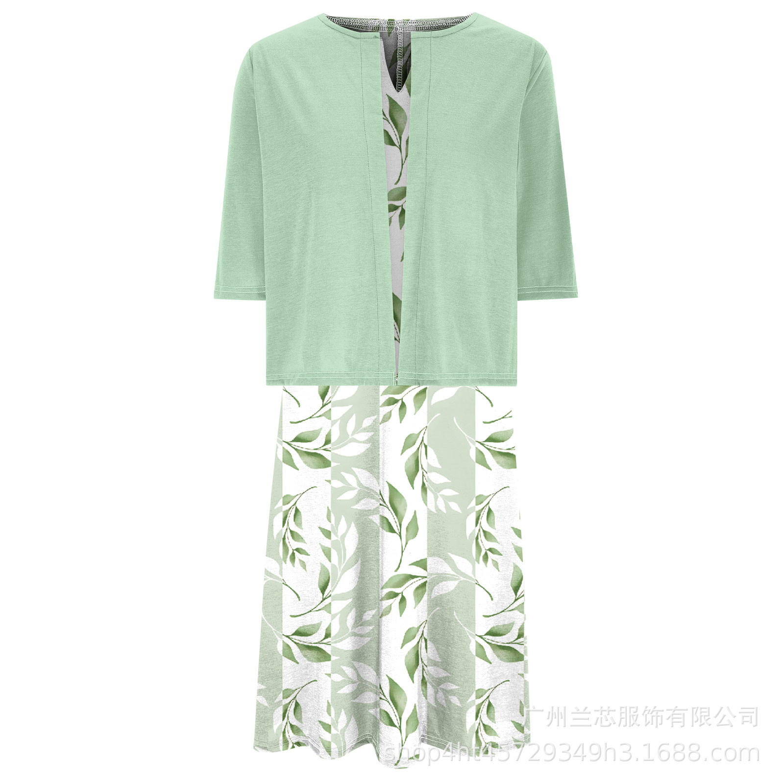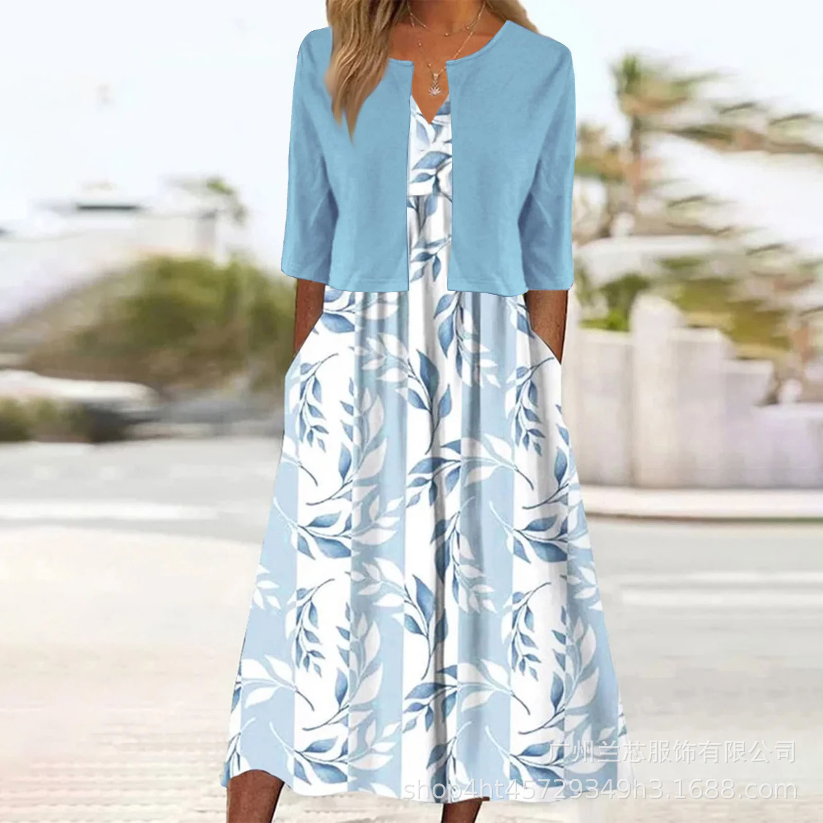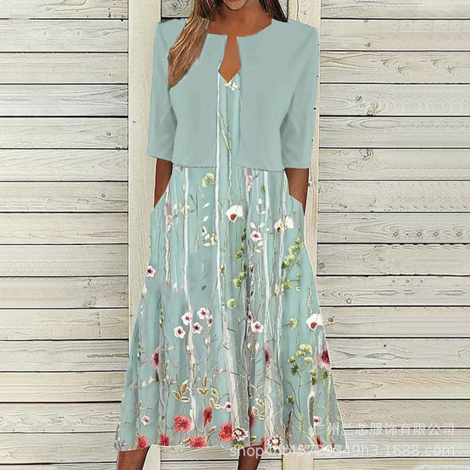 유럽과 미국의 새로운 민족 스타일 우아한 꽃 프린트 조끼 원피스 매칭 중간 소매 카디건 재킷 투피스 세트
