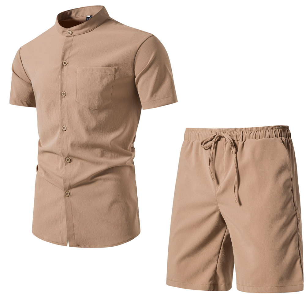 대외 무역 여름 남자의 중국 스타일 반팔 복고풍 셔츠 단색 비치 바지 반바지 세트 면 린넨 캐주얼 세트 남성