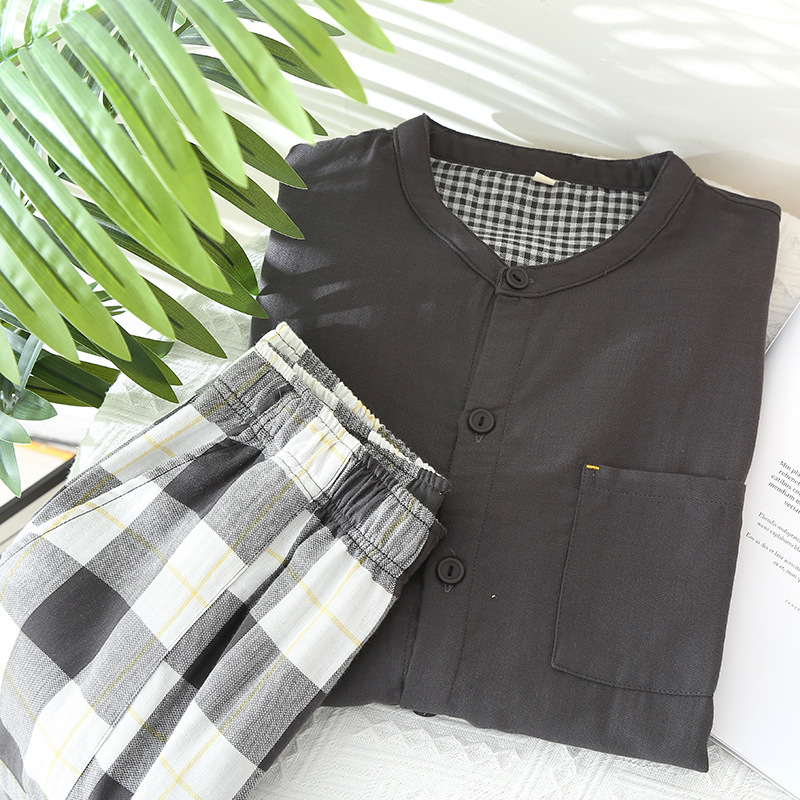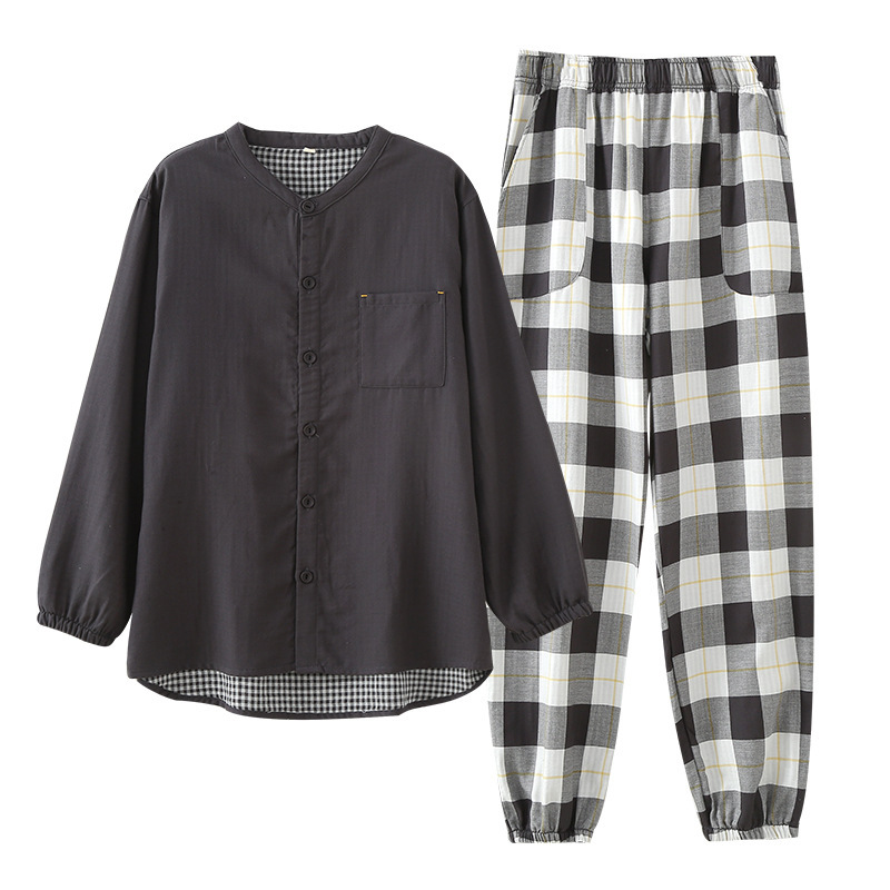 비 인쇄 스타일 면 더블 레이어 면사 남자의 봄과 가을과 여름 가정 의류 일본식 격자 무늬 긴 소매 간단한 잠옷 세트