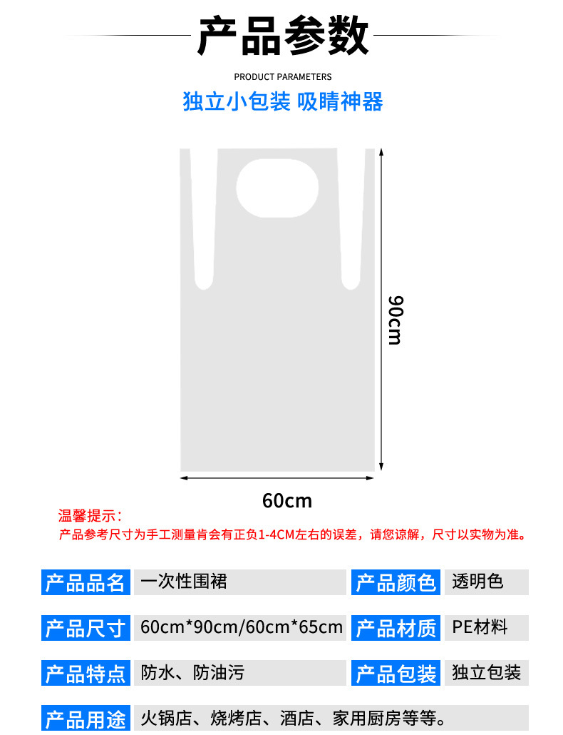 일회용 앞치마 케이터링 가재 냄비 상업용 방수 및 내유성 테이크 아웃 플라스틱 턱받이 독립 포장