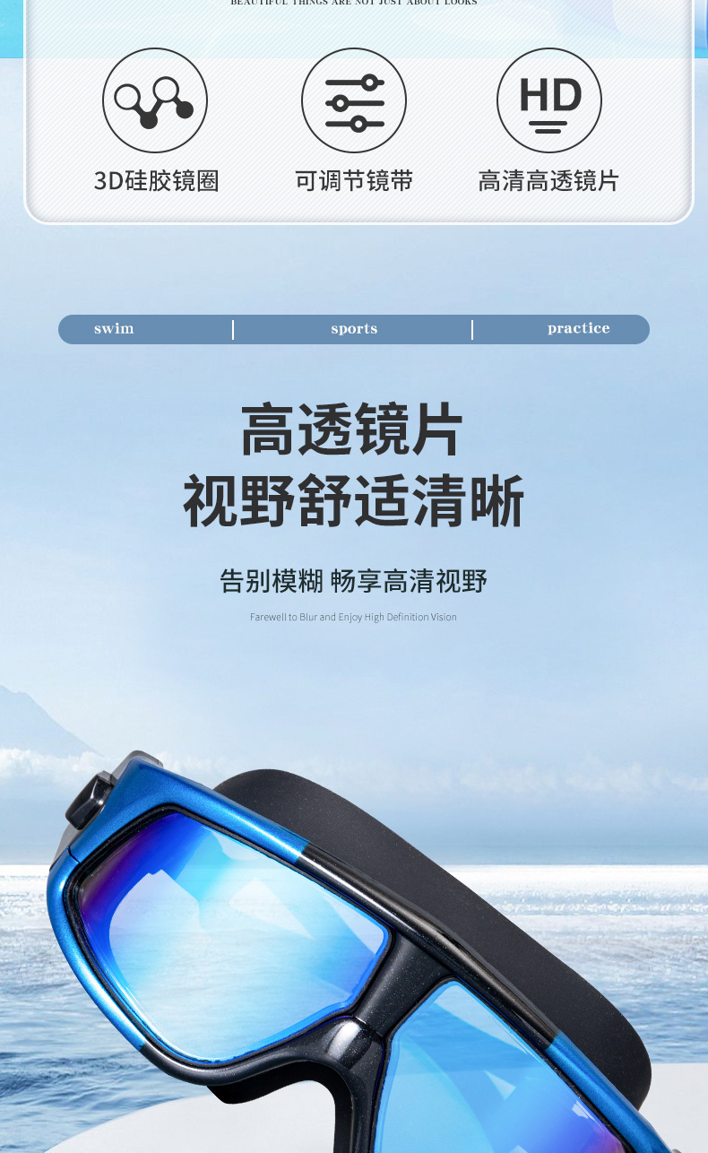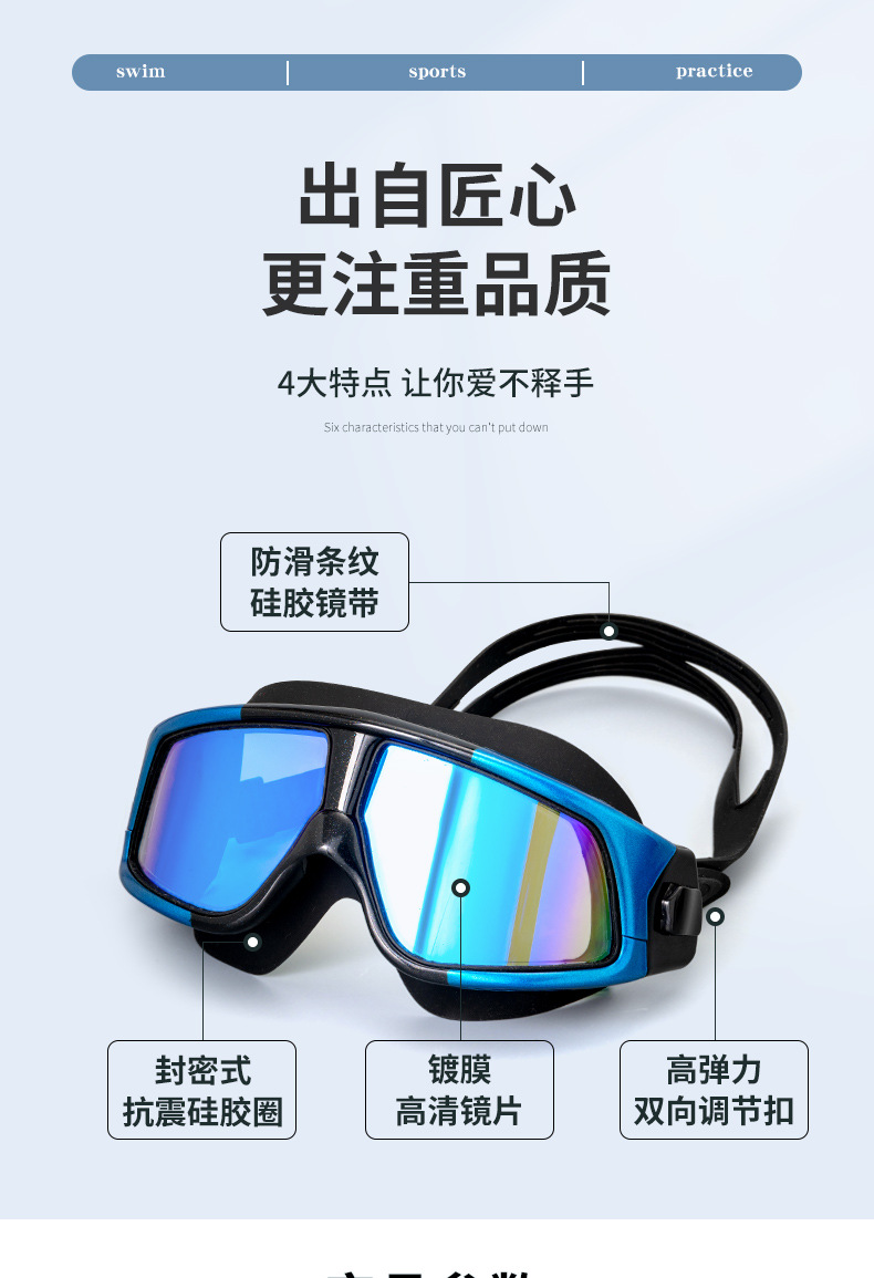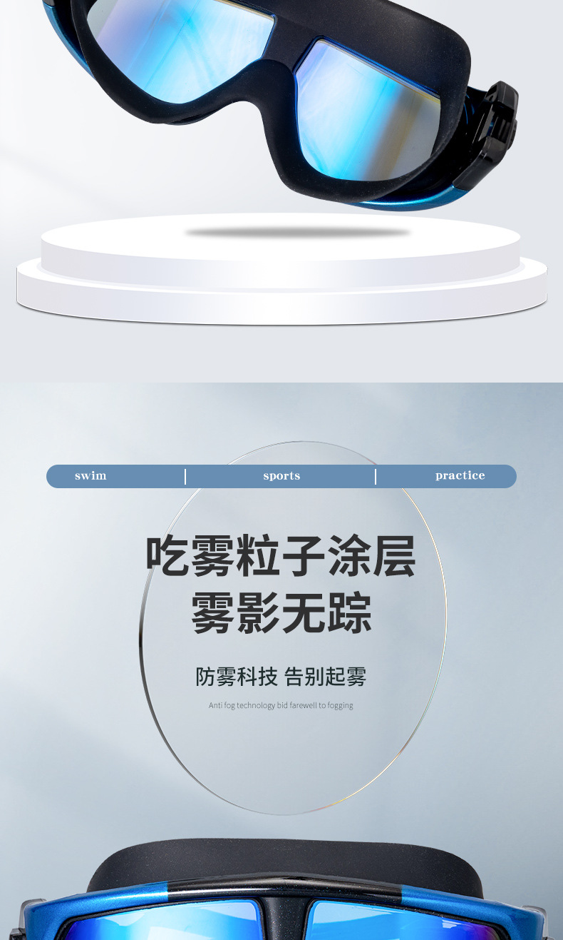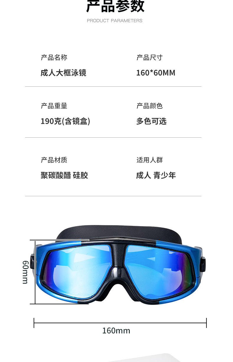 产品介绍:镜面防雾电镀,PC镜片防紫外线,镜面超强化耐磨处理,硅胶镜圈、镜带,柔软无毒无味,超广角镜面设