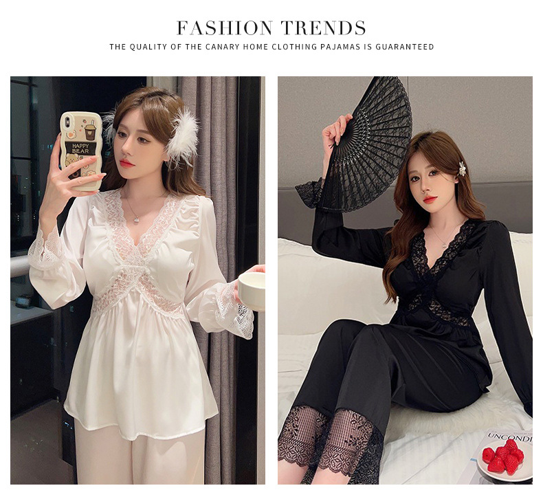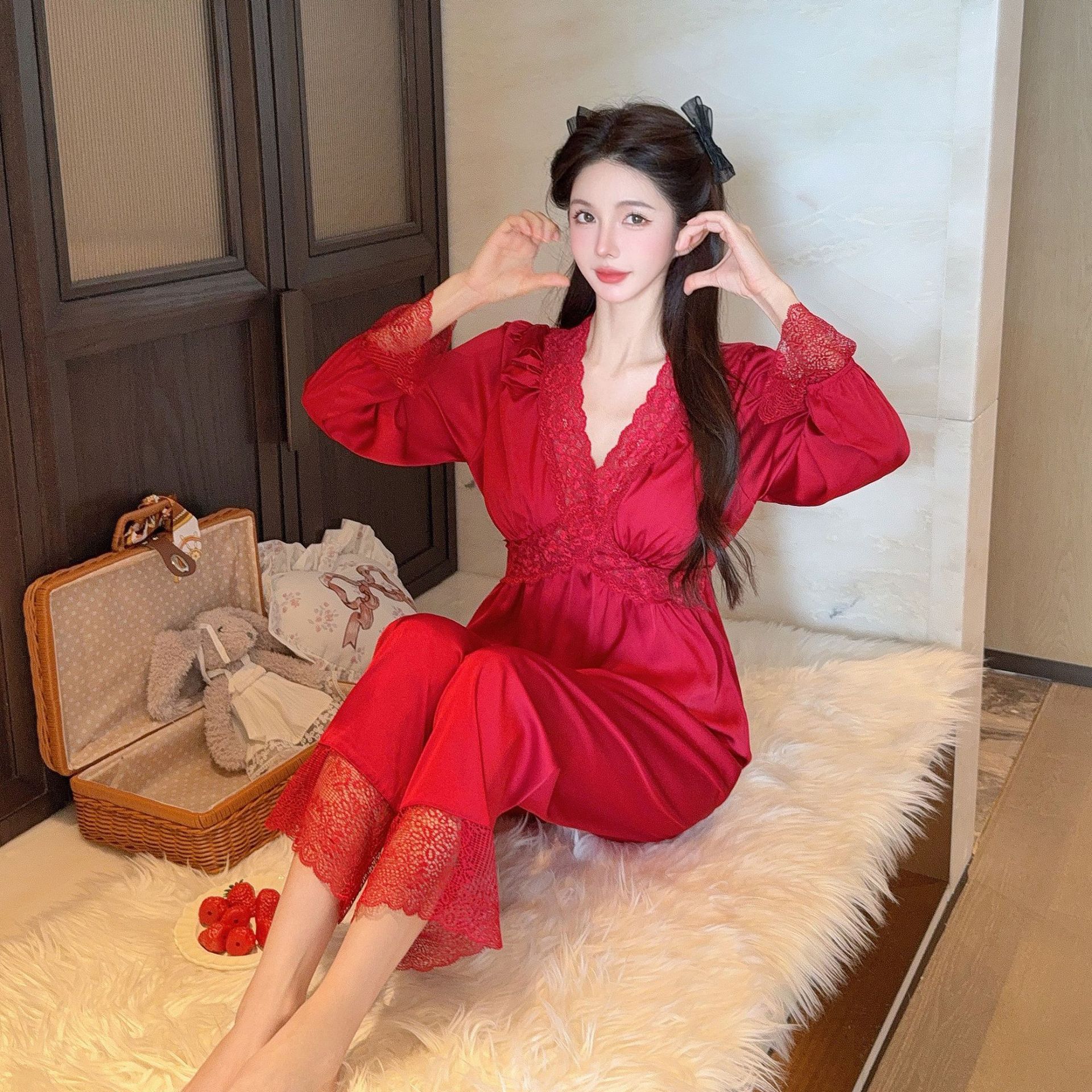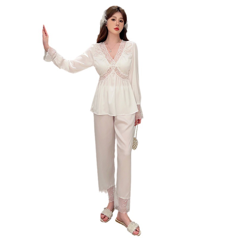 가을 신상 긴팔 잠옷 세트 투피스 심플 레이스 프렌치 스타일 실키 홈웨어 여성용