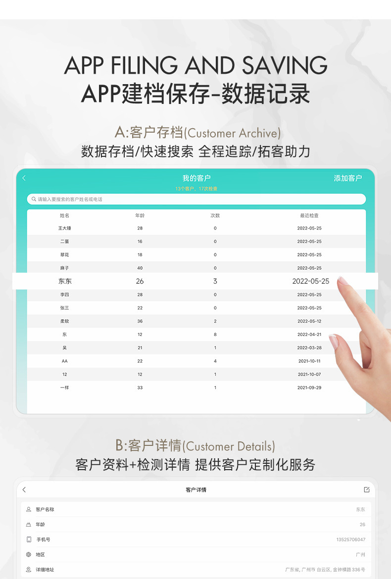 무선 두피 피부 탐지기 보관 및 기록 고객 정보 휴대용 모낭 피부 탐지기 헤어 케어 센터