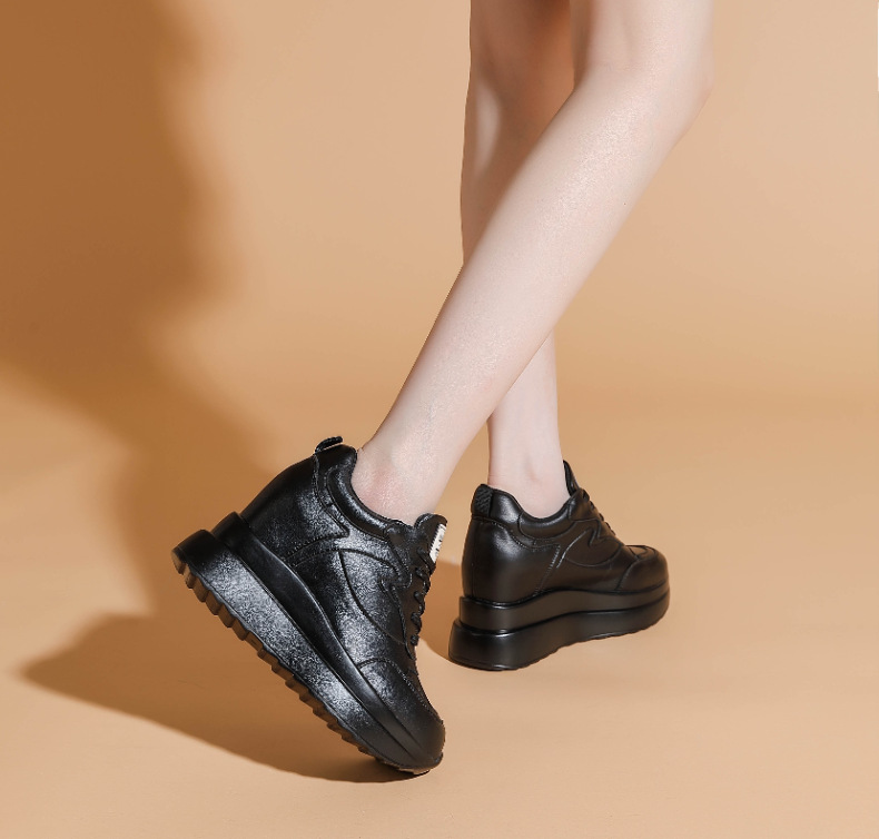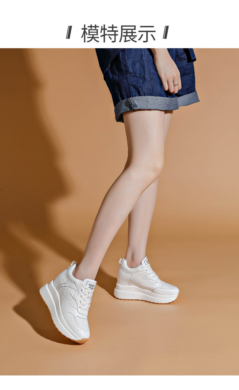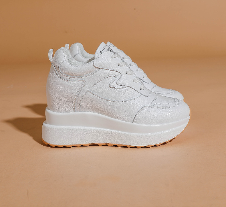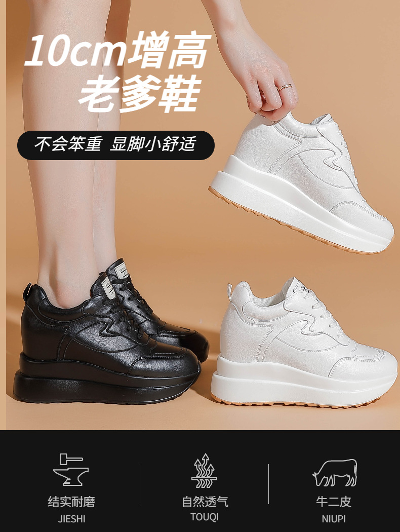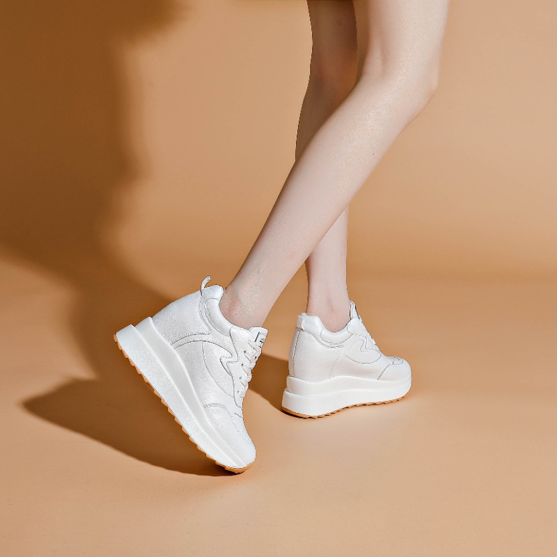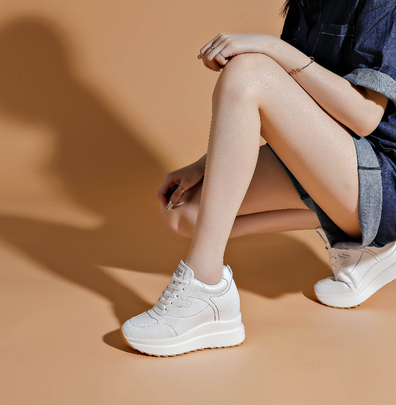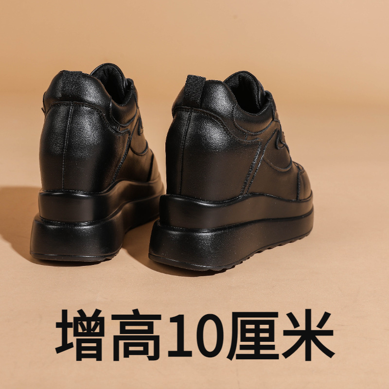 10cm 내부 높이 여성용 싱글 레이어 신발 두꺼운 밑창 머핀 작은 4 계절 신발 가을과 겨울을 위한 천연 가죽 모든 매치 캐주얼 흰색 신발