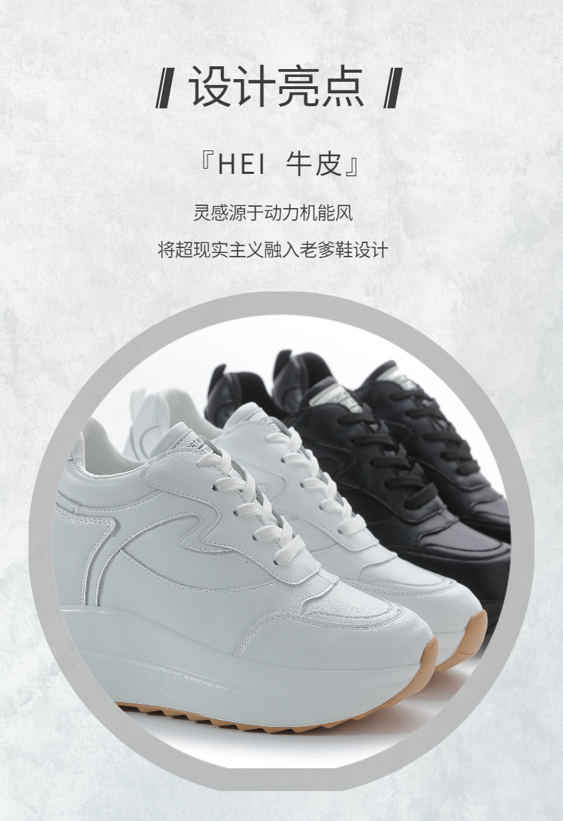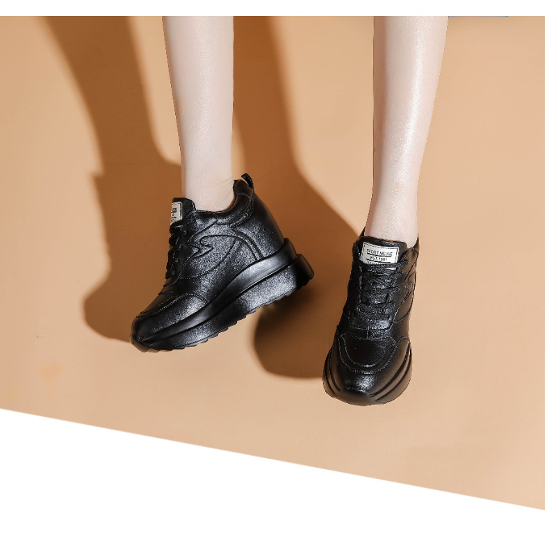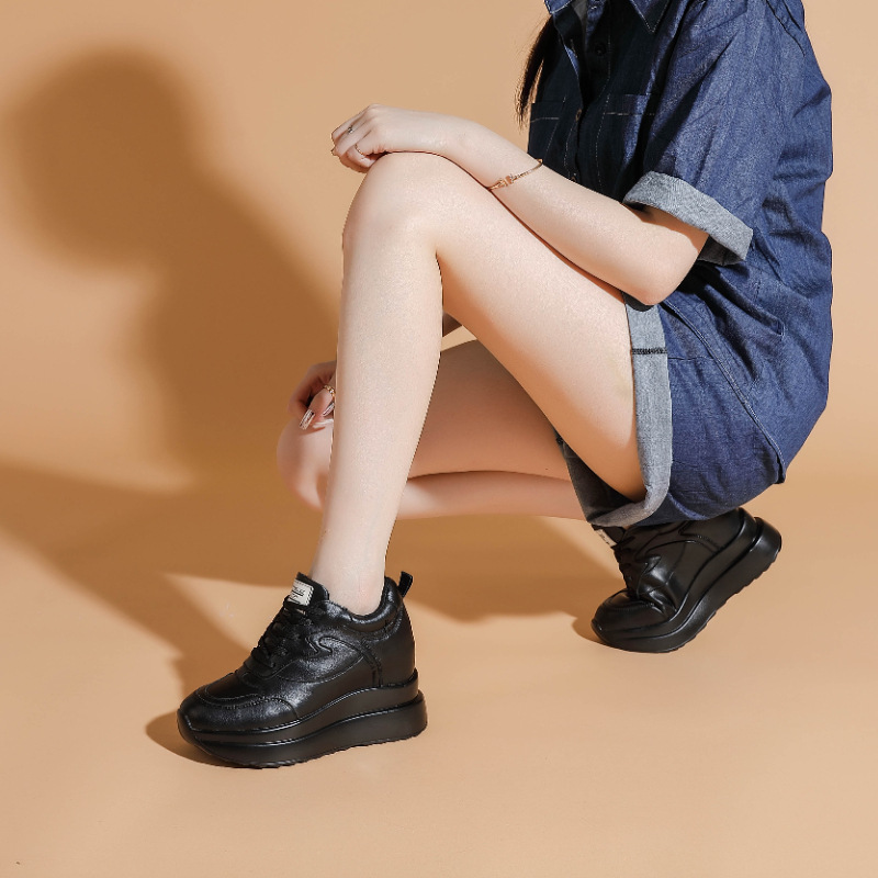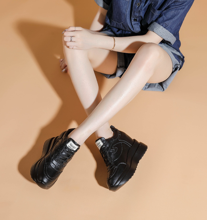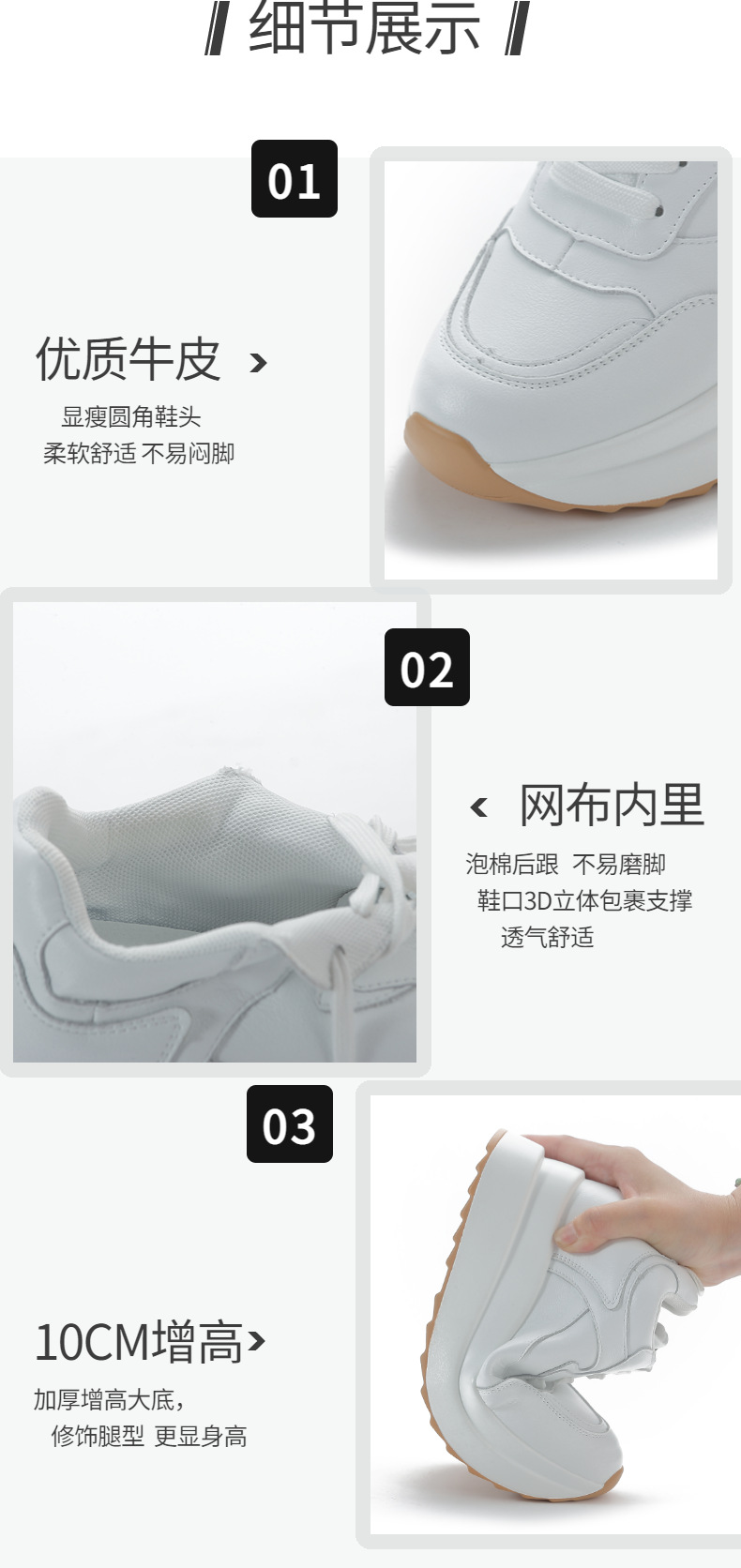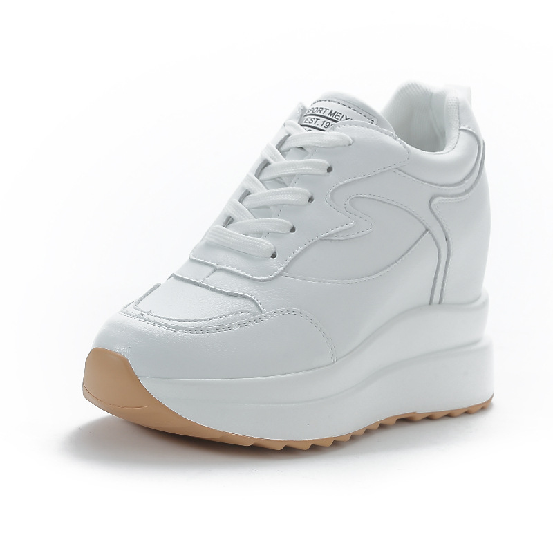 10cm 내부 높이 여성용 싱글 레이어 신발 두꺼운 밑창 머핀 작은 4 계절 신발 가을과 겨울을 위한 천연 가죽 모든 매치 캐주얼 흰색 신발
