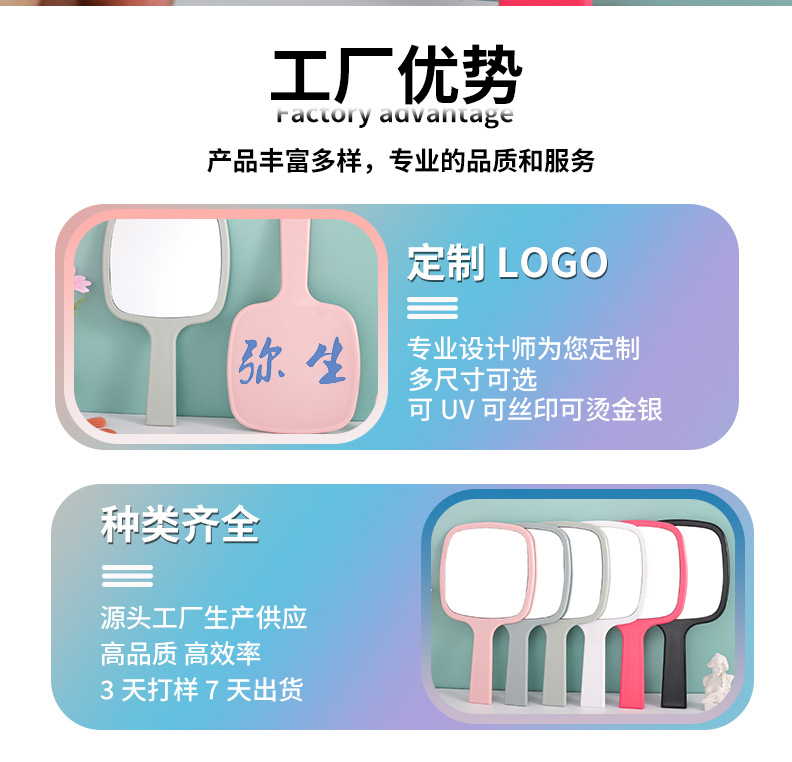 我们是专业的手持化妆镜生产工厂,支持开模定制,颜色,材质,印刷logo,可以免费打样,打样最快24小时出样