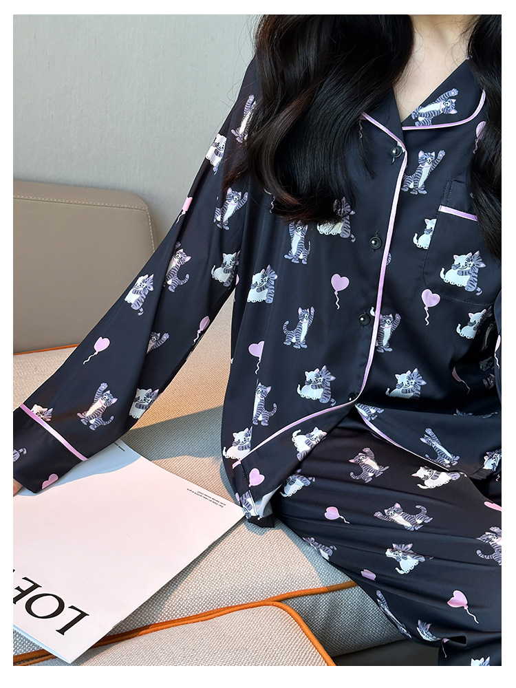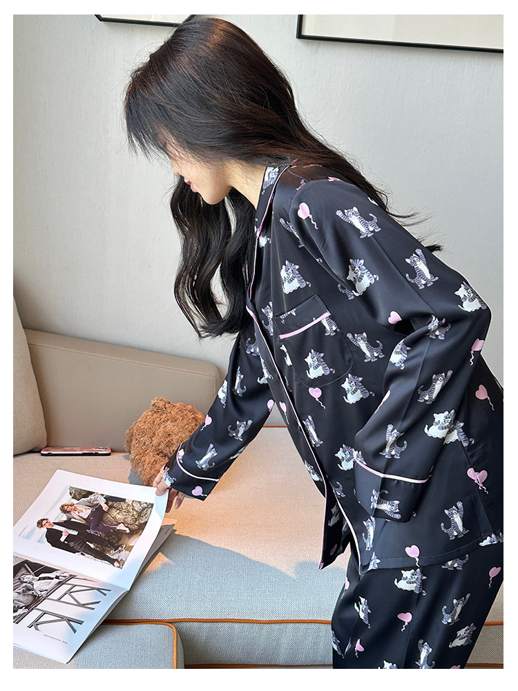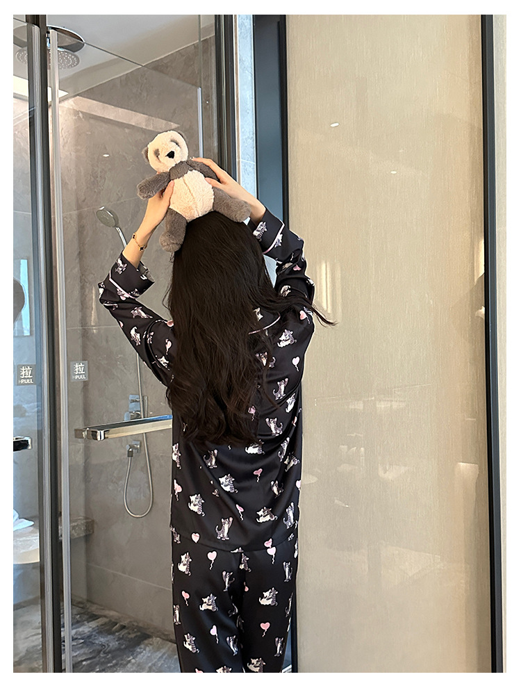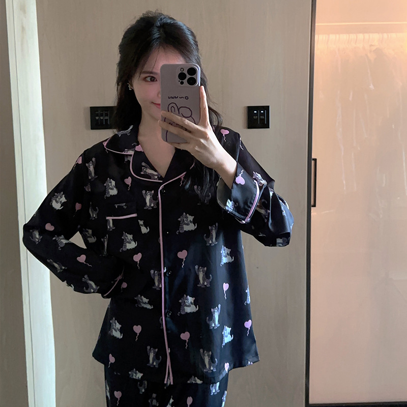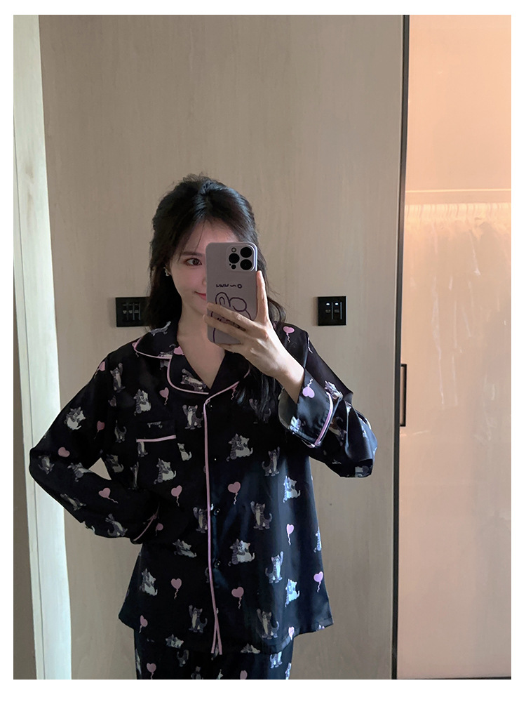 [고양이 파티] 한국의 귀여운 고양이 블랙 잠옷 아이스 실크 긴팔 봄과 가을 얇은 고급 가정 옷