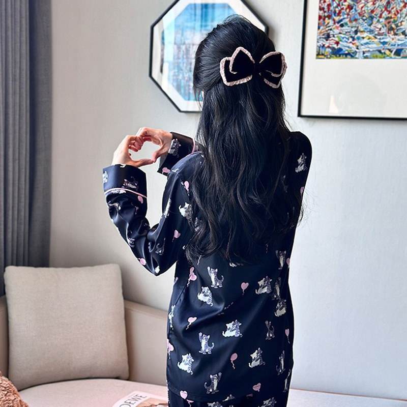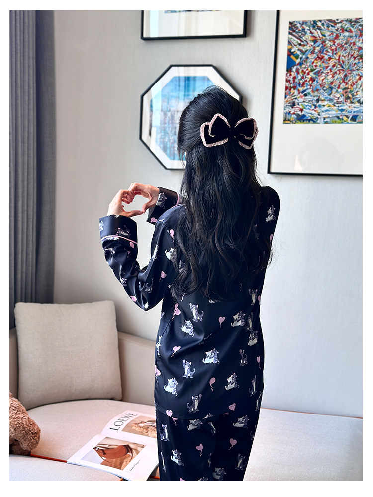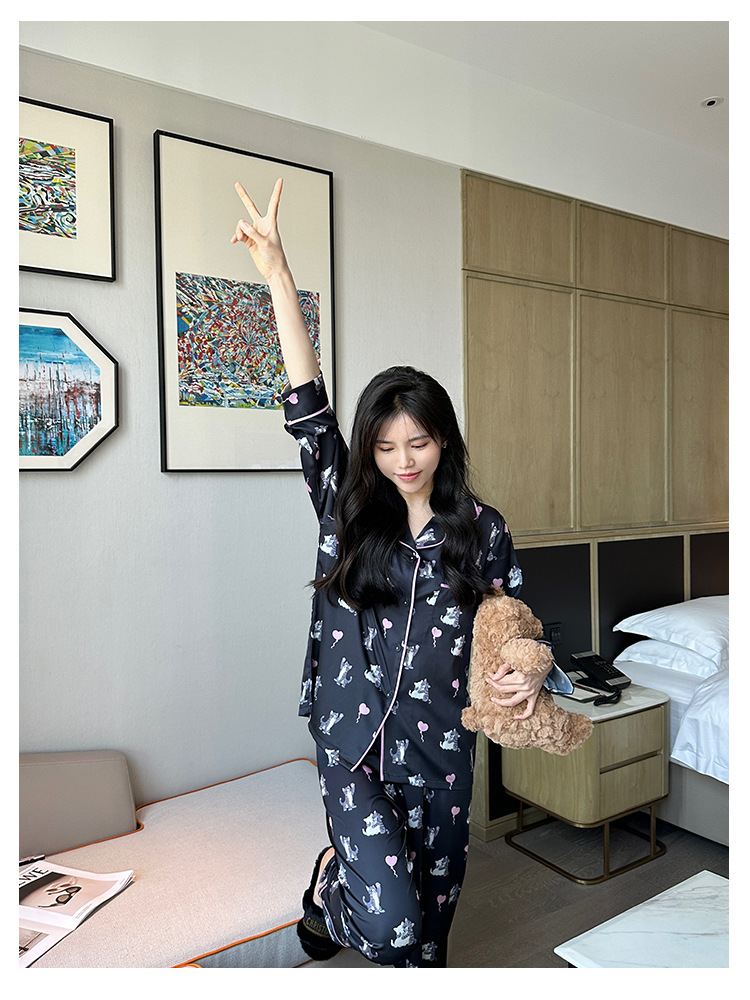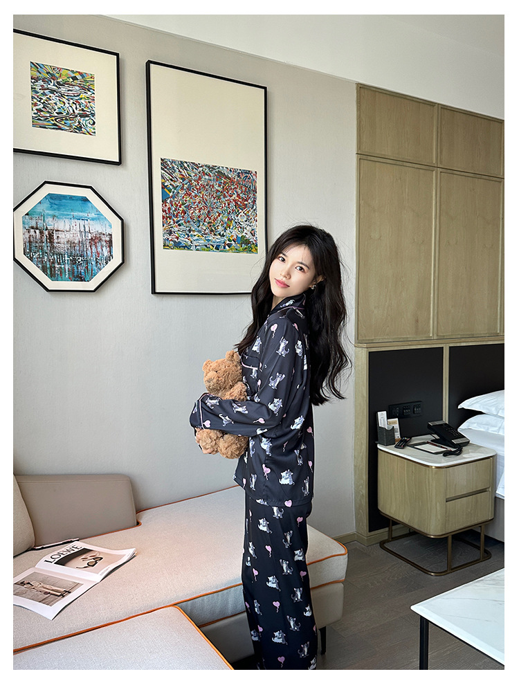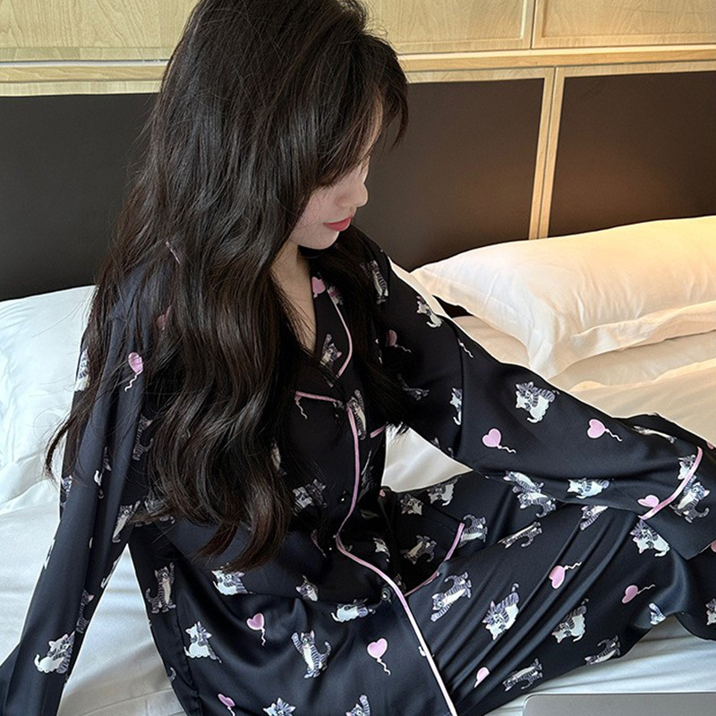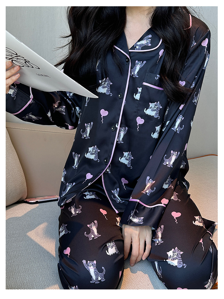 [고양이 파티] 한국의 귀여운 고양이 블랙 잠옷 아이스 실크 긴팔 봄과 가을 얇은 고급 가정 옷