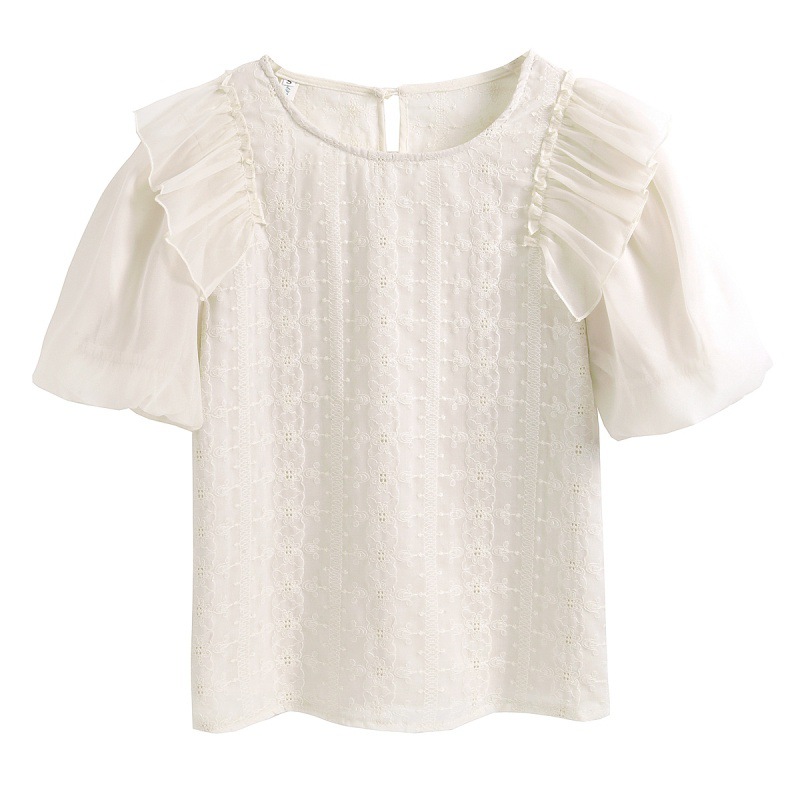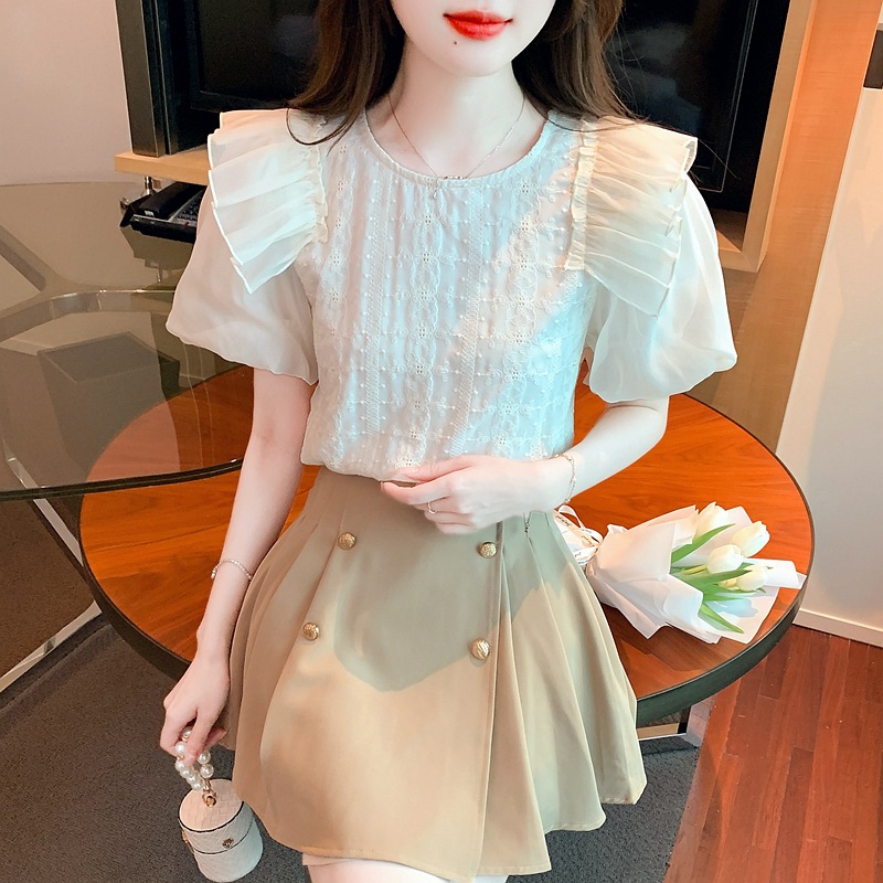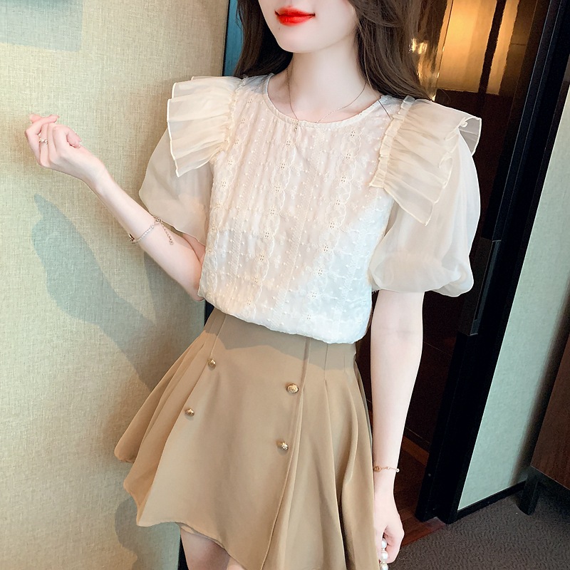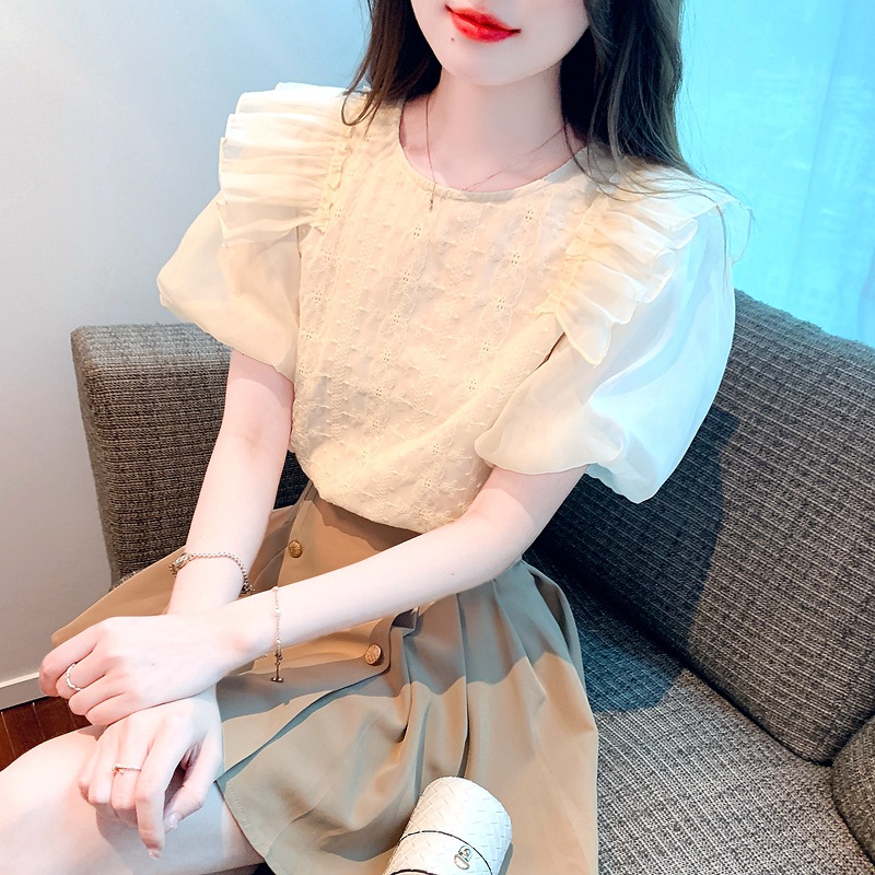 쉬폰 반팔 셔츠 여성용 여름 디자인 센스 러플 스티치 퍼프 슬리브 탑 프랑스 스타일리스트 셔츠