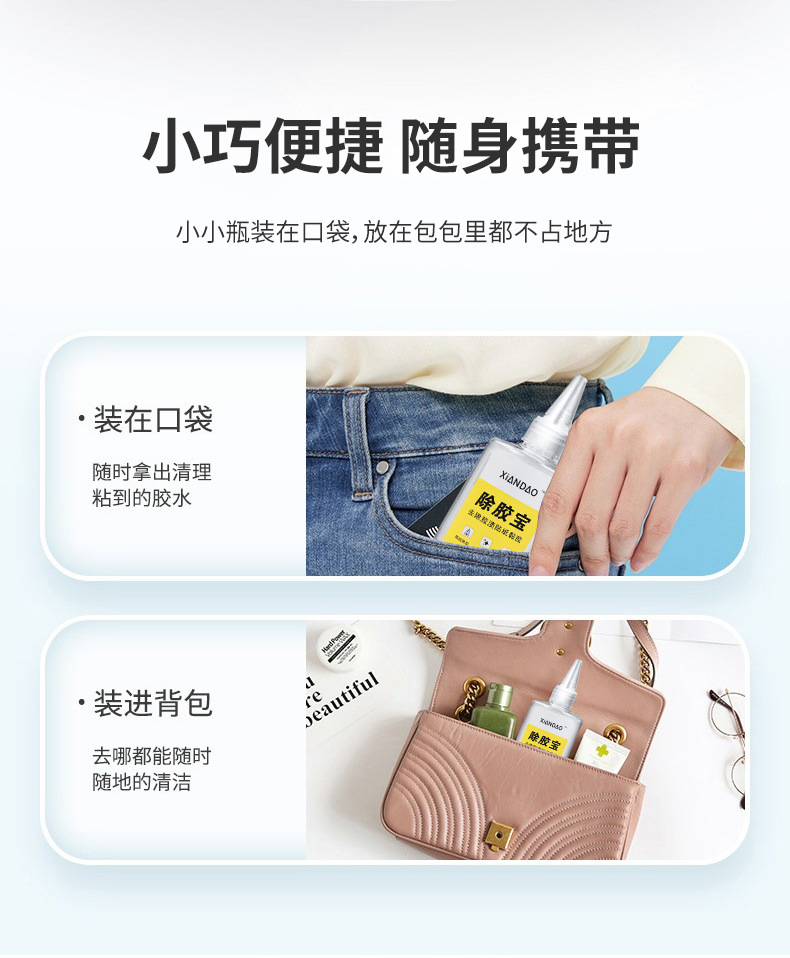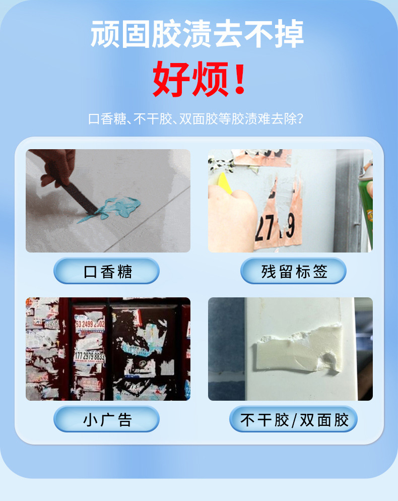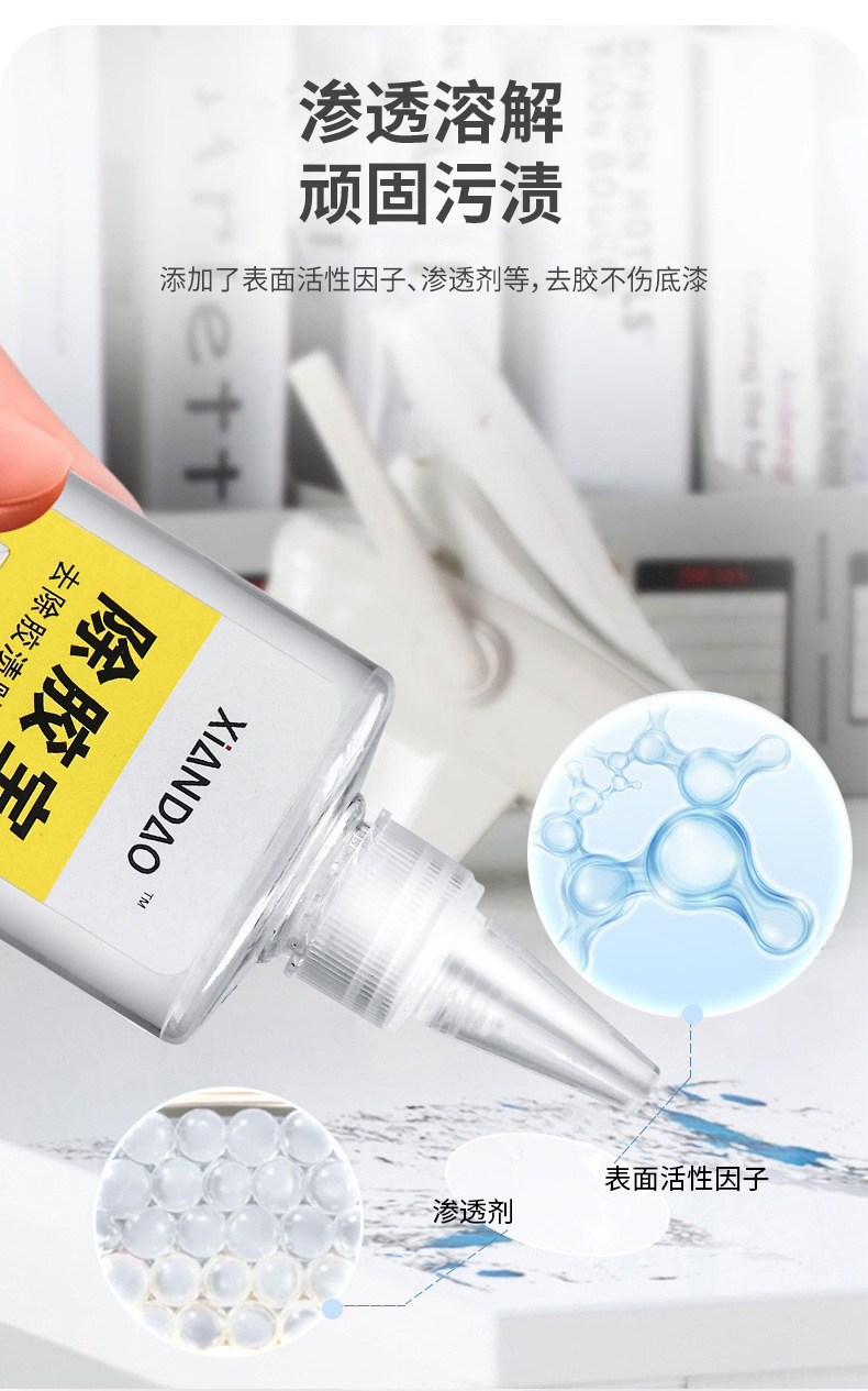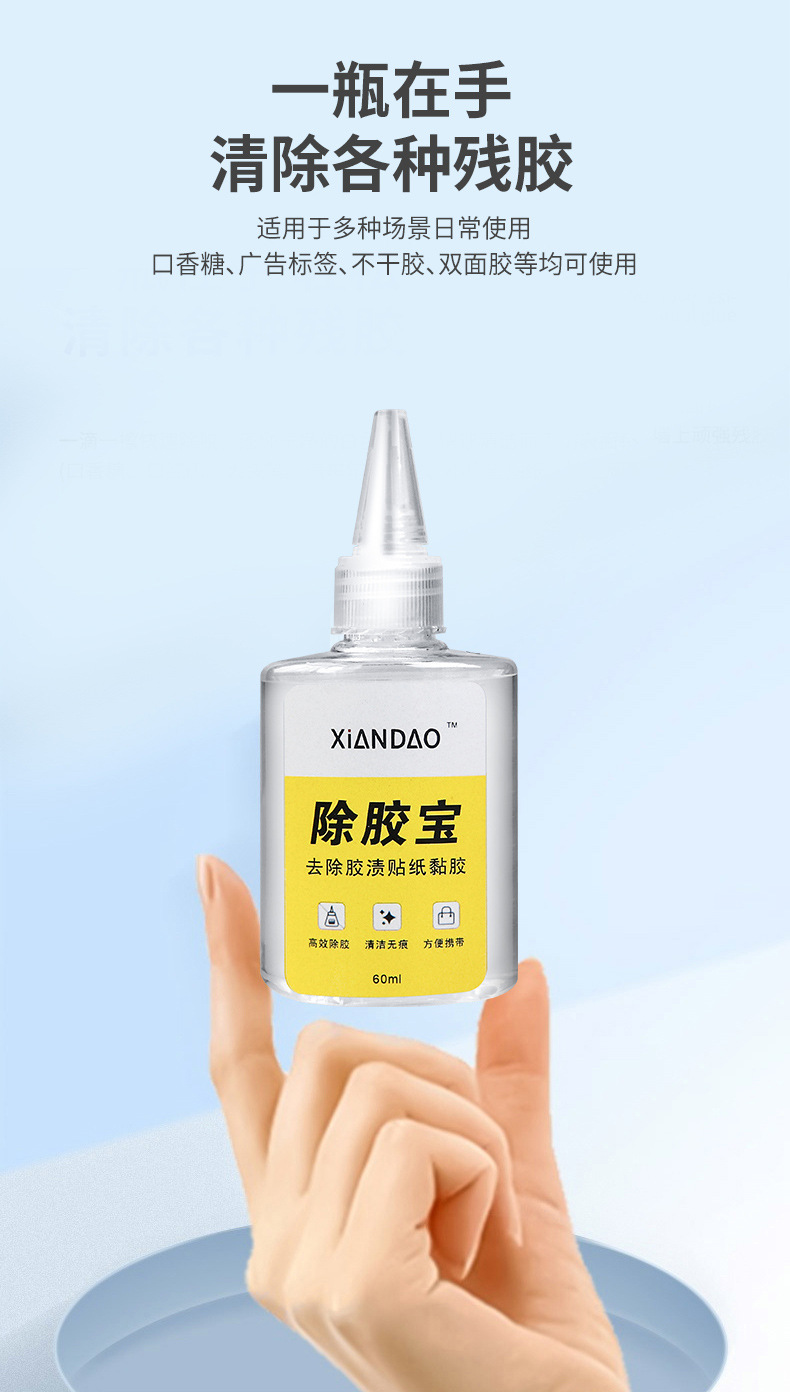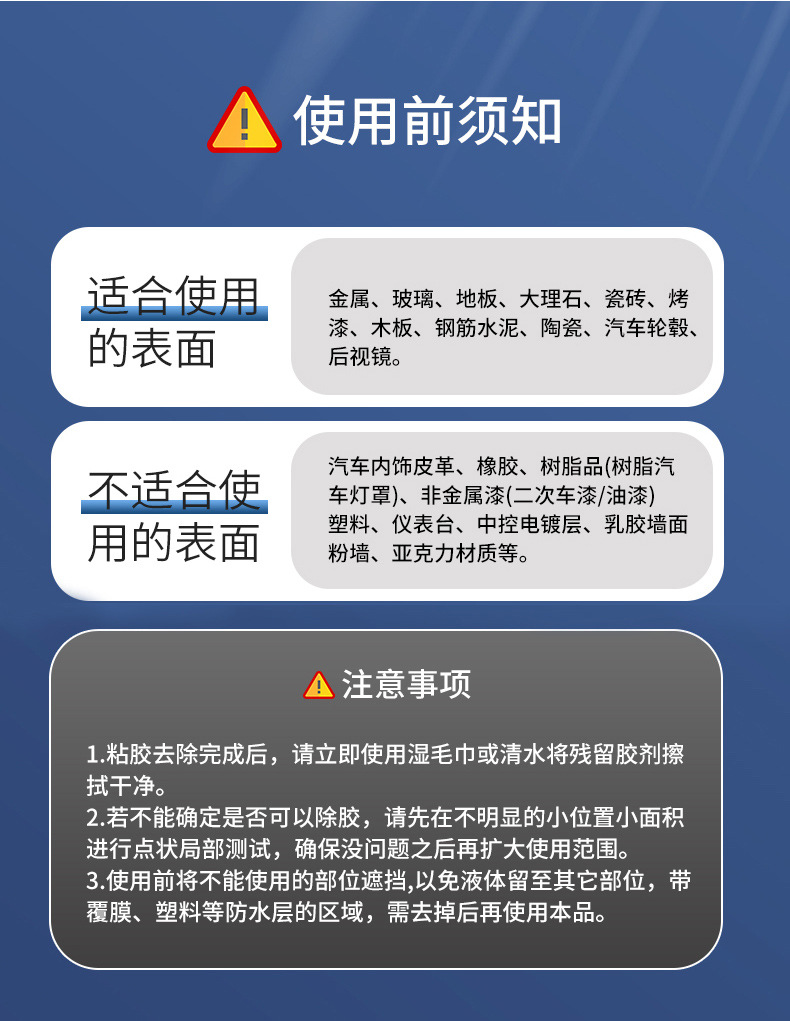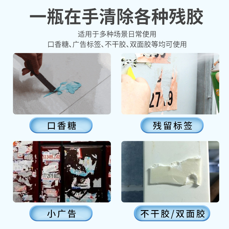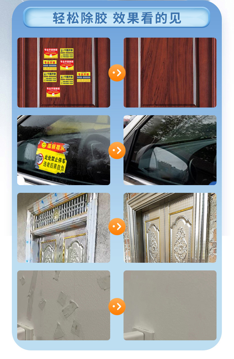 【使用方法】:滴落在需要除胶的表面,等待30秒浸透溶解后,使用小刮板刮掉