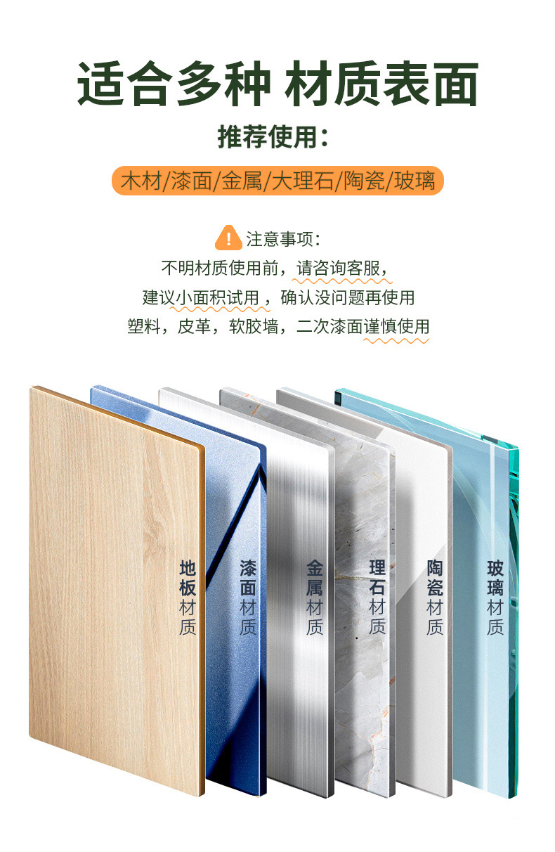 【适用表面】:木材/漆面/金属/大理石/陶瓷/玻璃