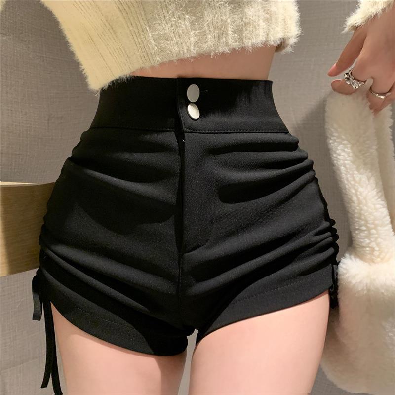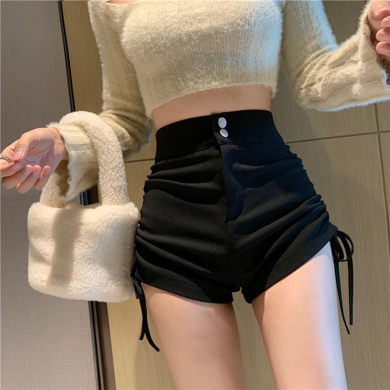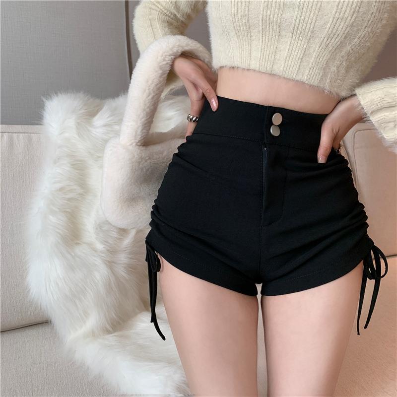 블랙 하의 반바지 여성용 봄과 여름 새로운 스트레치 슬림 핏 슬리밍 졸라매는 끈 주름 A 라인 와이드 레그 팬츠 겉옷 용 핫 팬츠