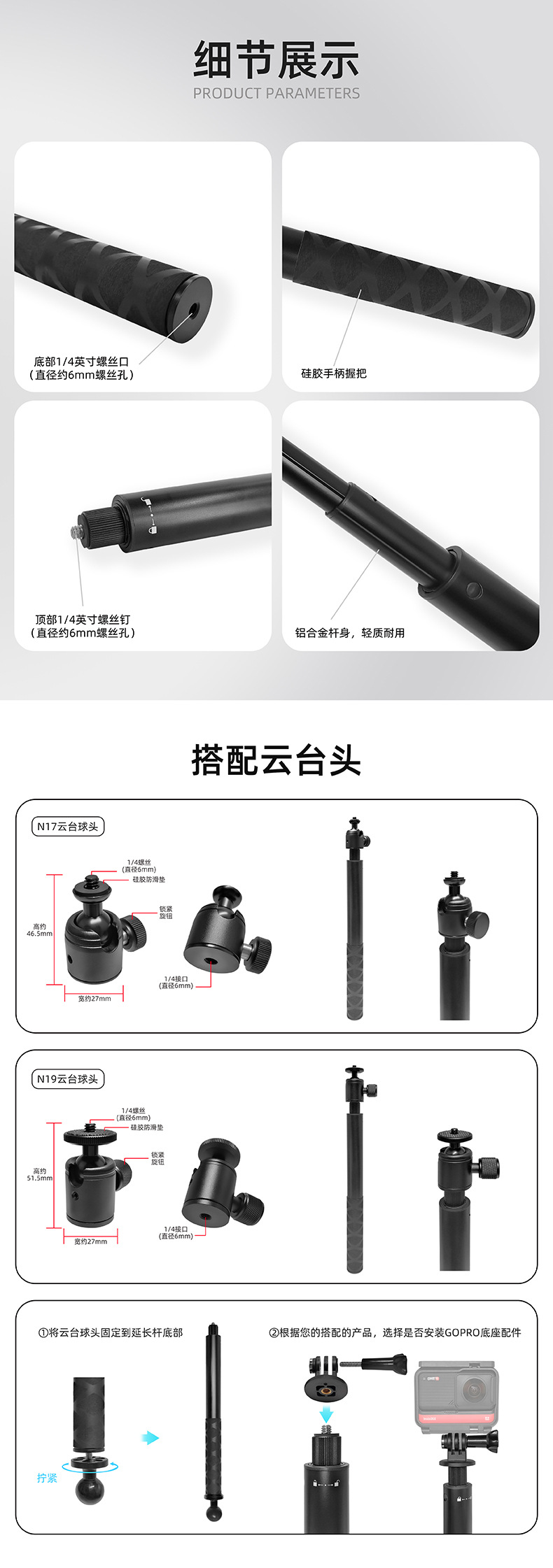 N19 팬/틸트가있는 1.1 m 연장봉 (멀티 포지션 촬영 세트 브래킷 설치)
