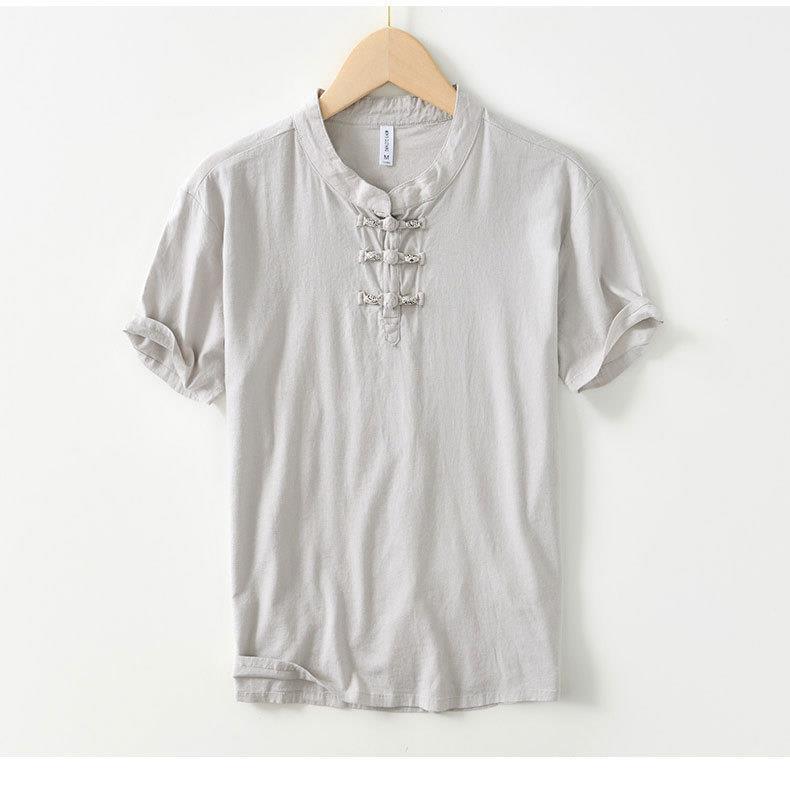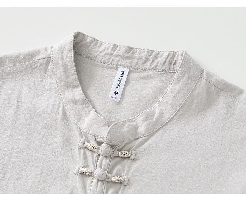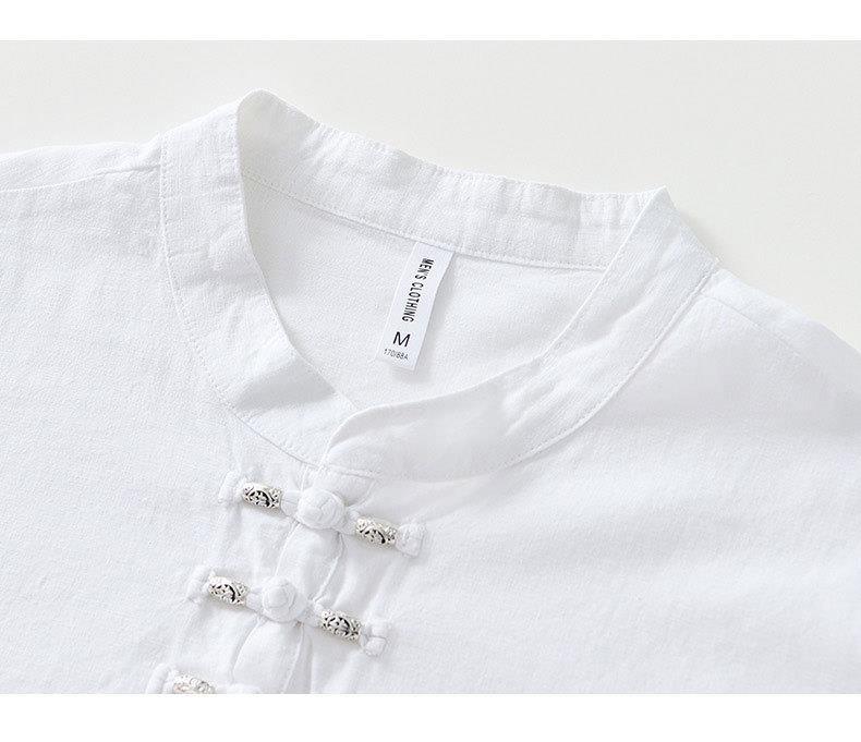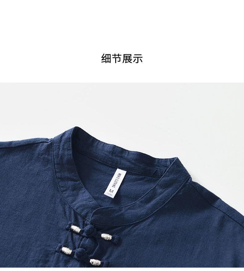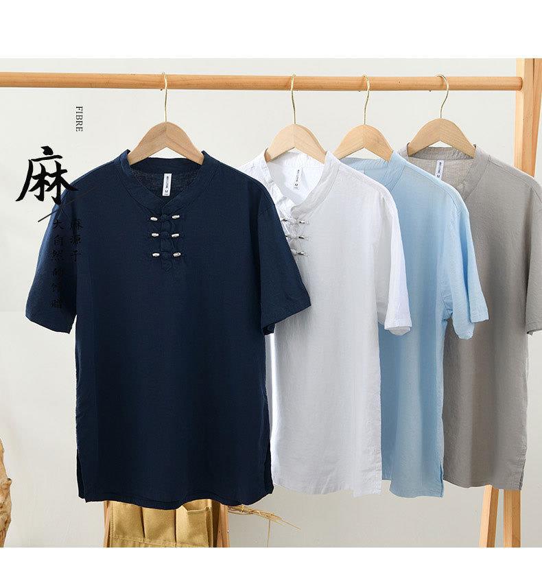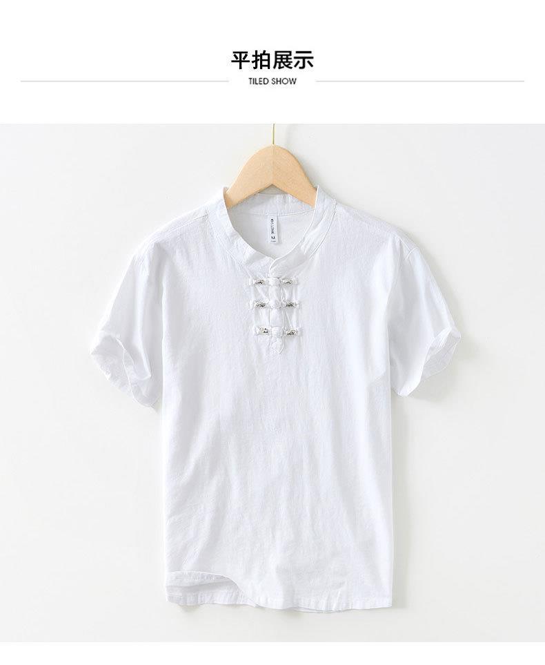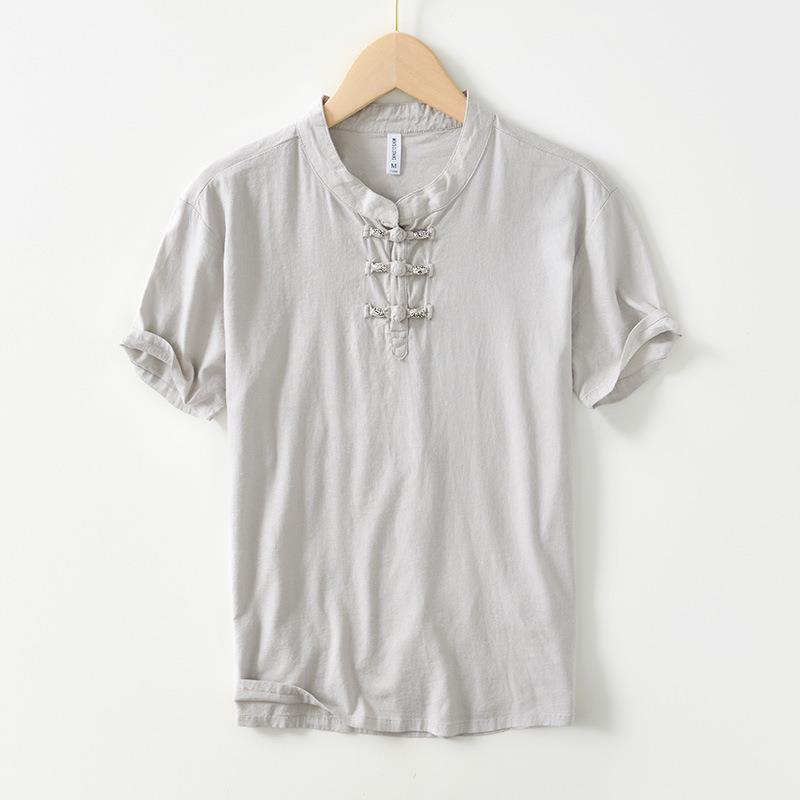 L986 중국식 행운의 단어 구슬 버클 캐주얼 반팔 티셔츠 남성 캐주얼 단색 린넨 재킷 머리카락의 세대